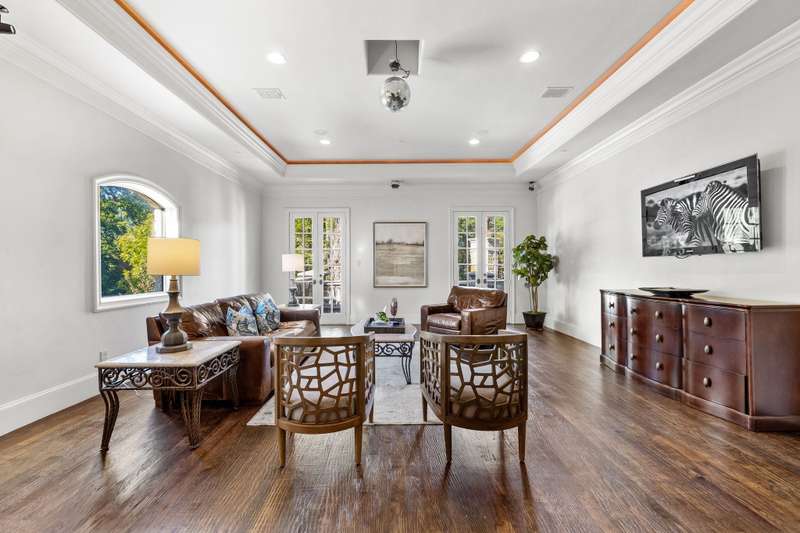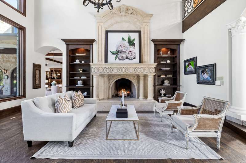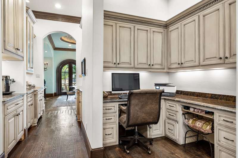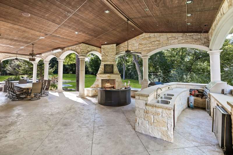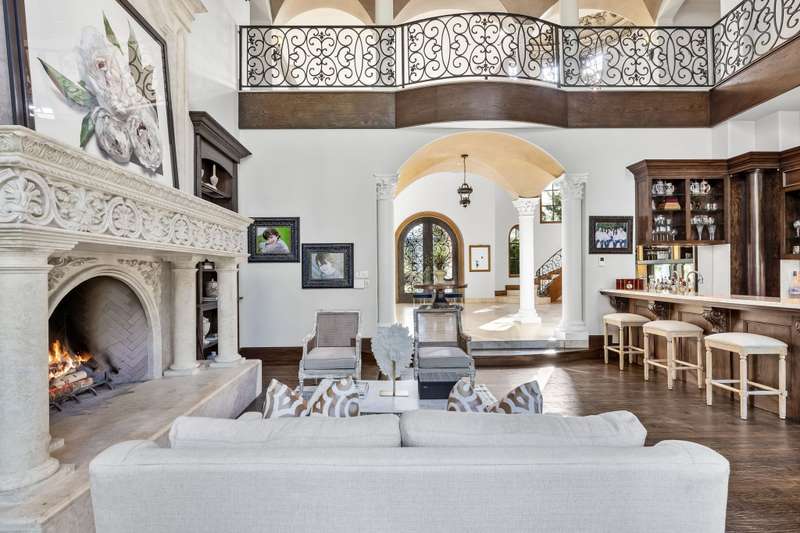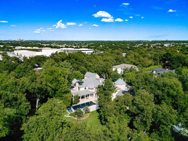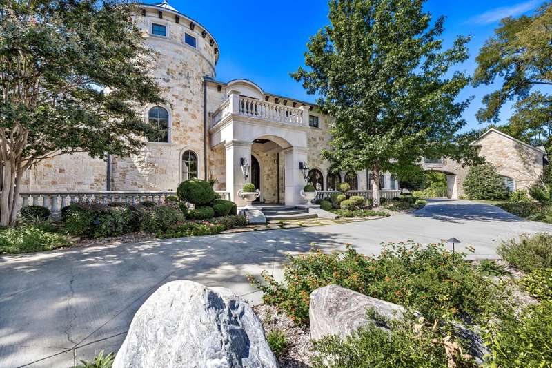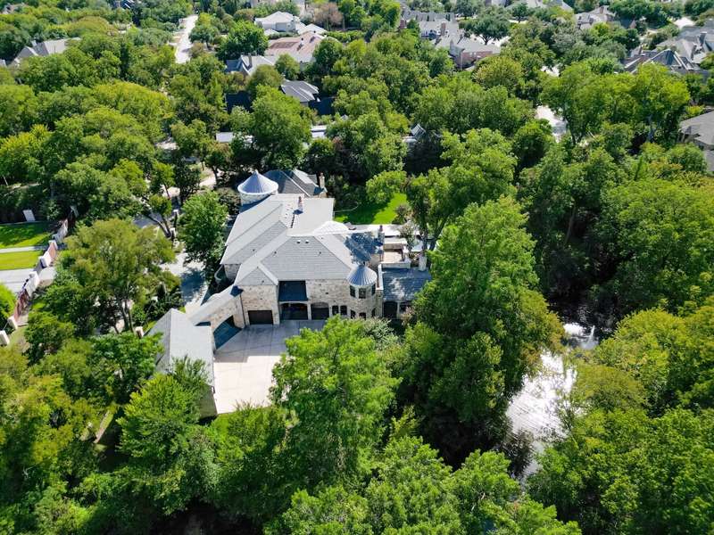 Majestic luxury in cul-de-sac home full of custom features, including private pond & fountain, energy-efficient features, elevator, and custom design touches. Grand entry wows with dramatic iron staircase and vaulted ceilings that show off gold inlay turret with chandelier. Huge dining room with French doors to front veranda, custom ceiling mural, and access to 750-btl temp-controlled wine room. Formal living features floor-to-ceiling UV-protected windows overlooking outdoor retreat, Isokern fireplace, and onyx-topped bar with 2 Uline fridges. Expansive gourmet kitchen includes 2 Bosch dishwashers, Viking 6-burner gas cooktop, double ovens, warming drawer, & massive island. Oversize walk-in pantry offers 2nd built-in fridge and extra storage. Stylish study has French doors to front patio and hidden room used as storm shelter. Primary suite feels like a luxury hotel, with imported wood doors from Bali, coffee bar & refrigerator, and elegant fireplace in sitting area. Spa-like primary bath with exquisite hand-carved marble tub, walk-in shower with dual heads, dual vanities, heated travertine flooring, and walk-in closet with island. Expansive game room offers space for pool table or gaming, with access to large balcony overlooking lush outdoors. Theatre includes ample seating and refrigerator for movie nights. Spacious exercise room fits machines & weights with access to steam shower bathroom. Secondary bedrooms have full baths & walk-in closets, and can be extra office or craft space. Expansive covered patio is ideal outdoor living, with built-in kitchen, fireplace, misting & mosquito systems, and room for seating & dining. Exquisite heated pool overlooks verdant yard with firepit, private pond, and fountain. Additional features include Infinity Carrier HVAC system, gated driveway & sport court, and upstairs 2nd laundry room. Close proximity to top-tier dining, entertainment, and golf courses. Conveniently located to Dallas top private and collegiate prep schools.