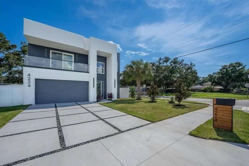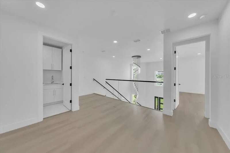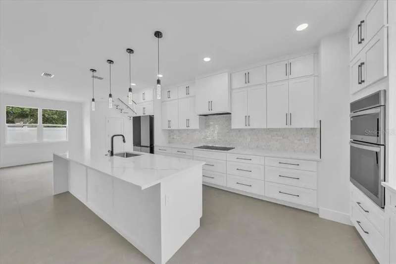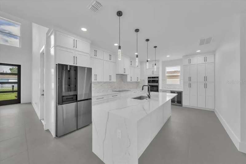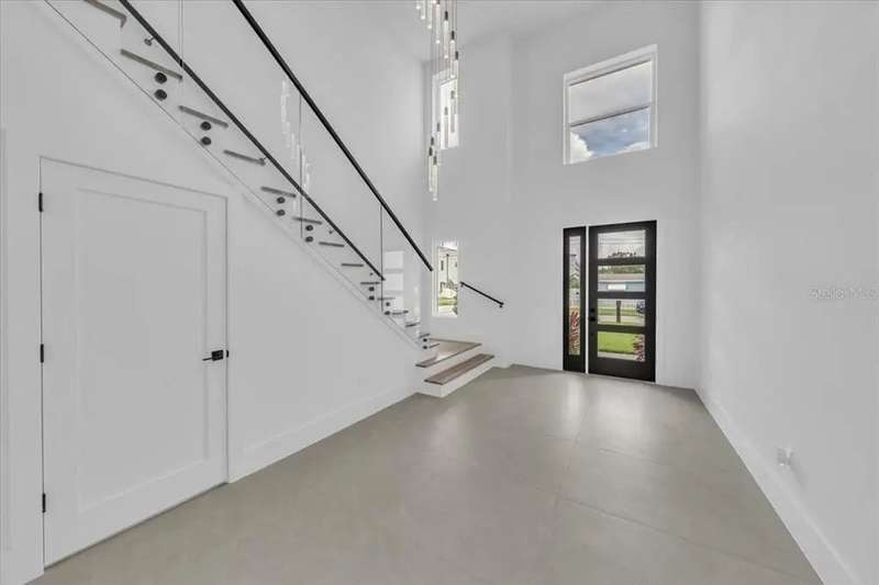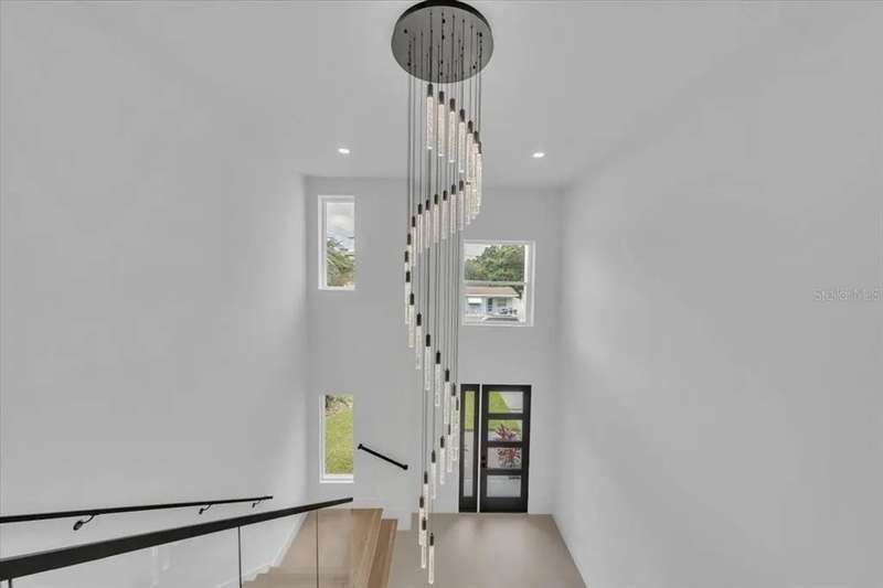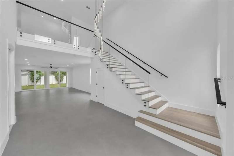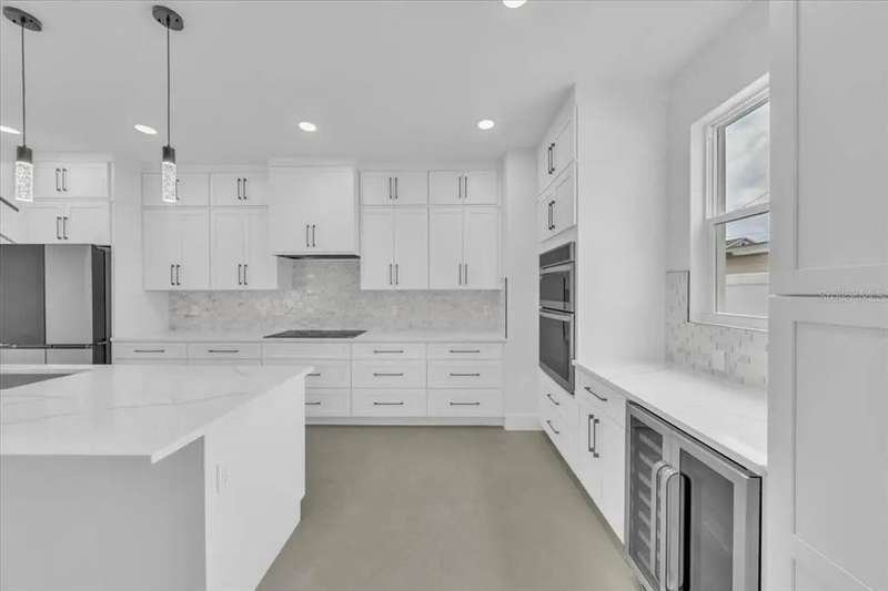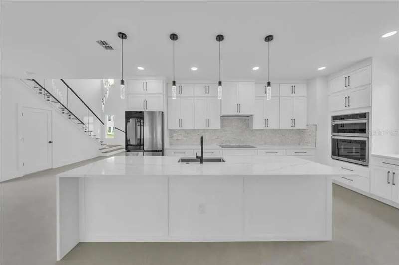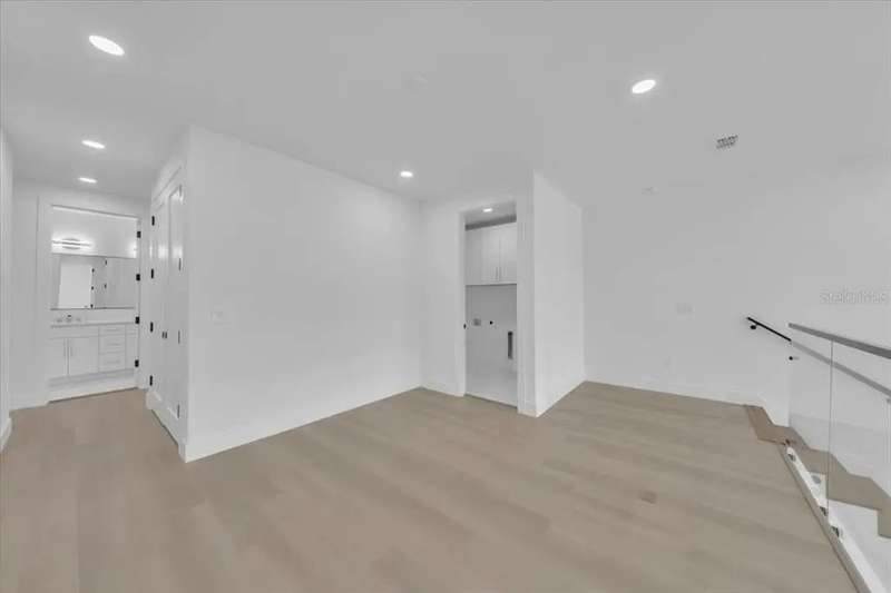 One or more photo(s) has been virtually staged. Introducing a striking new-construction contemporary residence designed for modern living and entertaining. The home opens with an impressive 18-foot foyer crowned by a cascading chandelier, setting an elegant tone throughout. An expansive great room and adjoining dining area flow seamlessly to the chef’s kitchen, appointed with white cabinetry to the ceiling, state-of-the-art appliances, and a 12-foot waterfall-edge center island with ample seating. A striking backsplash complements the premium countertops, and a dedicated wine and beverage refrigerator adds a refined finishing touch. The main floor also includes a convenient powder room and a flexible bedroom suite—ideal as a guest room or a first-floor primary—with a generous ensuite featuring a double vanity and glass-enclosed shower and walk-in closet. A stunning glass-clad staircase leads to the open loft upstairs. The second level houses two additional bedrooms that share a well-appointed bathroom with double vanity, a spacious laundry room, and a lovely primary suite with private balcony. The primary bathroom is a spa-like retreat with double vanities, contemporary lighting, a glass- enclosed shower with a linear drain and rain showerhead, plus a freestanding tub framed by a warm wood accent wall. This exceptional home blends contemporary design, high-end finishes, and thoughtful functionality—everything you’ve been looking for and ready for you to call it home.
