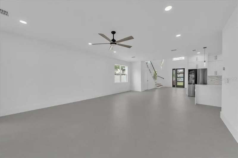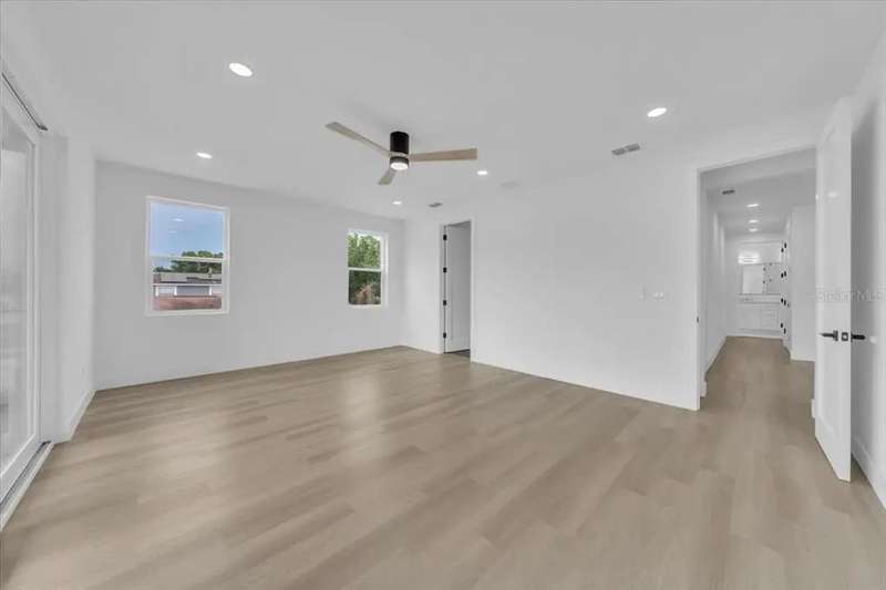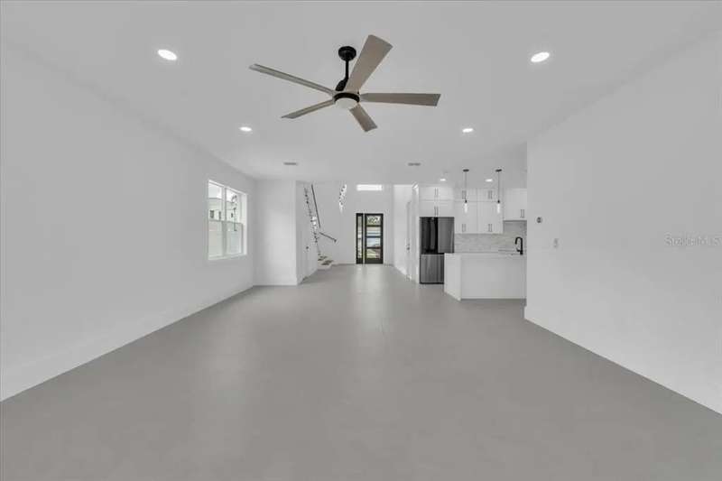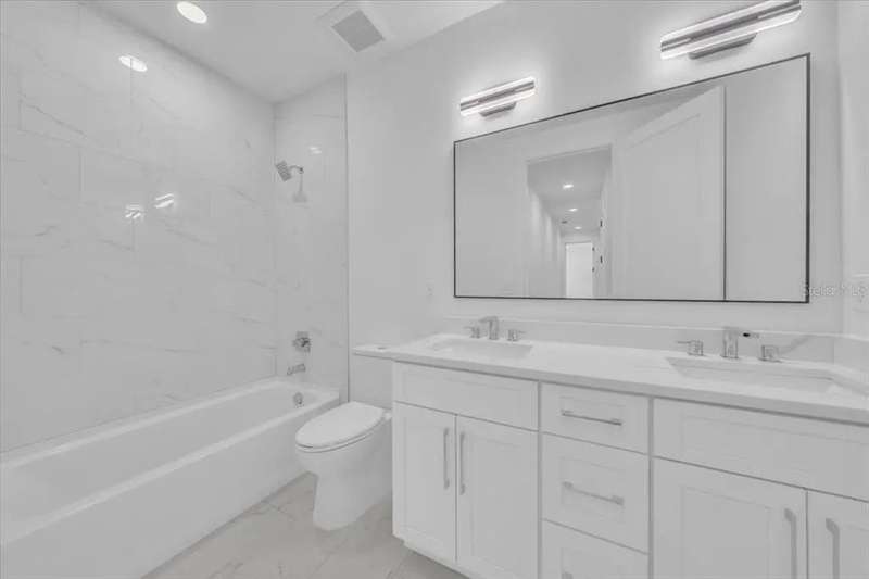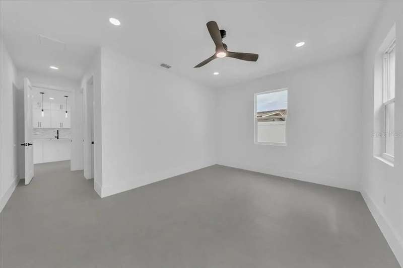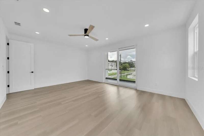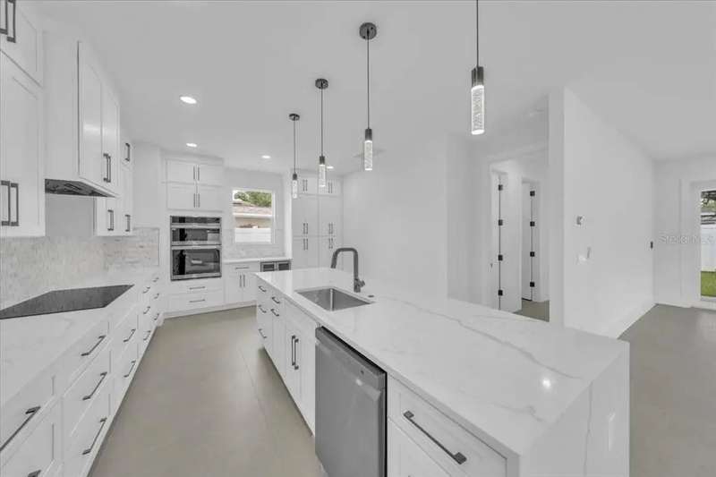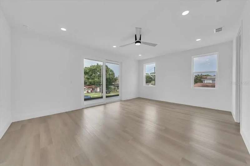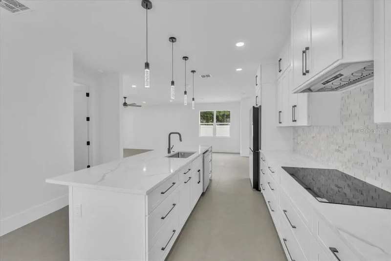One or more photo(s) has been virtually staged. Introducing a striking new-construction contemporary residence designed for modern living and entertaining. The home opens with an impressive 18-foot foyer crowned by a cascading chandelier, setting an elegant tone throughout. An expansive great room and adjoining dining area flow seamlessly to the chef’s kitchen, appointed with white cabinetry to the ceiling, state-of-the-art appliances, and a 12-foot waterfall-edge center island with ample seating. A striking backsplash complements the premium countertops, and a dedicated wine and beverage refrigerator adds a refined finishing touch. The main floor also includes a convenient powder room and a flexible bedroom suite—ideal as a guest room or a first-floor primary—with a generous ensuite featuring a double vanity and glass-enclosed shower and walk-in closet. A stunning glass-clad staircase leads to the open loft upstairs. The second level houses two additional bedrooms that share a well-appointed bathroom with double vanity, a spacious laundry room, and a lovely primary suite with private balcony. The primary bathroom is a spa-like retreat with double vanities, contemporary lighting, a glass- enclosed shower with a linear drain and rain showerhead, plus a freestanding tub framed by a warm wood accent wall. This exceptional home blends contemporary design, high-end finishes, and thoughtful functionality—everything you’ve been looking for and ready for you to call it home.