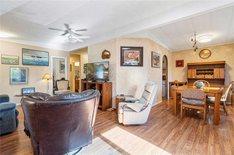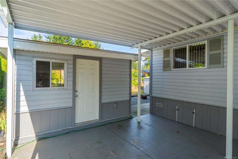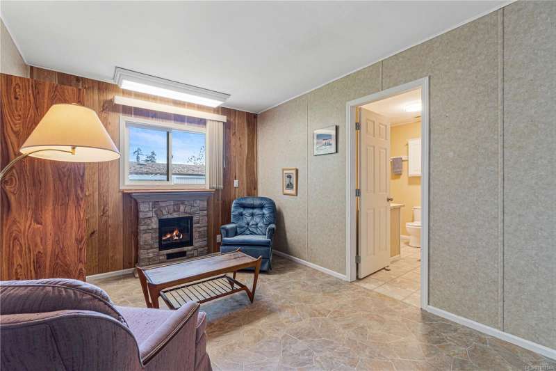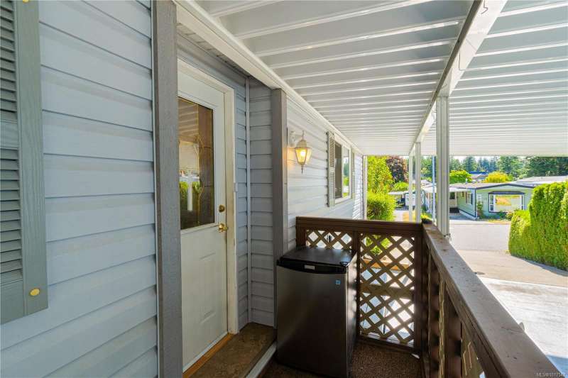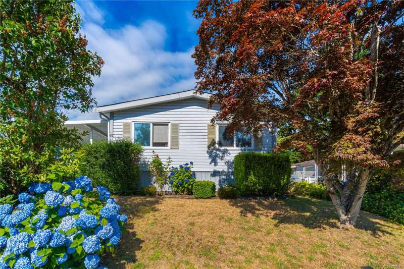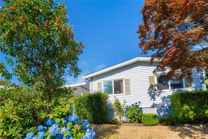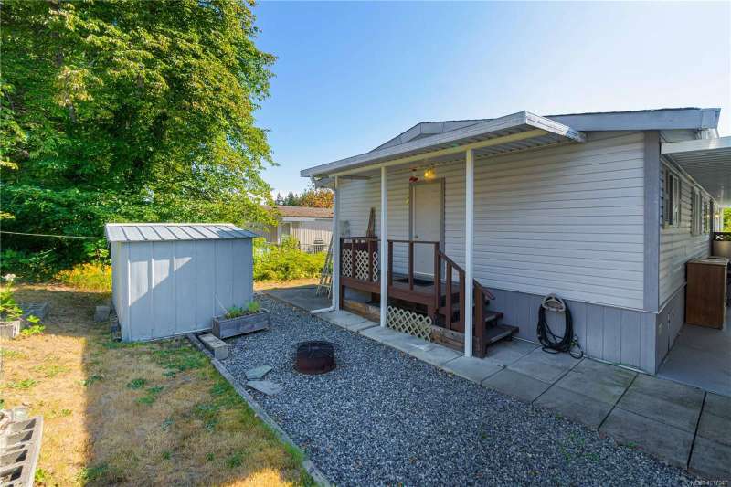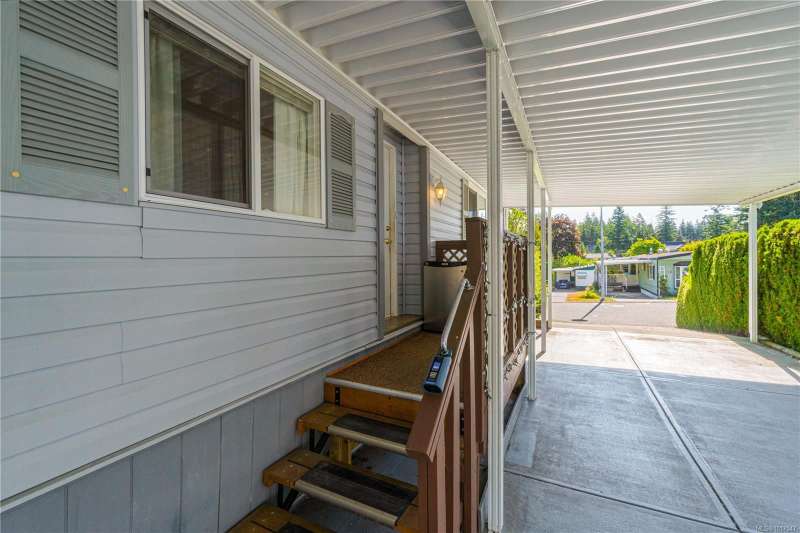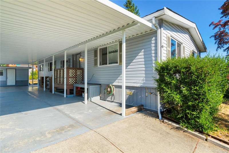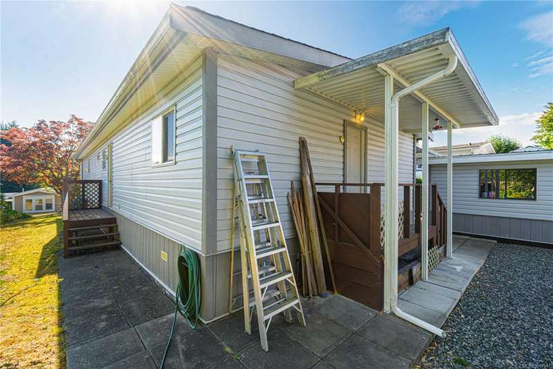 Located in the quiet 55+ park at Dogwood Village just off Labieux Rd in Nanaimo is this spacious double wide home. This property has a cozy living room and dining room, ideal for having guests over. A large kitchen with stainless steel appliances has a ton of storage space. The primary bedroom has a huge ensuite and leads into a second living space or den. This area makes a great space for an office or watching your favourite shows in front of the electric fireplace. A second bedroom, a 4 piece bathroom and a great sized laundry room also add to the charm of this home. You will stay extra cool in the summer thanks to the covered carport. With ample room for parking, there is also a workshop and storage shed. Enjoy gardening in your private back yard! Located just minutes from Country Club mall, bus routes, and much more!