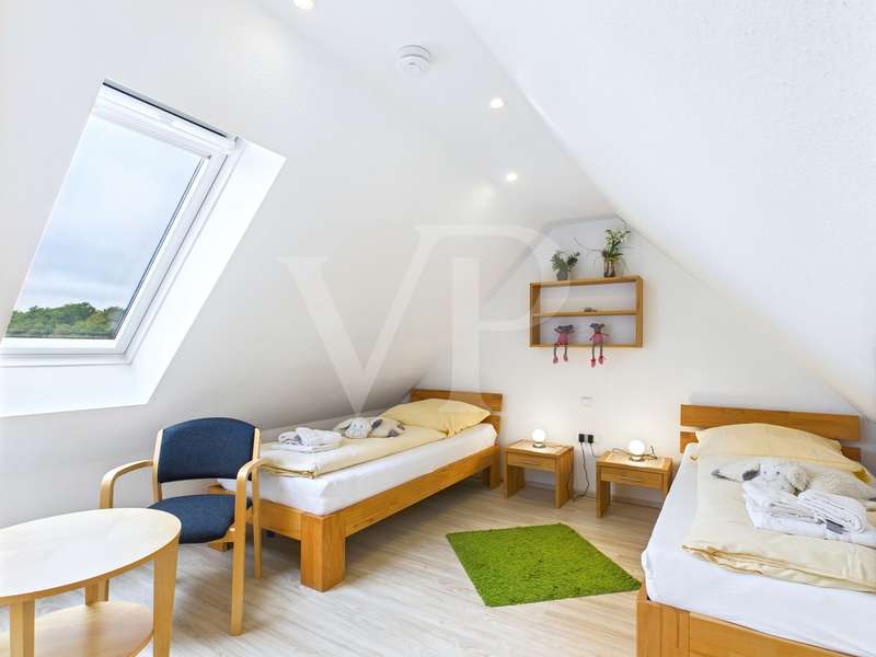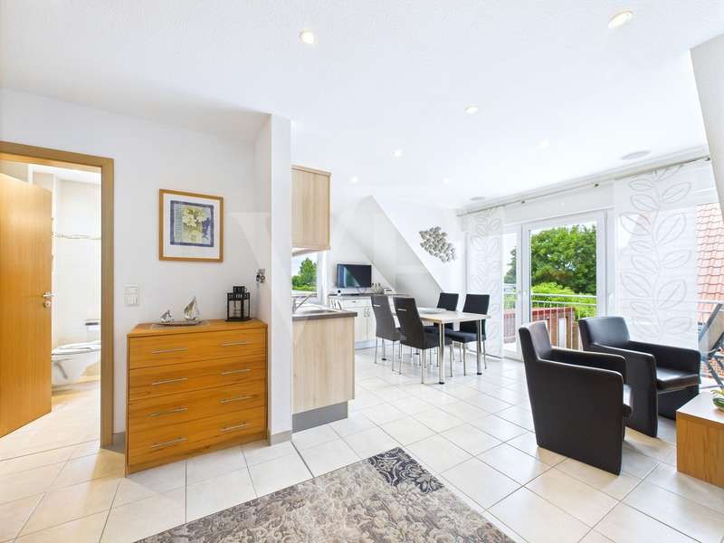 For sale is a modern top-floor apartment with a living space of approx. 47 m², which is characterized by its well thought-out room layout and comprehensive furnishings. The apartment was built in 2012 and is located in a modern residential complex. The apartment offers a total of 2.5 rooms, including two spacious bedrooms and a modern bathroom. The bathroom is equipped with a walk-in shower, ceiling-high tiled walls and a towel radiator. It therefore offers both functional and stylish furnishings. The kitchen is integrated into the living area and has a modern fitted kitchen with a dishwasher, which is included in the purchase price. The apartment will be handed over furnished, with some solid wood furniture providing a pleasant living atmosphere. Particular emphasis was placed on energy efficiency: The apartment has triple-glazed windows and electric external blinds. There are also pleated blinds in some areas, which provide optimum privacy. Underfloor heating provides cozy warmth throughout the apartment. Another highlight of the apartment is the south-west-facing balcony, which offers additional outdoor living space and invites you to use the communal garden. The garden area has been modernized with new garden sheds. The converted attic is accessible via a modern solid wood staircase and includes the second bedroom. A storage room with washing machine and a parking space also belong to the property. SAT reception completes the modern facilities. The apartment is in a condition that benefits from ongoing maintenance. The central heating system ensures the economical heating of all units in the building and was recently brought up to the latest state of the art. This property offers excellent quality of life thanks to its well-maintained furnishings and advantageous location. The connection to the public transport network as well as the proximity to shopping and leisure facilities make it particularly attractive for a vacation in the north - it can also be used as a vacation apartment. In other words, a perfect investment property that can also be used as a vacation home. Thanks to its contemporary condition and high-quality furnishings, this apartment is ideal for buyers who value a ready-to-move-in property that meets both practical and aesthetic requirements. Viewing appointments are possible by appointment - we are always available to answer any questions you may have.