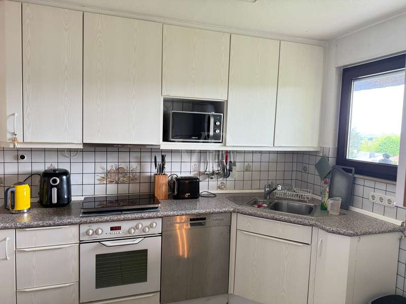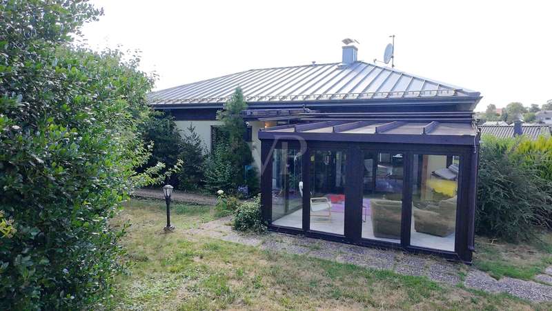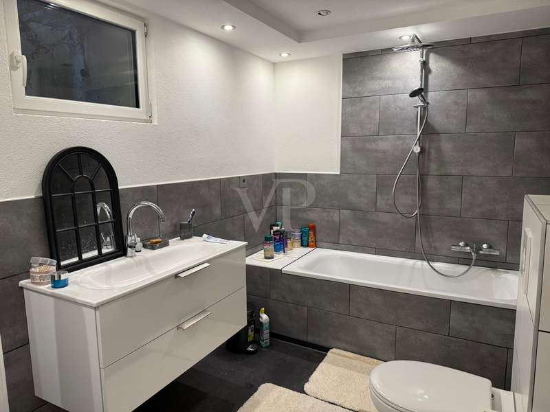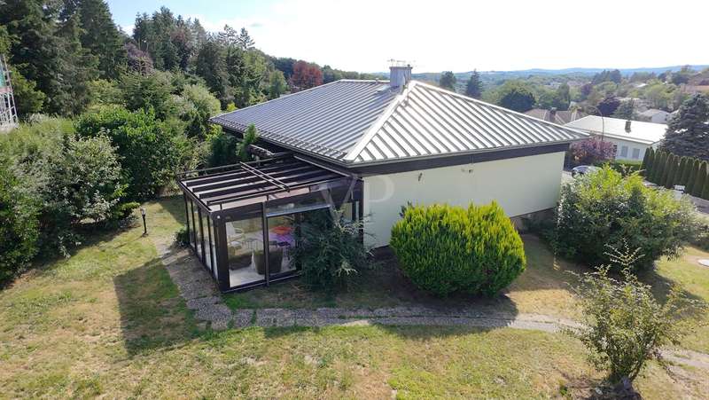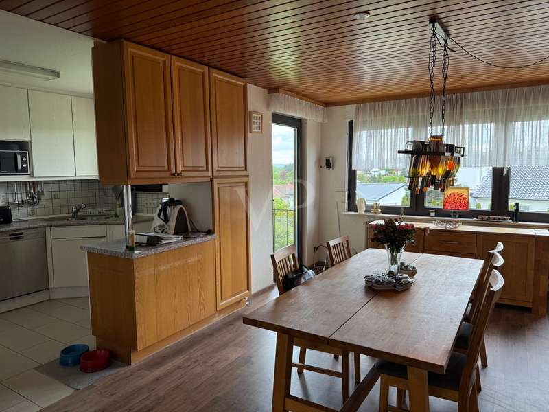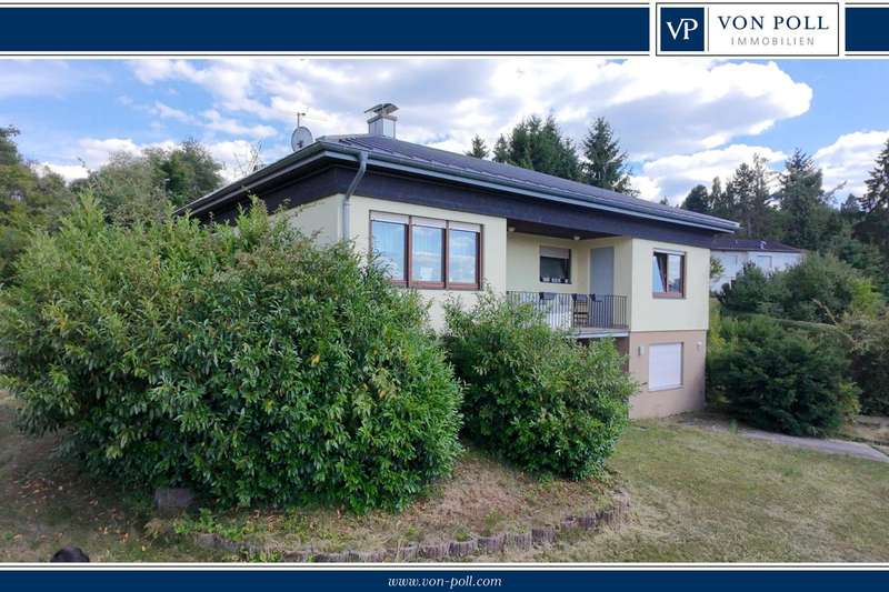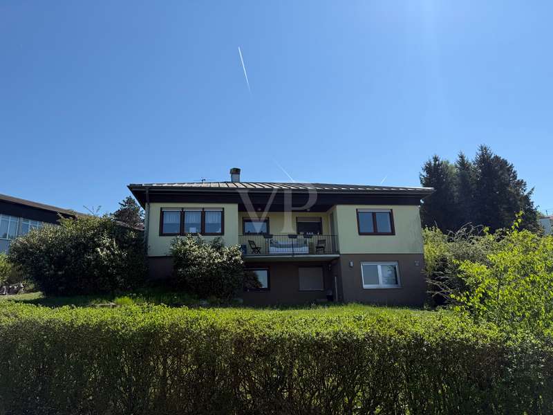 Those who live in Göttschied enjoy the best of both worlds: the rural charm of the Hunsrück landscape and at the same time the immediate proximity to the city of Idar-Oberstein. Thanks to a committed community, good infrastructure and attractive surroundings, this district offers a feel-good home. This bungalow with a full basement and a living space of approx. 195 m² is located on a spacious plot of approx. 1,371 m². The house was built in 1966 as a prefabricated house with a solid brick basement and impresses with its flexible room concept and versatile usage options. Upon entering the house, the spacious entrance area immediately catches the eye, which can be used not only as a checkroom but also as an ideal office corner. Directly to the right, you enter the open-plan living, dining and kitchen area - the heart of the house. Large windows create a pleasant living ambience and provide access to the conservatory and the garden behind the house. A door also leads from the dining area to the sunny balcony. Two spacious bedrooms and a modern daylight shower room round off the space on this level. A marble staircase leads to the fully developed basement, which offers you further design options. There are three rooms here that can be used flexibly - as a bedroom, office or guest room. There are also two further bathrooms on this level, which offer extra comfort. A large, tiled laundry room with plenty of drying space completes this level. The well-kept front garden creates distance from the street and ensures privacy. The rear garden and the side of the house provide ideal areas for playing, leisure and socializing outdoors - whether with family or friends. The double garage and the long carport offer space for up to four vehicles - or even a motorhome, trailer etc. This bungalow impresses with its generous room layout, quiet, central location in Göttschied and spacious plot. It offers couples or families numerous opportunities to realize their own living ideas and create a home entirely according to their personal wishes. Arrange a viewing appointment now - we look forward to showing you this special property in person!!!