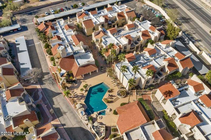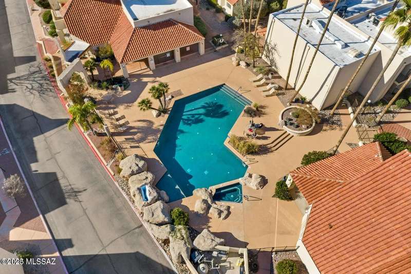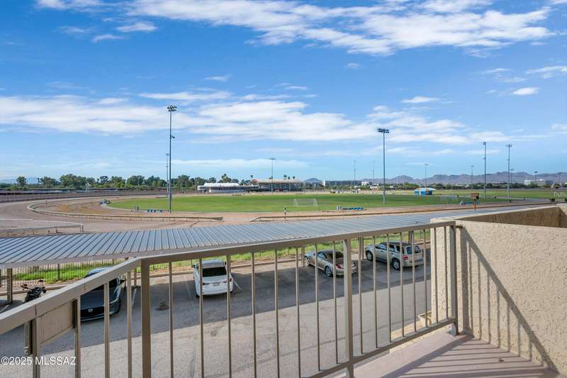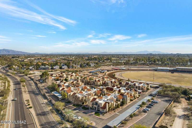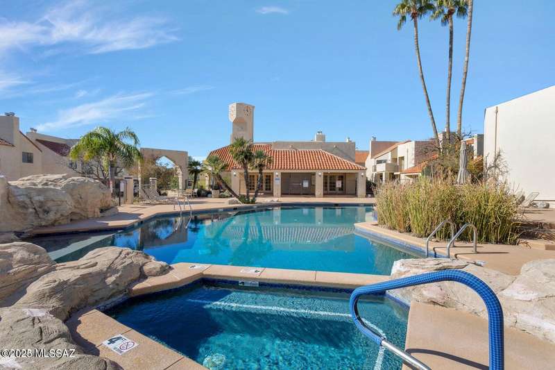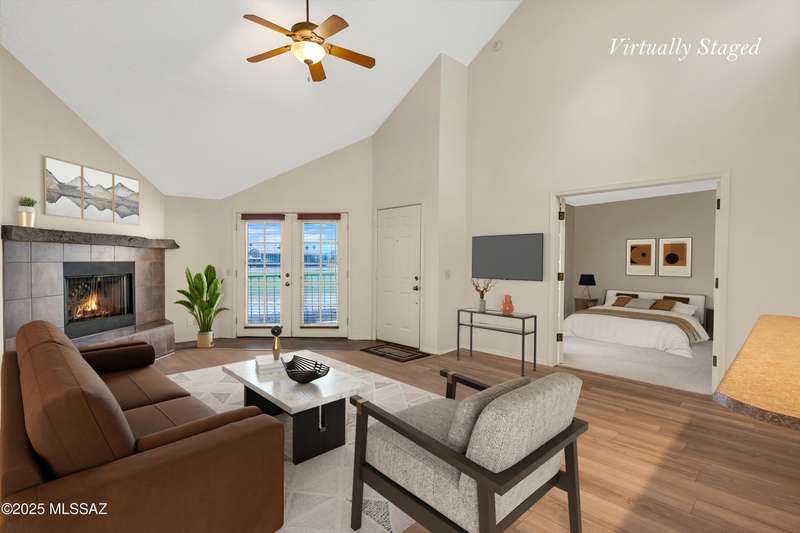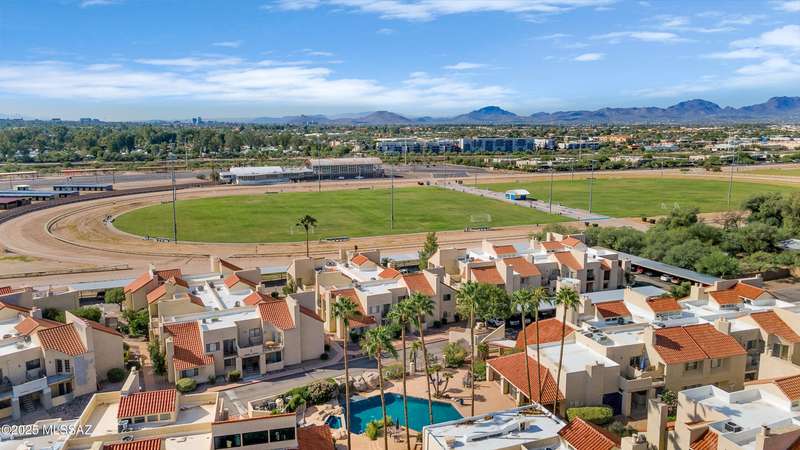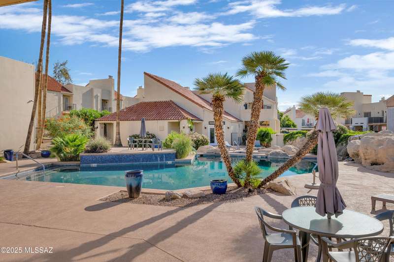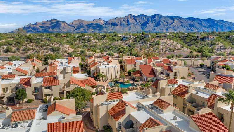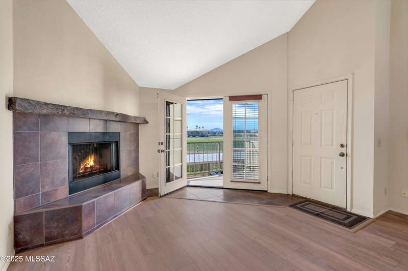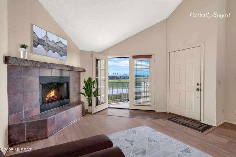 Welcome to this immaculately maintained 2-bedroom, 1-bath condominium, perfectly situated in the highly desirable River Road corridor of the Catalina Foothills! This beautifully updated second floor home offers an inviting open-concept layout that seamlessly connects the kitchen, dining, and main living area. The vaulted ceilings and elegant tiled fireplace create a spacious and comfortable atmosphere, while numerous windows and double doors allow natural light to fill the home-highlighting its bright, airy charm. Enjoy tranquil mountain views from your private patio overlooking the scenic Tucson west-side mountains and lush greens of Rillito Park. Recent upgrades include a brand new 2025 water heater, ensuring peace of mind and efficiency for years to come. The split floor plan offers