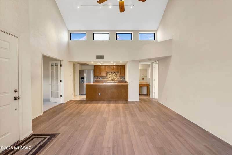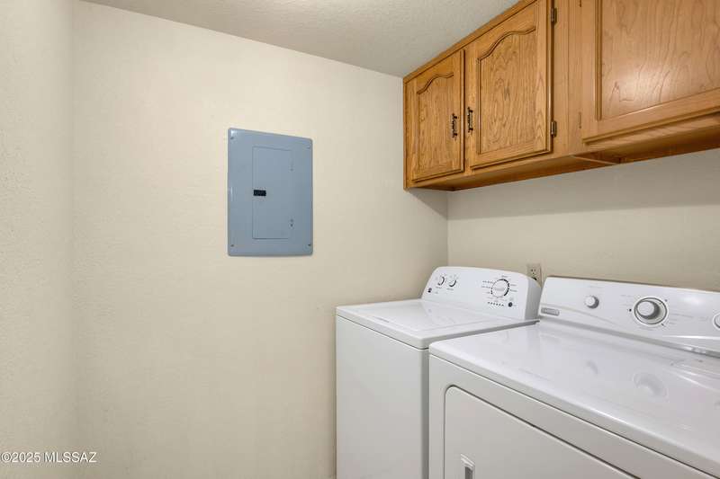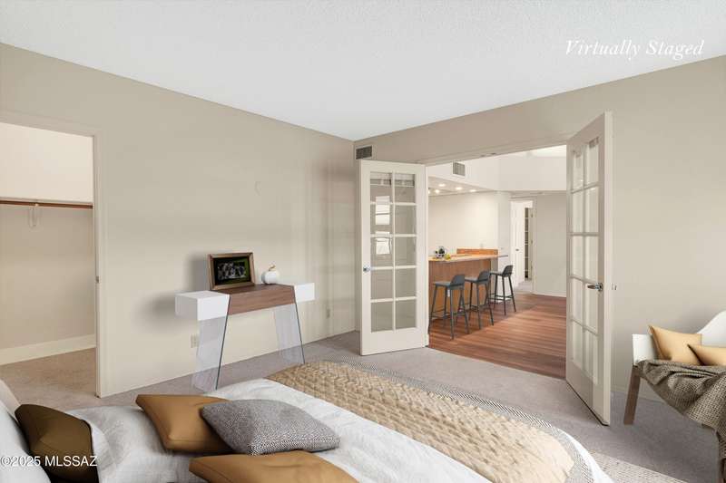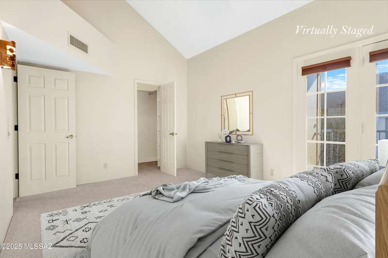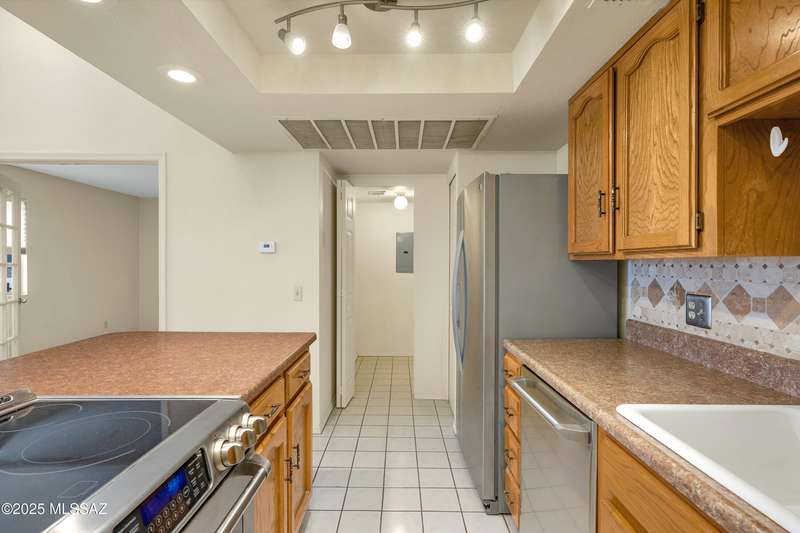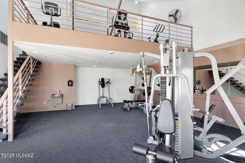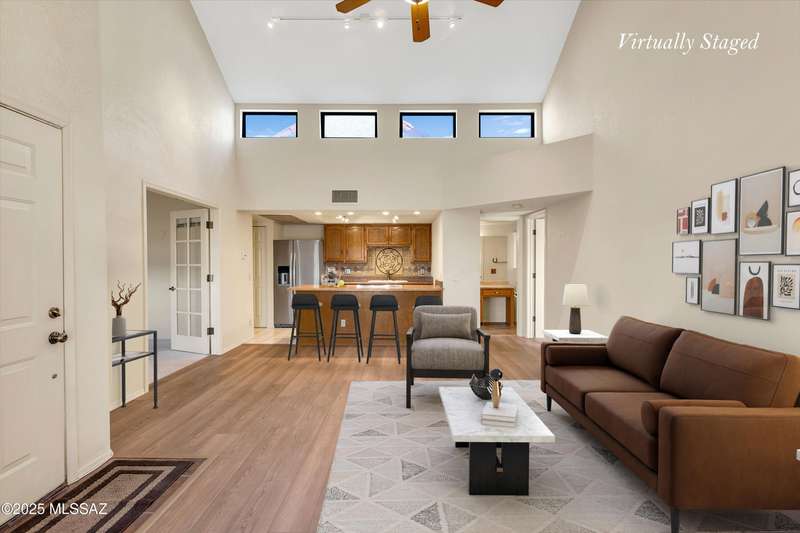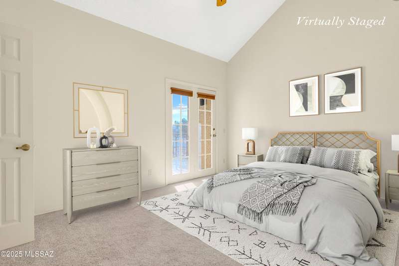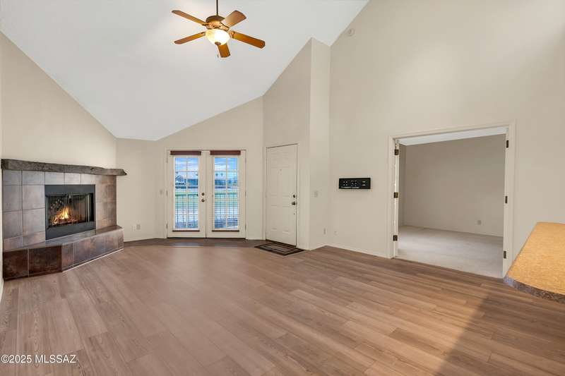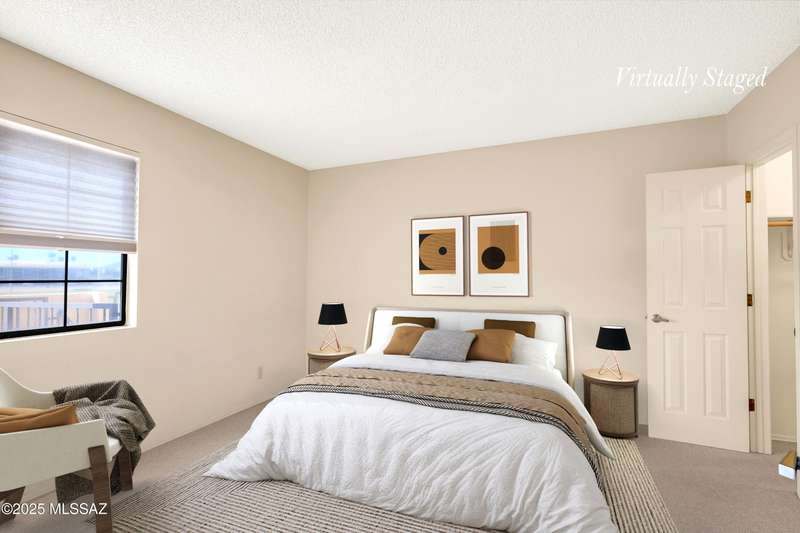 Welcome to this immaculately maintained 2-bedroom, 1-bath condominium, perfectly situated in the highly desirable River Road corridor of the Catalina Foothills! This beautifully updated second floor home offers an inviting open-concept layout that seamlessly connects the kitchen, dining, and main living area. The vaulted ceilings and elegant tiled fireplace create a spacious and comfortable atmosphere, while numerous windows and double doors allow natural light to fill the home-highlighting its bright, airy charm. Enjoy tranquil mountain views from your private patio overlooking the scenic Tucson west-side mountains and lush greens of Rillito Park. Recent upgrades include a brand new 2025 water heater, ensuring peace of mind and efficiency for years to come. The split floor plan offers
