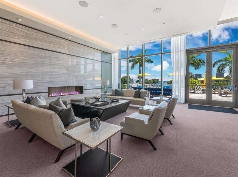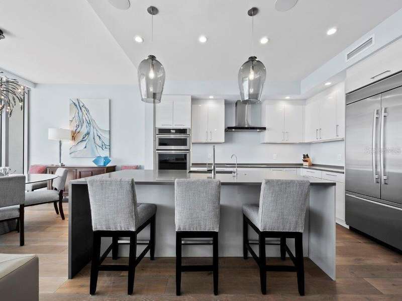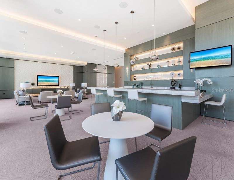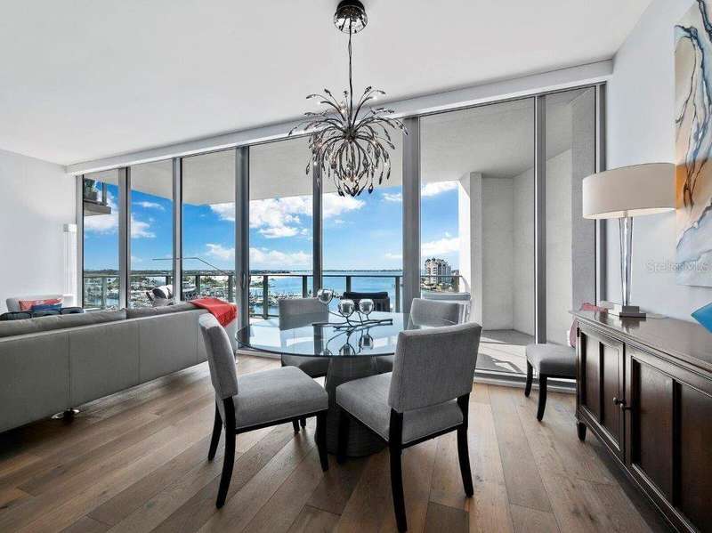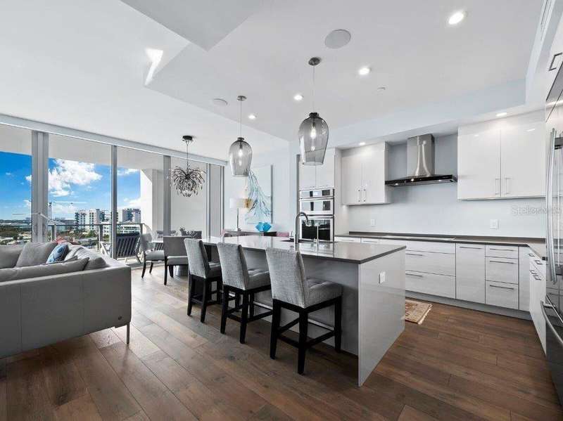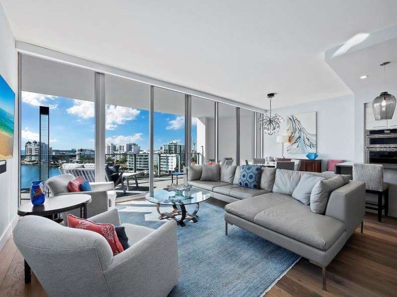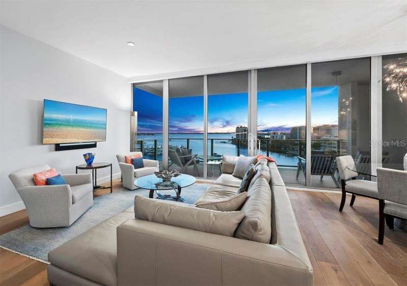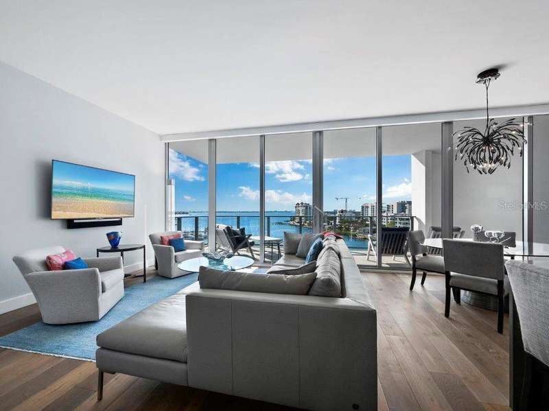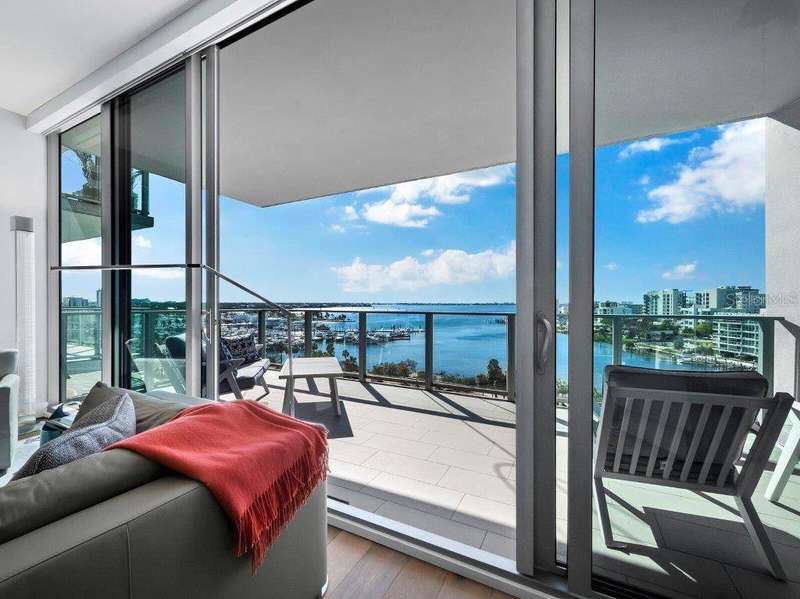 A fabulously appointed designer residence in a coveted, amenity-rich building, VUE 703 offers the pinnacle of luxury living in the heart of Sarasota’s cosmopolitan downtown. Now available turnkey with luxury furnishings and accessories. Renowned for its exceptional resort-style living and elegant contemporary style, VUE is an incredible high-rise building with enviably curated amenities that extend from the valet service and concierge to plush resident lounges and facilities, all within steps of Sarasota’s world-class cultural scene and thriving hub of shops, restaurants, and galleries. This elevated residence with private elevator access is a spacious retreat that blends the sleek modern style of the building with exquisite design elements that lend warmth and enhance the luxurious comfort. Premium upgrades include elegant wide-plank wood floors, designer lighting and décor-both by Creston; high-end built-in audio video system, water filtration by Aqua, while tall 10’ ceilings throughout accentuate absolutely stunning water views. From the front door, unobstructed site lines showcase spectacular southwest vistas across Sarasota Bay and the keys to the Gulf of Mexico beyond. Thoughtfully designed to maximize the views, the home features an airy, open layout with a full wall of floor-to-ceiling sliding impact glass doors that extend the central living space to a deep private terrace with glass railings. Overlooking the dining and central living spaces, the gourmet kitchen with beautiful Italian cabinetry and stainless appliances wraps around a large quartz-clad island with abundant prep and storage space as well as additional seating for guests. The open plan living room and dining area are perfect for entertaining, flowing seamlessly to a private terrace that spans nearly 300 square feet with protective shade and picture-perfect views overlooking the waterfront and marina. The owners’ suite enjoys its own floor-to-ceiling wall of windows for spectacular water and sunset views, with a resort-style bathroom that features extra-long double vanity, enviable storage, glass-enclosed walk-in shower, and separate water closet. Two separate walk-in closets add to the owners’ luxury. Near the home’s entry, a spacious second bedroom offers en suite comfort and ample closet space, and a separate den accommodates a private office or media lounge. The additional half bath is luxuriously outfitted with haute design elements including crystal sconces and a carved onyx sink. A generous, separate utility room with washer and dryer adds to the exceptional in-home conveniences. The residence comes with deeded, secure storage space and two assigned parking spaces that are gated and enclosed. Ideally located across from Sarasota’s celebrated waterfront and within steps of Downtown’s cosmopolitan core, VUE is a highly sought after address with a dazzling array of premium amenities including heated pool and spa with a spectacular pool deck that encompasses multiple lounge areas, fire pit, and enormous pergola with gourmet grill station. Additional amenities include fitness center, dedicated pet recreational area, concierge and security. Offered by the original owners, meticulously maintained and upgraded, VUE 703 is a valuable opportunity to enjoy a lifestyle of ultimat comfort and style.