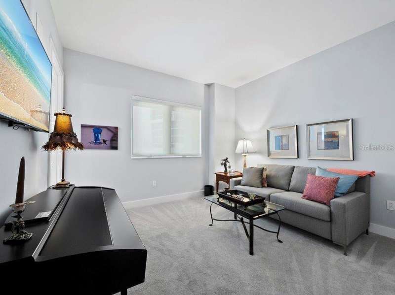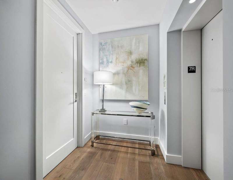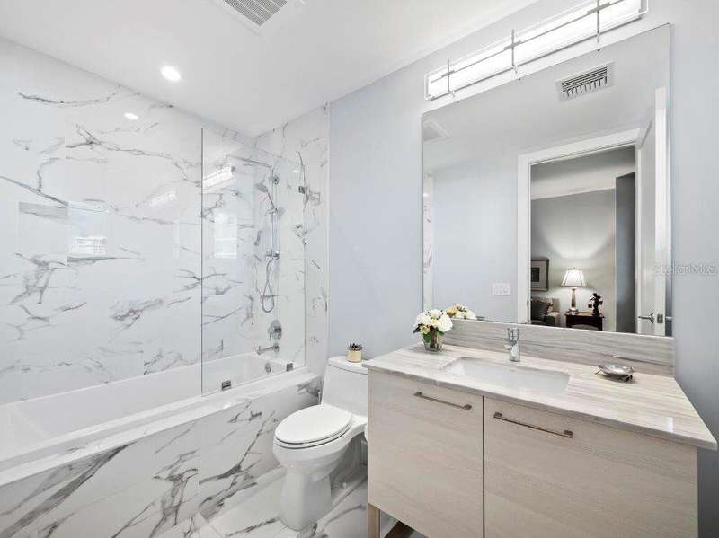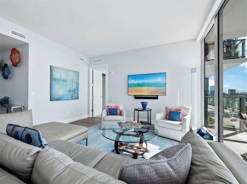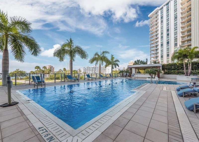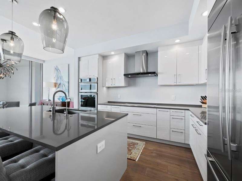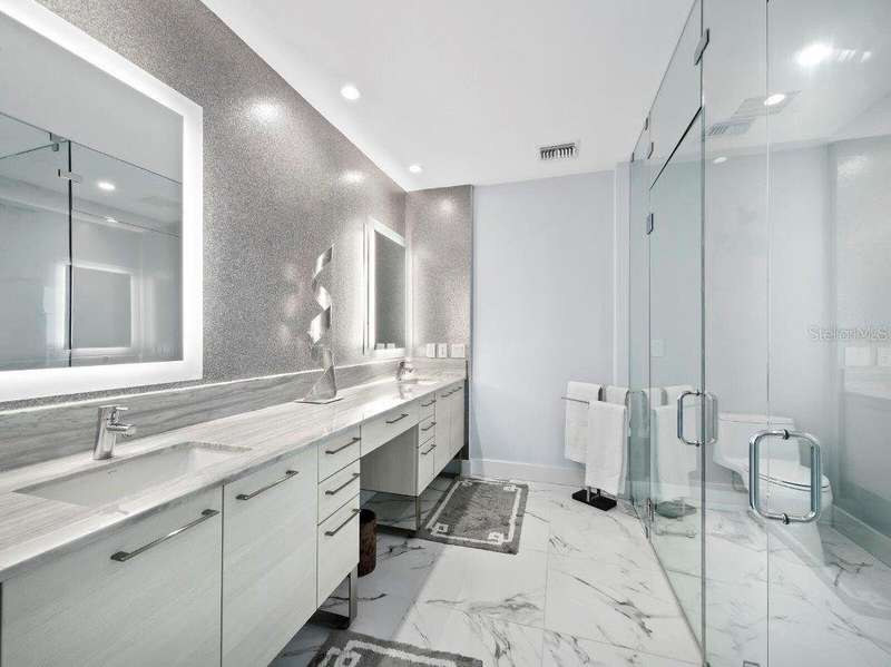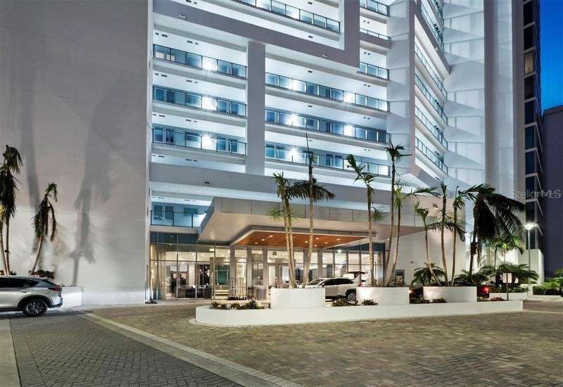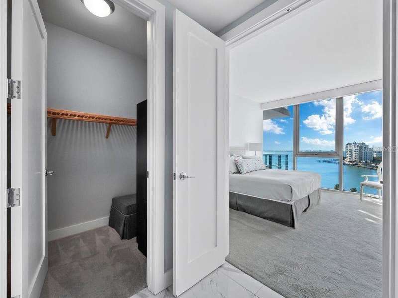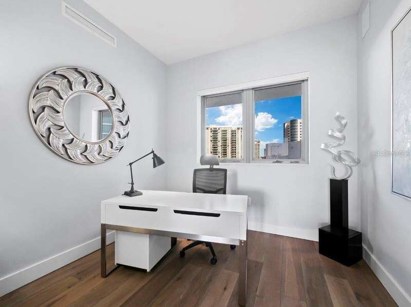 A fabulously appointed designer residence in a coveted, amenity-rich building, VUE 703 offers the pinnacle of luxury living in the heart of Sarasota’s cosmopolitan downtown. Now available turnkey with luxury furnishings and accessories. Renowned for its exceptional resort-style living and elegant contemporary style, VUE is an incredible high-rise building with enviably curated amenities that extend from the valet service and concierge to plush resident lounges and facilities, all within steps of Sarasota’s world-class cultural scene and thriving hub of shops, restaurants, and galleries. This elevated residence with private elevator access is a spacious retreat that blends the sleek modern style of the building with exquisite design elements that lend warmth and enhance the luxurious comfort. Premium upgrades include elegant wide-plank wood floors, designer lighting and décor-both by Creston; high-end built-in audio video system, water filtration by Aqua, while tall 10’ ceilings throughout accentuate absolutely stunning water views. From the front door, unobstructed site lines showcase spectacular southwest vistas across Sarasota Bay and the keys to the Gulf of Mexico beyond. Thoughtfully designed to maximize the views, the home features an airy, open layout with a full wall of floor-to-ceiling sliding impact glass doors that extend the central living space to a deep private terrace with glass railings. Overlooking the dining and central living spaces, the gourmet kitchen with beautiful Italian cabinetry and stainless appliances wraps around a large quartz-clad island with abundant prep and storage space as well as additional seating for guests. The open plan living room and dining area are perfect for entertaining, flowing seamlessly to a private terrace that spans nearly 300 square feet with protective shade and picture-perfect views overlooking the waterfront and marina. The owners’ suite enjoys its own floor-to-ceiling wall of windows for spectacular water and sunset views, with a resort-style bathroom that features extra-long double vanity, enviable storage, glass-enclosed walk-in shower, and separate water closet. Two separate walk-in closets add to the owners’ luxury. Near the home’s entry, a spacious second bedroom offers en suite comfort and ample closet space, and a separate den accommodates a private office or media lounge. The additional half bath is luxuriously outfitted with haute design elements including crystal sconces and a carved onyx sink. A generous, separate utility room with washer and dryer adds to the exceptional in-home conveniences. The residence comes with deeded, secure storage space and two assigned parking spaces that are gated and enclosed. Ideally located across from Sarasota’s celebrated waterfront and within steps of Downtown’s cosmopolitan core, VUE is a highly sought after address with a dazzling array of premium amenities including heated pool and spa with a spectacular pool deck that encompasses multiple lounge areas, fire pit, and enormous pergola with gourmet grill station. Additional amenities include fitness center, dedicated pet recreational area, concierge and security. Offered by the original owners, meticulously maintained and upgraded, VUE 703 is a valuable opportunity to enjoy a lifestyle of ultimat comfort and style.