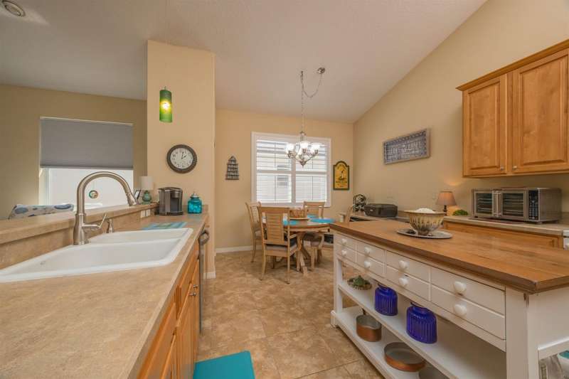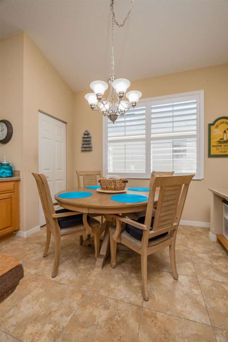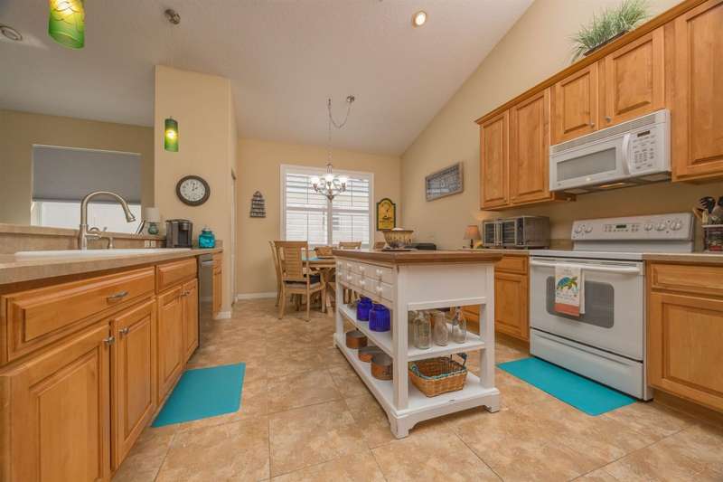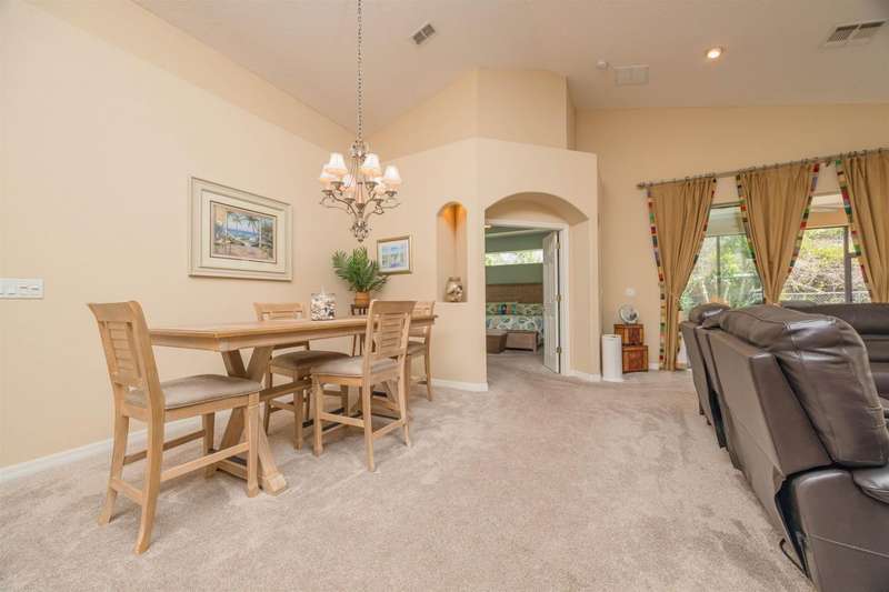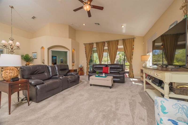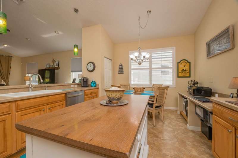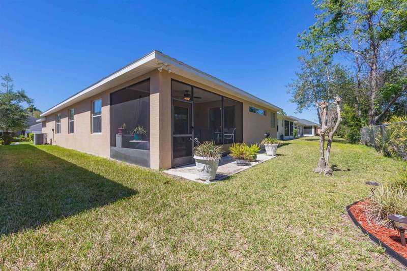 LOW MAINTENANCE, LOW PRICE & LOW HOA FEE (LAWN CARE INCLUDED) MAKES THIS SPACIOUS CONCRETE BLOCK 3BR/2BA A PERFECT COMBINATION FOR A LAID BACK LIFESTYLE! Ideal as a main residence or as a vacation home. Enter the wide, tall foyer to a roomy eat in kitchen with lots of cabinets, counters & a built in desk! Formal dining room & large living room with high ceilings & lots of light lead out to 17x10 screened lanai overlooking private treed yard backing to a greenbelt/preserve. At the back of the home is the spacious owner suite with huge walk in closet, high eyebrow window & sliders leading to screened lanai. Owner bathroom includes double vanity, garden tub & a separate beautifully tiled shower. 2nd bedroom includes big walk in closet & Murphy bed. Across the hall is the 3rd bedroom with 2nd bathroom, plus washer & dryer closet in between. Community pool & tennis. Less than 5 min to shopping & less than 15 min to the beach!