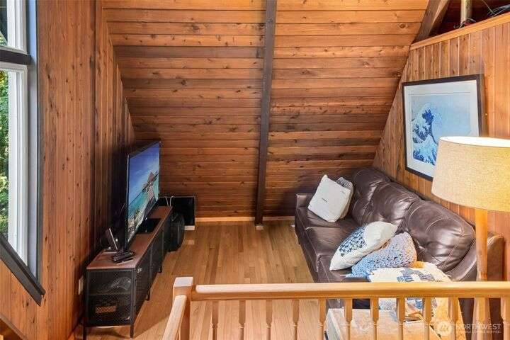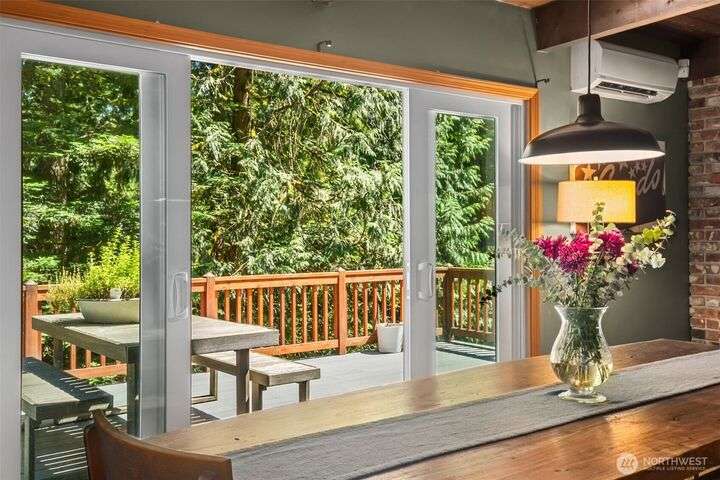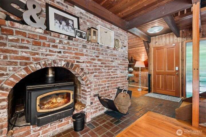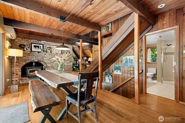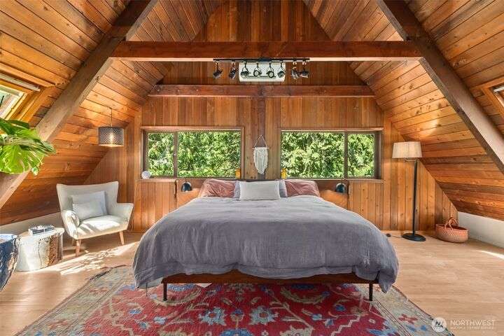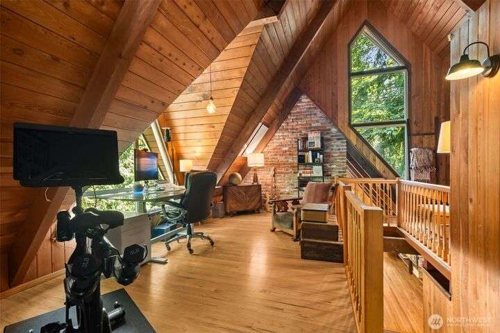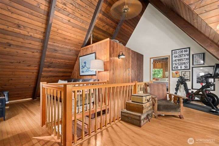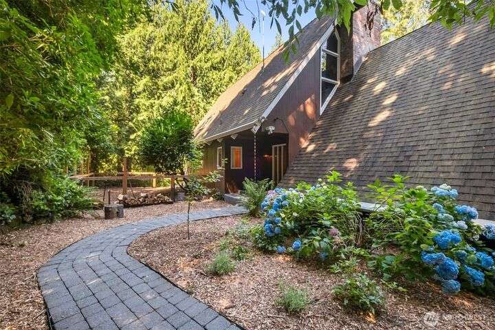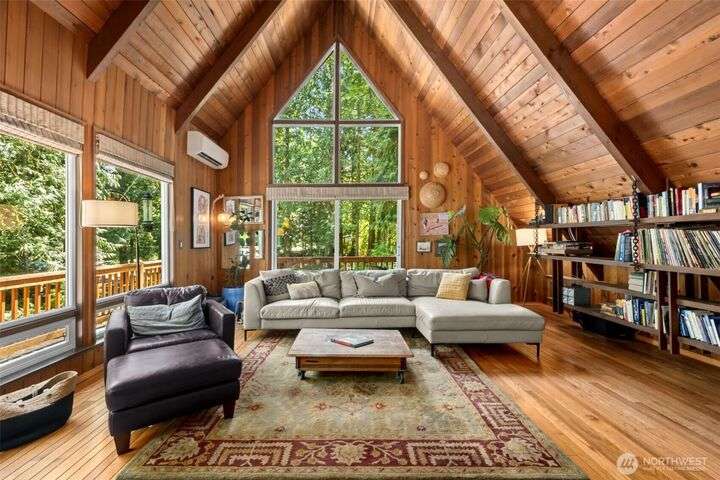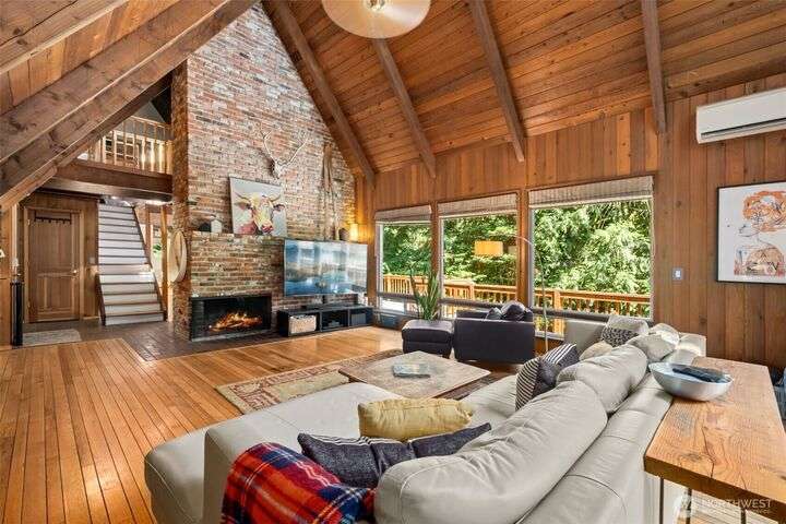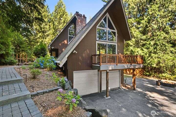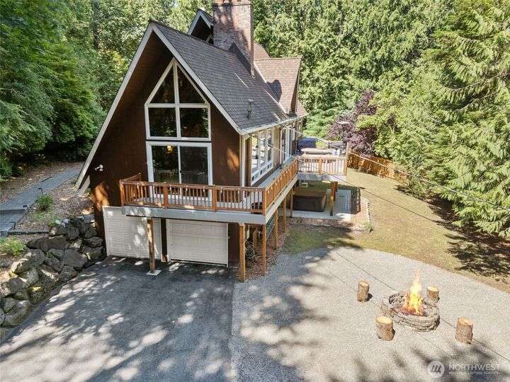 Wow, almost impossible to find anything in Mirrormont for under 1 million! This is a unique opportunity! This elegant A-frame home creates a warm, lodge-like feel the moment you step inside w/soaring ceilings & natural wood beams. Spacious living room is the heart of the home, anchored by a floor-to-ceiling brick fireplace & walls of windows - an inviting spot for quiet evenings or lively gatherings. Open classic kitchen w/large dining area! 3 or 4 bdrms mean flexibility to fit your lifestyle. Enjoy a loft-style office & cozy nook upstairs, along w/serene primary suite. Host unforgettable summer nights on huge wrap-around deck, the fire pit, or savor wood-fired meals from pizza oven. Rare flat lot w/paving + RV parking & fenced dog area.