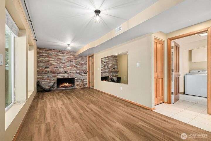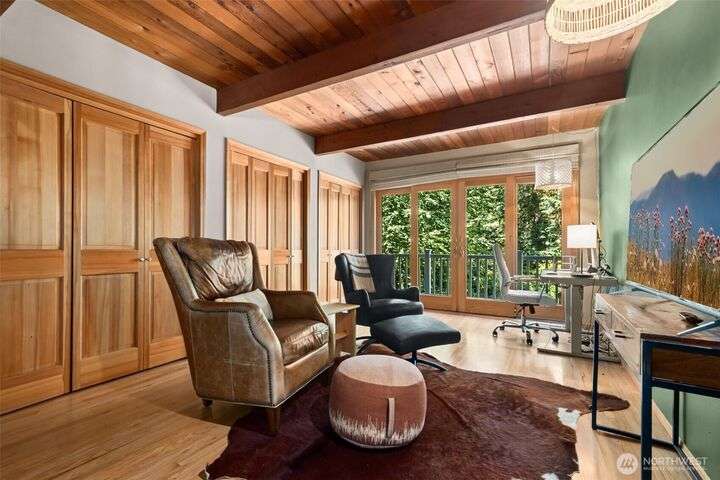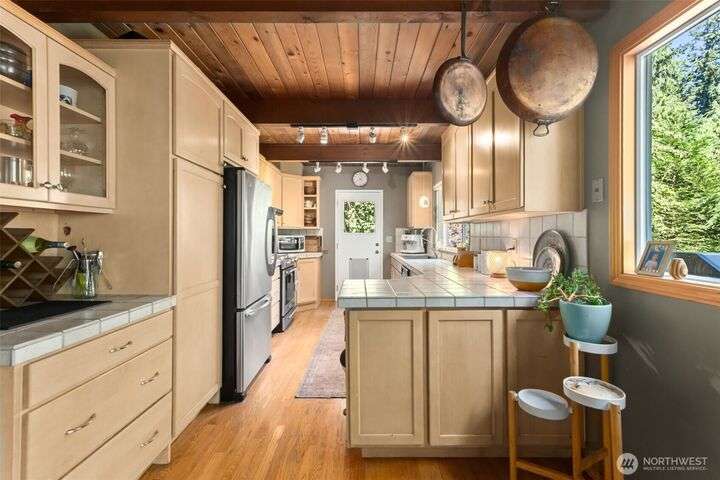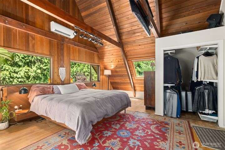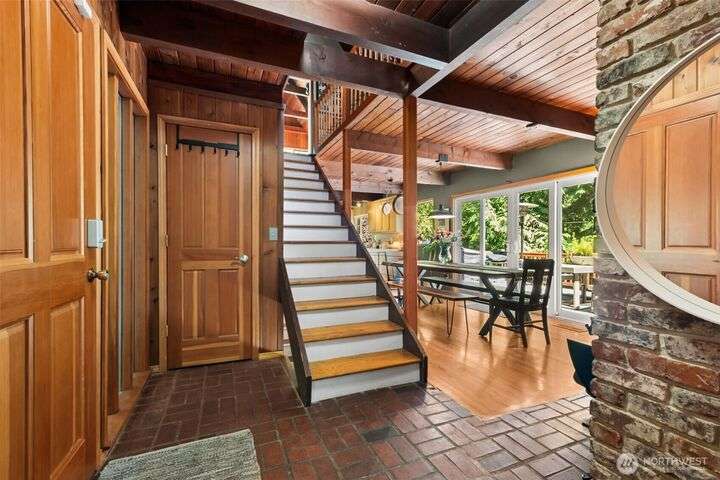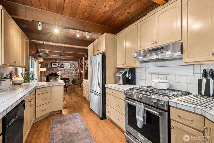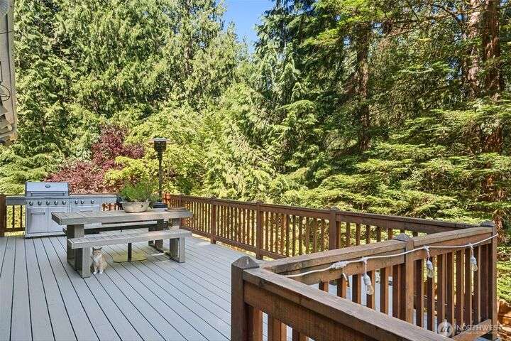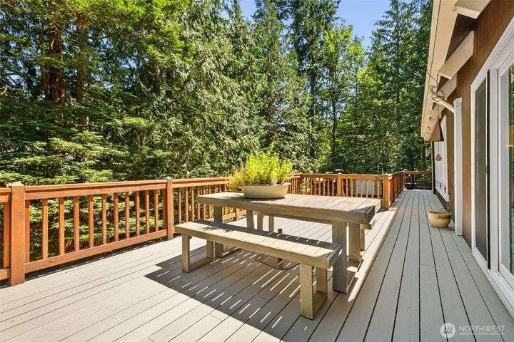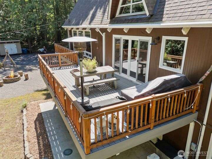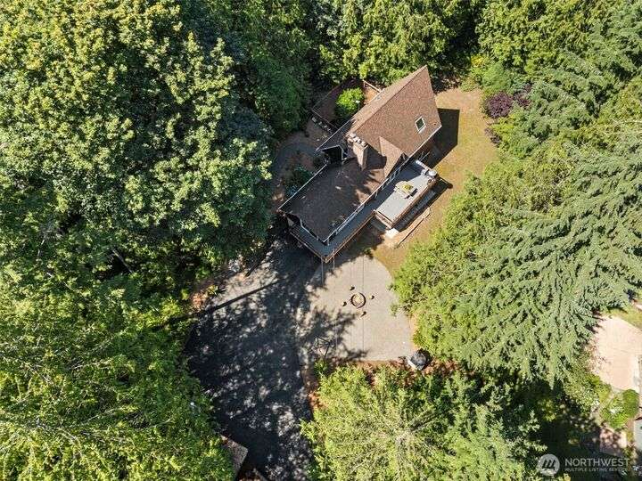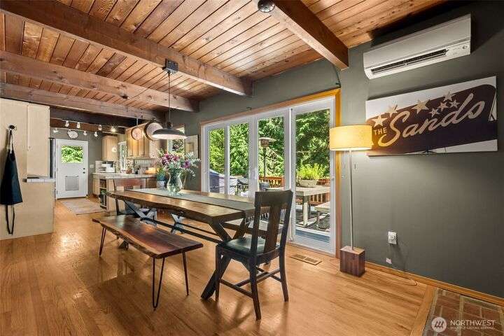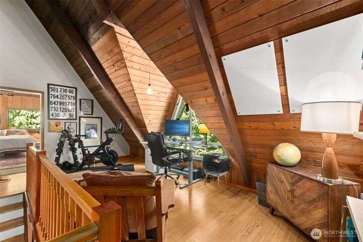 Wow, almost impossible to find anything in Mirrormont for under 1 million! This is a unique opportunity! This elegant A-frame home creates a warm, lodge-like feel the moment you step inside w/soaring ceilings & natural wood beams. Spacious living room is the heart of the home, anchored by a floor-to-ceiling brick fireplace & walls of windows - an inviting spot for quiet evenings or lively gatherings. Open classic kitchen w/large dining area! 3 or 4 bdrms mean flexibility to fit your lifestyle. Enjoy a loft-style office & cozy nook upstairs, along w/serene primary suite. Host unforgettable summer nights on huge wrap-around deck, the fire pit, or savor wood-fired meals from pizza oven. Rare flat lot w/paving + RV parking & fenced dog area.