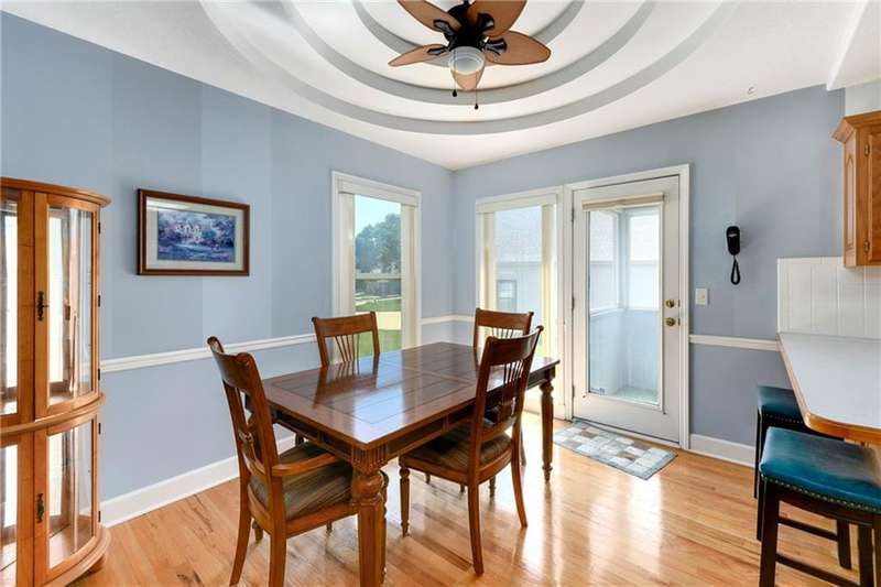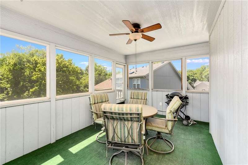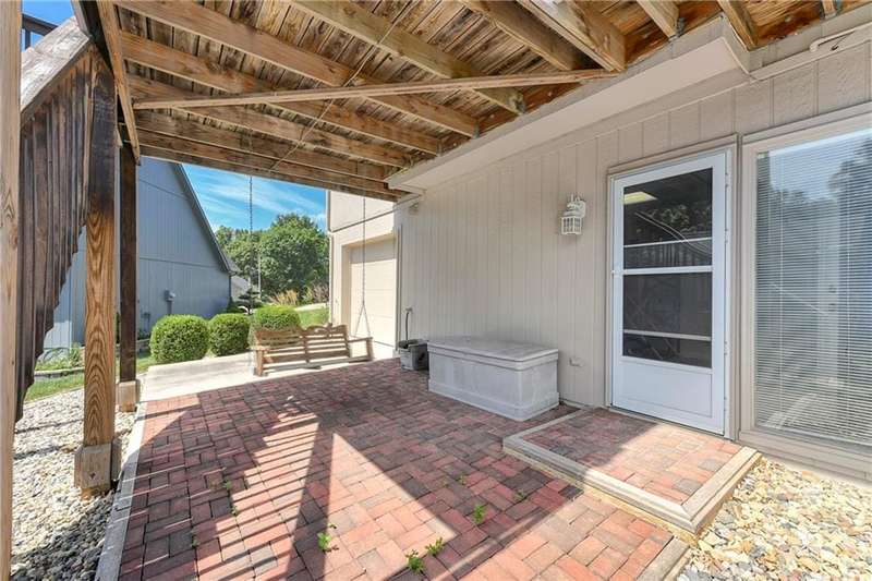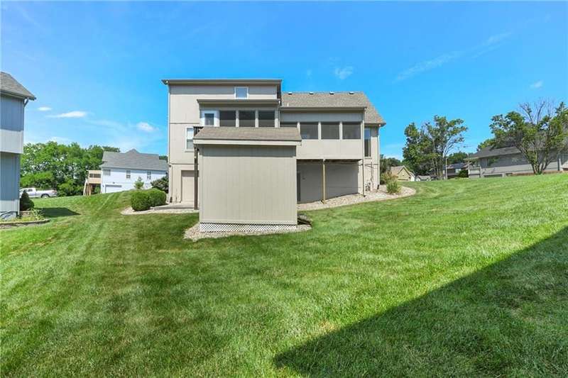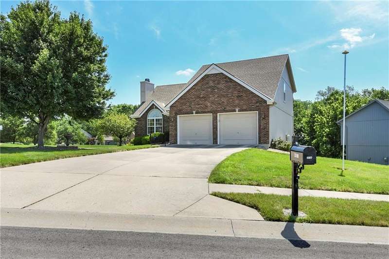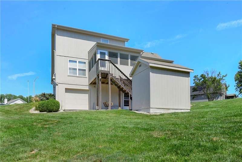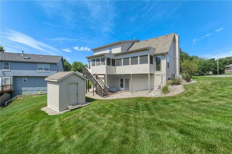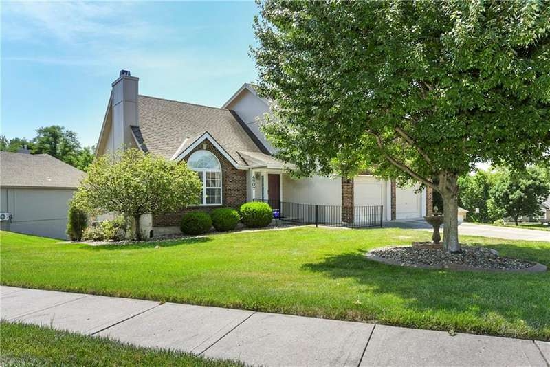 LOCATION, LOCATION, LOCATION. Easy highway access to anywhere in the metro. A truly remarkable opportunity and value with this beautiful 1.5 Story residence on the corner of N Washington and N Jefferson in THE OAKS. An amazing home with special touches on all 3 levels - inside and out. Step into an inviting 2 story living room with vaulted ceilings, large picture window and a statement fireplace. The kitchen / dining combo is open to the space and makes for easy living and entertaining. Breakfast bar provides extra seating, floor to ceiling windows overlooking both the back and side yards bring in natural light while providing access to the enclosed porch and steps to the back yard. Miles of counterspace in the fully equipped kitchen create a fun and functional space. Also on the main floor is a separate laundry room (washer (6 months old) and dryer stay), cute powder room for guests, and comfortable primary suite with 2 closets, ceiling fan, ensuite bath with dual sinks, whirlpool tub, separate shower and heated floors. Upstairs are 2 guest bedrooms with oversized closets. One is nicely outfitted for a home office, if needed. The second full bath is upstairs. In the lower level prepare to be WOW'ed with the family room that is ideal for entertaining with a large wet bar, plus another full bath, storage, access to the 3rd (utility) garage and the outside patio area that includes the porch swing. Need more storage, then be sure and check out the cute little shed with the handy ramp. This wonderful residence offers custom ceiling treatments throughout (vaults, framing, spirals, beadboard, etc....). This home and this neighborhood are conveniently located with easy highway access, all within the award winning North Kansas City School District.