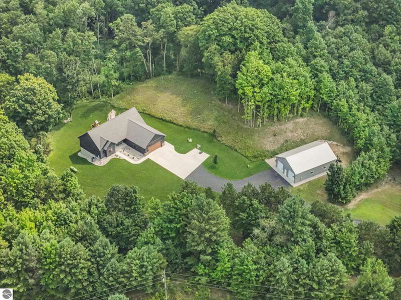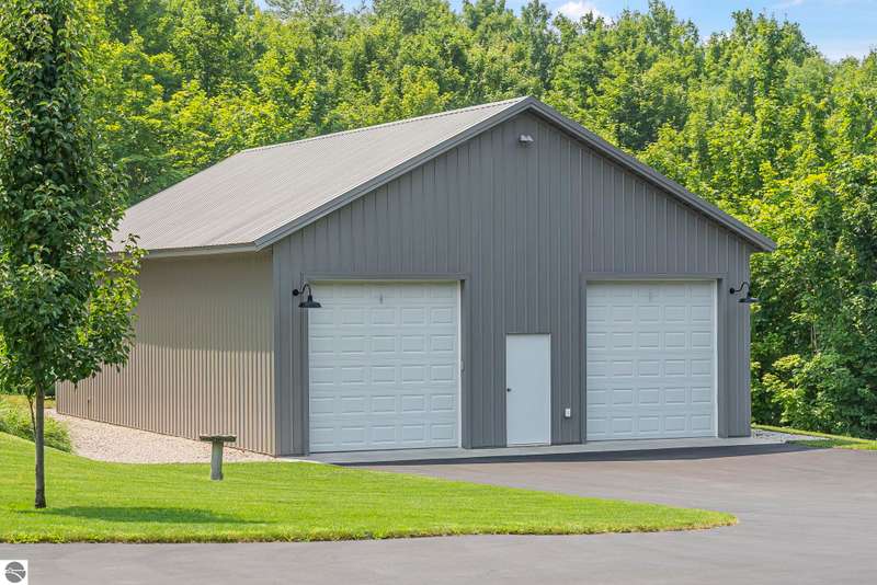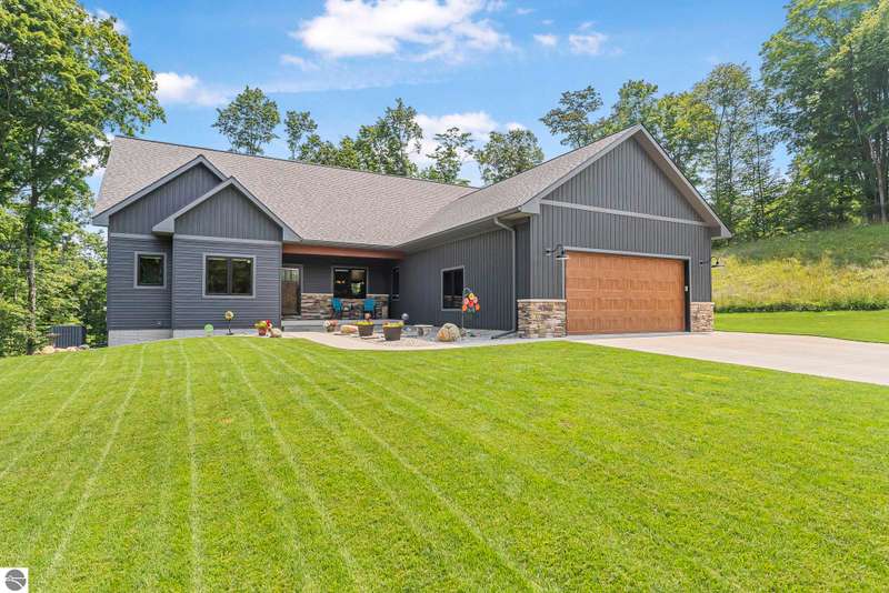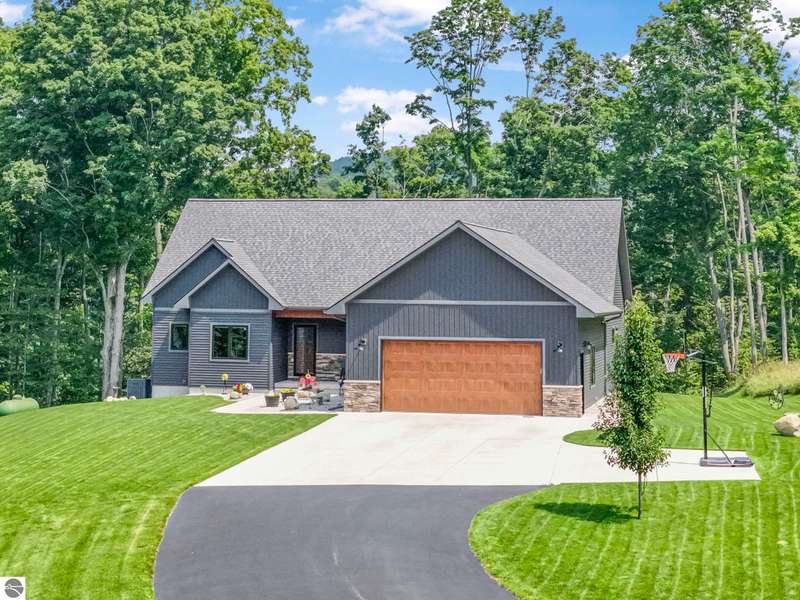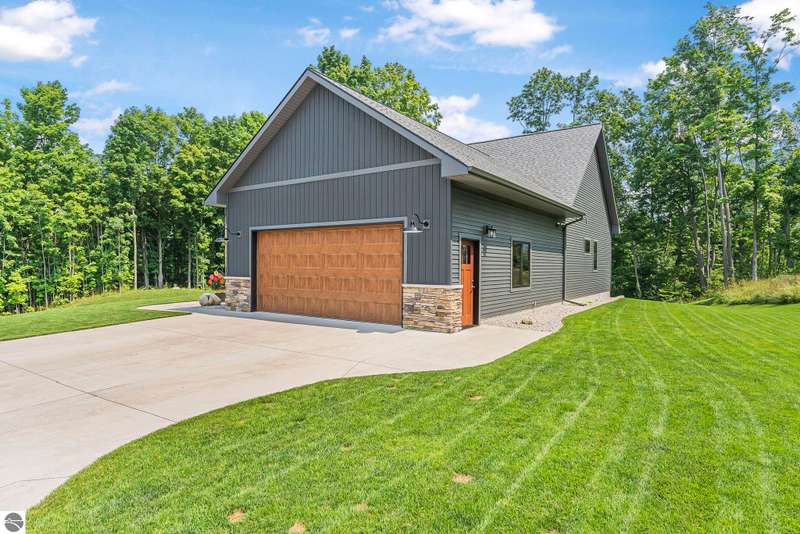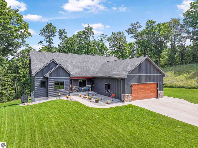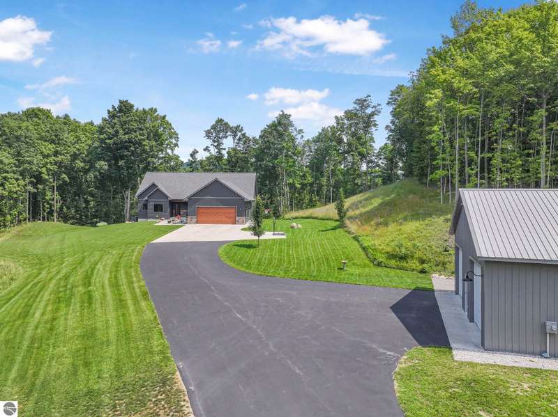 Like new, one owner custom well-crafted home features an abundance of style and character throughout with attention to detail. Elegant entry welcomes you into spacious open layout with island kitchen design featuring stainless appliances, granite counter tops, pantry and luxury vinyl plank flooring that flows through main living areas. Nice sized Dining area. Living room with big windows overlooking private rear yard, natural gas f/p and access to rear deck. 9ft ceilings. Gracious main floor primary suite includes walk-in closet, private bath with soaking tub and tiled walk-in shower. Main floor laundry room and mud room. Full finished lower level with 4th bedroom, full bath, family room, office space & wet bar. Home is complete with attached finished 2 car garage plus an additional 32'x48' finished heated pole building with its own electric meter and two 10'x10' overhead doors and 12 ceiling height. Take advantage of a nice manicured grounds with irrigation and over 7 beautiful acres to roam around on. All of this conveniently located in Leelanau County yet a short distance to downtown Traverse City, tart trail and wineries, dining, shopping and Munson Hospital.