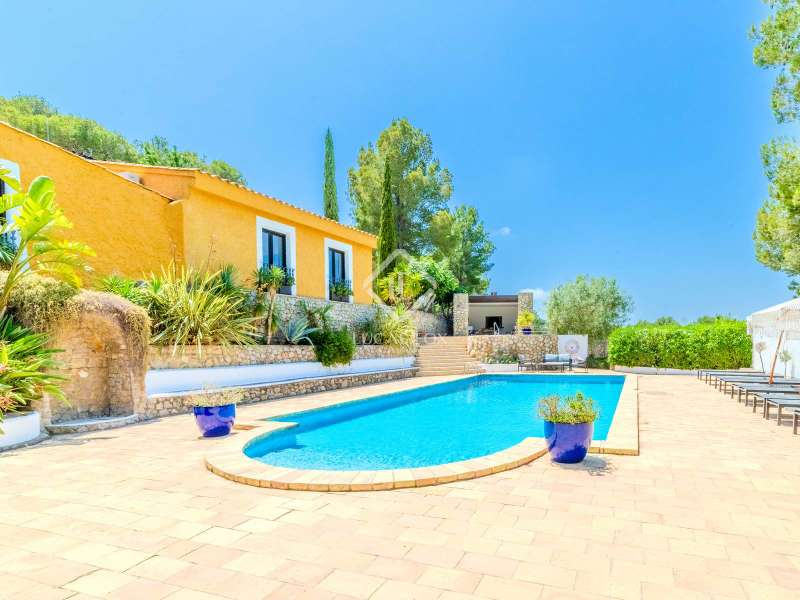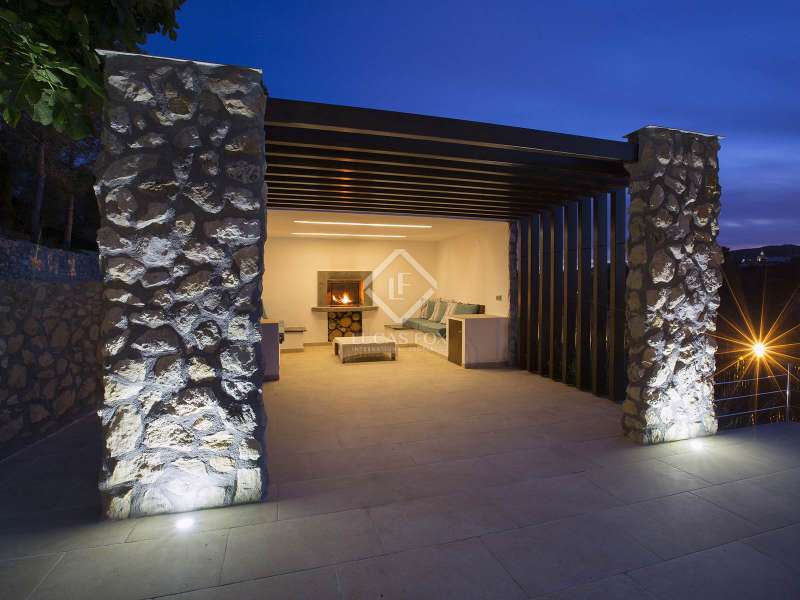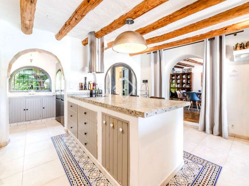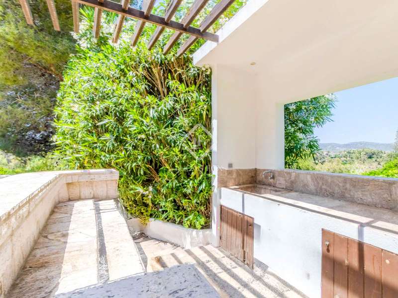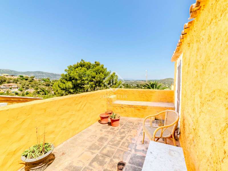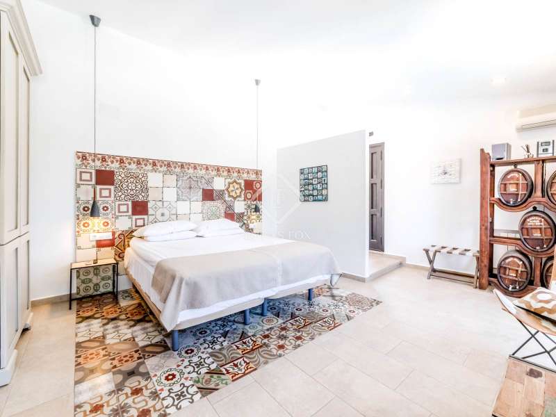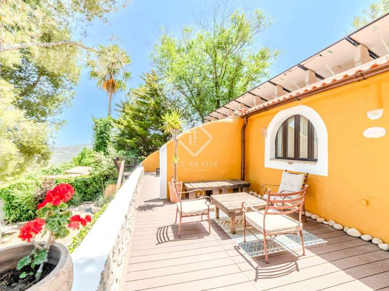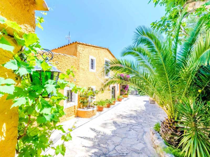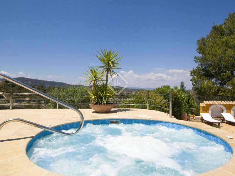 This unusual rural property was once a Spanish wine estate and dates back to 1842. It is now a lavish villa with a large annex building that is used as separate accommodation. The property, which is close to nature (Parc d'Olerdola), is situated on a hillside in the modest Canyelles neighbourhood. It is ten minutes' drive from Sitges and forty-five minutes from Barcelona, in the world-famous Penedés wine region, known for its mouthwatering Cava wines. The home offers complete solitude and a 4,430 square-metre, fully gated plot. The spacious main house, which is roughly 470 square metres, has five bedrooms and en-suite bathrooms. Additionally, the annex building has four other suites with private bathrooms. Because of this, the property may house a large family or be used as tourist rental accommodation, utilizing the current licence for that purpose. We enter the main building through the impressive front door and arrive at the entrance hall, which provides access to a guest bathroom and an office. The first double bedroom with a living area, fireplace, and private bathroom is located on the left of the stairs. The second double bedroom with a living space and an attached bathroom is also located here. The third double bedroom is located in this part, which is accessible from the hallway up the stairs to the right. It also has a private patio and an en-suite bathroom. The remaining two bedrooms with en-suite bathrooms are also found on this level of the home, and all have been designed to be peaceful and comfortable, perfectly complementing the feel within the home. We descend one level to the spacious living area, which is situated in the space where the former wine press once stood. It includes a large dining room, an attractive sitting room, and a lounge area with a fireplace. A contemporary, open, and fully furnished kitchen is located further along this floor. The spacious 15x6-metre pool, sunbathing area, and partially covered patios are all accessible from the kitchen. There is a pool house, a bar, and a jacuzzi. A beautiful, mature green garden with fruit trees and palm trees, surrounded by nature and mountains, is a veritable haven where one may enjoy a Mediterranean lifestyle year-round. In addition to the home, there is a 175 square-metre annex structure that currently houses an apartment for four people with a living area, kitchen, and four bedrooms with living space and en-suite bathrooms. In addition to having access to the garden with all the amenities, these suites and the apartment each have a private patio. The main building's roof was recently insulated, and the windows have double glazing, the property has air conditioning, a spa area with a sauna and Turkish steam bath, a swimming pool with a salt water installation and a jacuzzi, and hot water supply and heating powered by solar panels. Please contact us for further information.