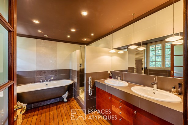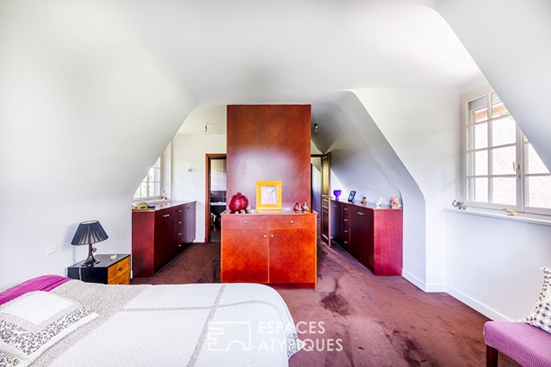 The upper floor consists of a landing which distributes two large bedrooms of 13 and 24 sqm and share a bathroom with shower. Then, the 25 sqm master suite offers a generous space with a double dressing room and a bathroom with private shower for optimal comfort. The full basement is organized into a 15 sqm laundry room, a 16 sqm storage room, a wine cellar and a tiled garage with two large parking spaces.