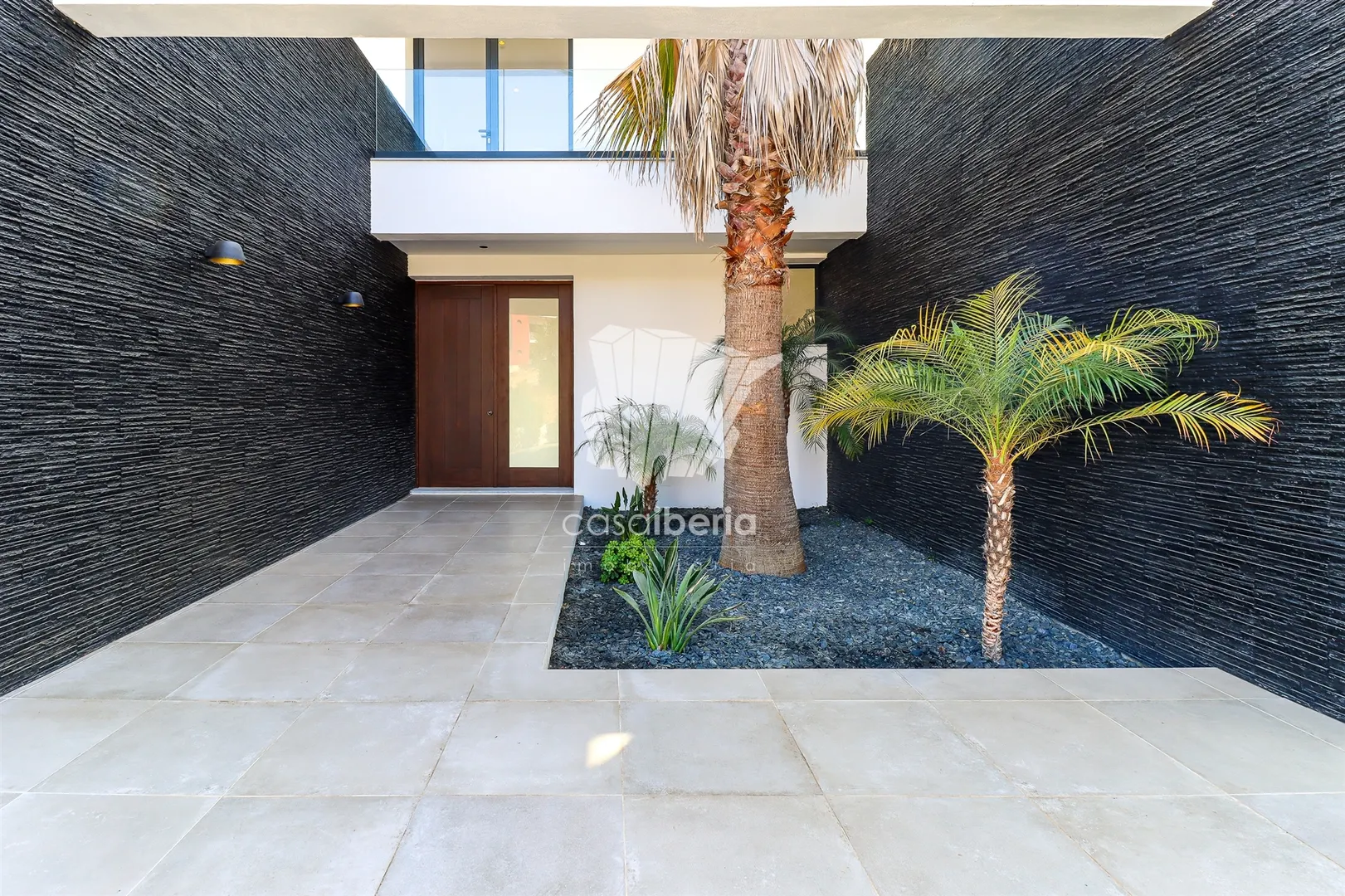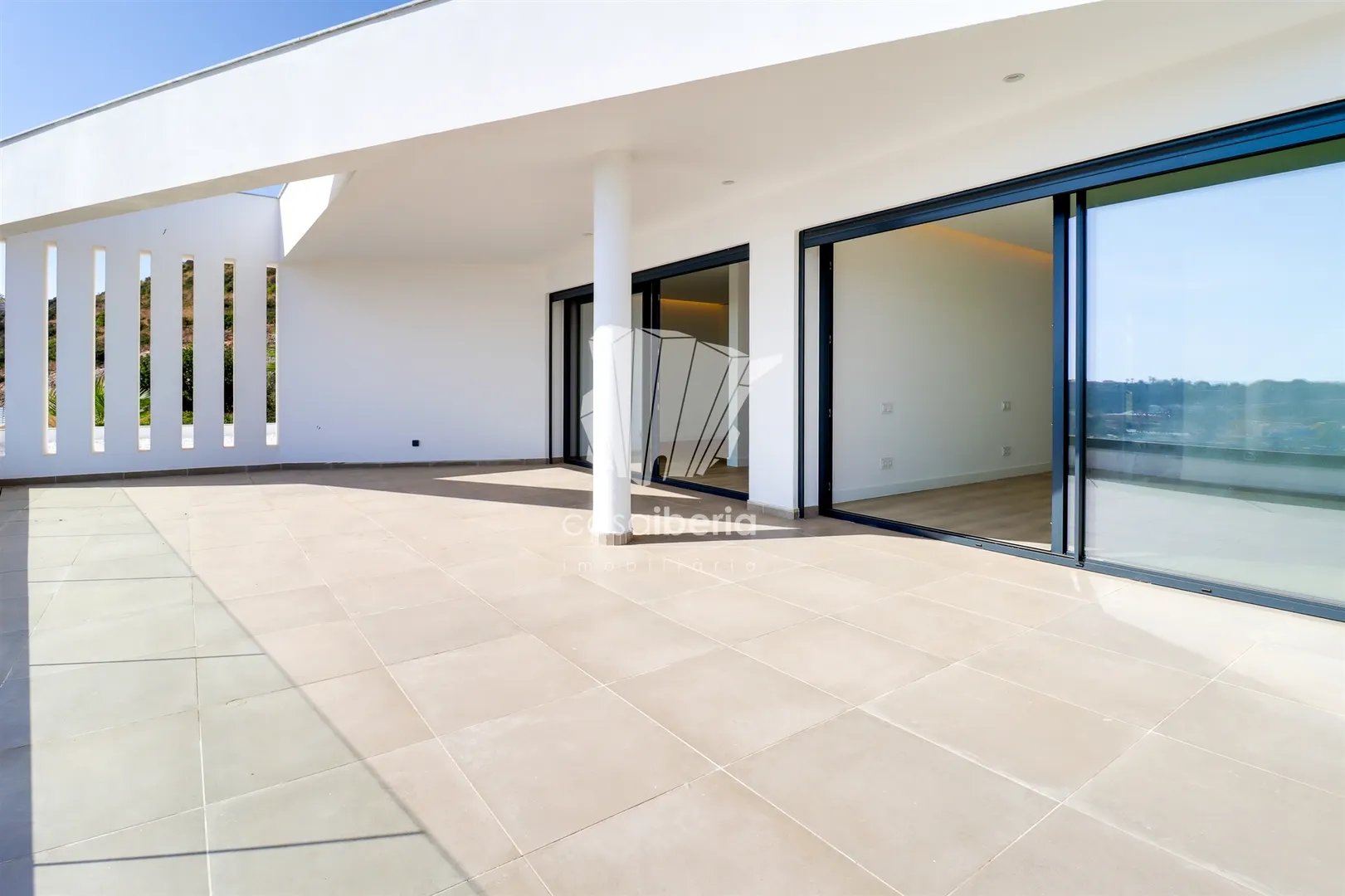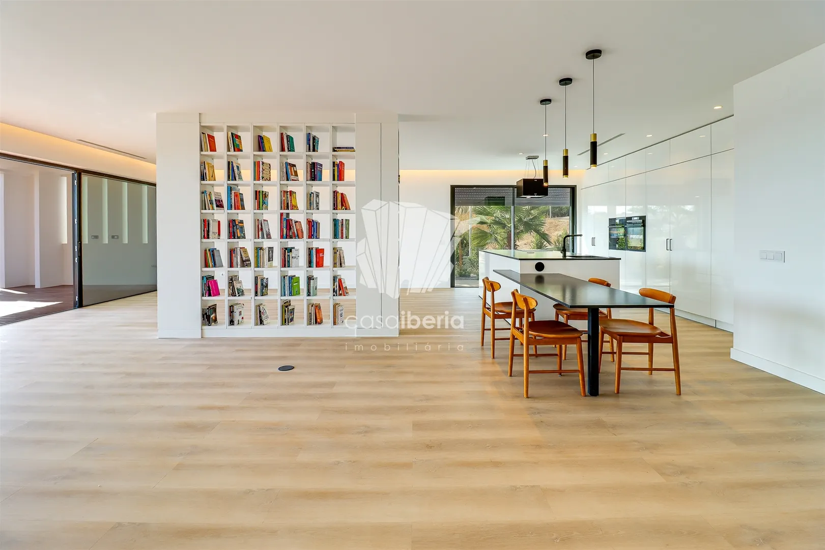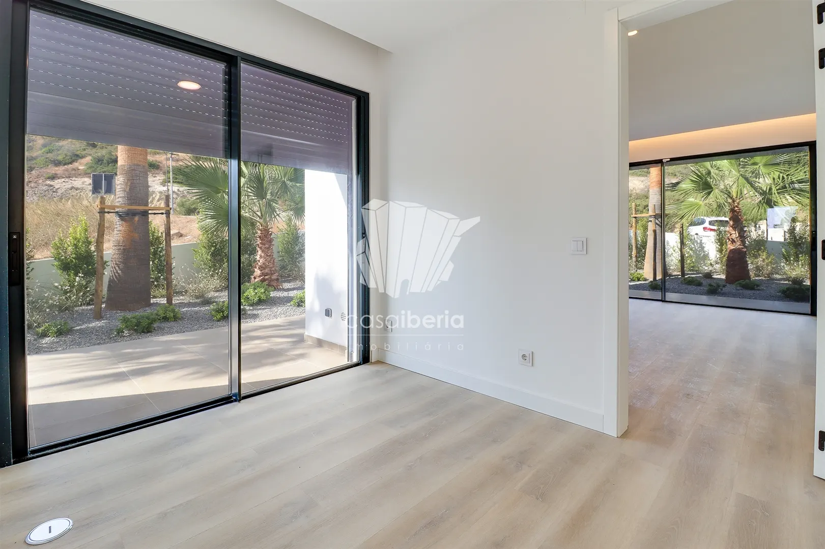 It has an imposing entrance to the social area, with a living and dining room and kitchen equipped with an open-plan island, very spacious, with natural light thanks to the glass windows that extend from floor to ceiling, thus offering a panoramic view over the sea and the tropical garden, eliminating any barrier between the interior and the exterior. This perfect fusion between the spaces allows for a continuous experience, where the huge terrace, the pool and the jacuzzi become a natural extension of the interior area of the house.