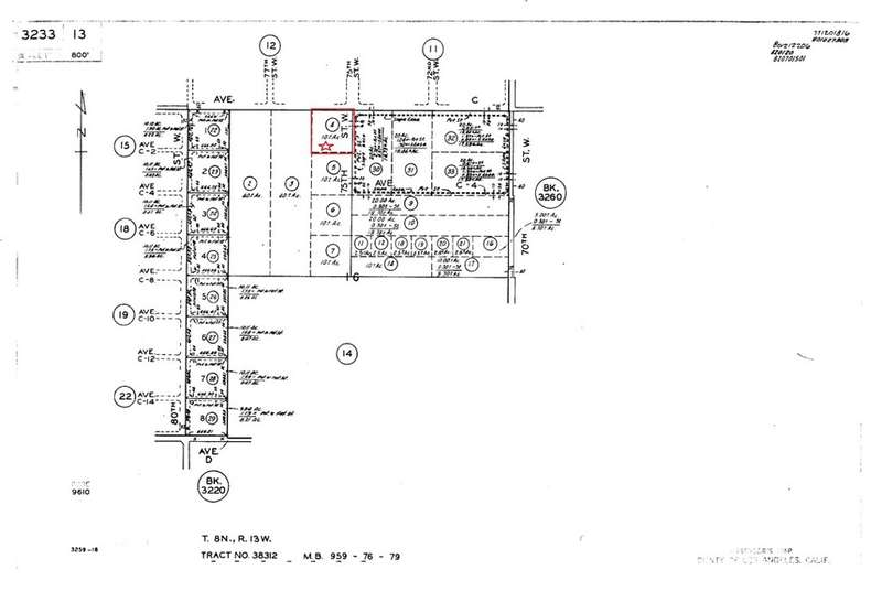 10.1 Acre fronting W. Ave C + 75th ST. W. located in west Lancaster, Los Angeles County. This land is on south side of W. Ave C, the land is square in shape, topography is flat. APN#3233-013-004; Water: On 80th St. W + AVE C or Drill a Well ; Zoning: LCA121/2*;