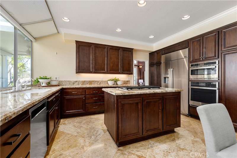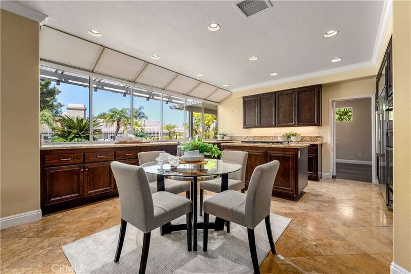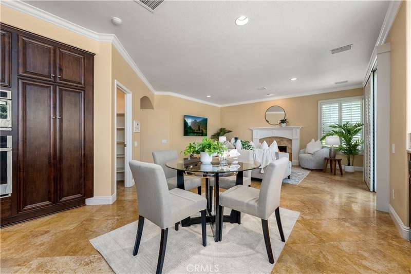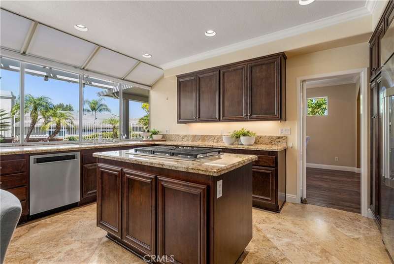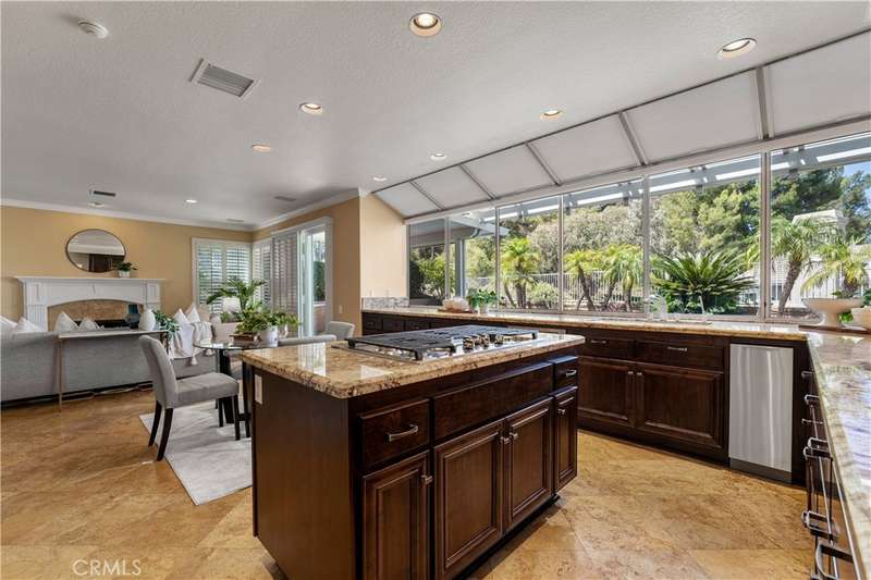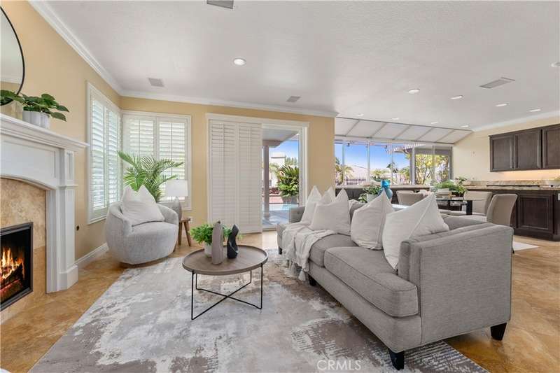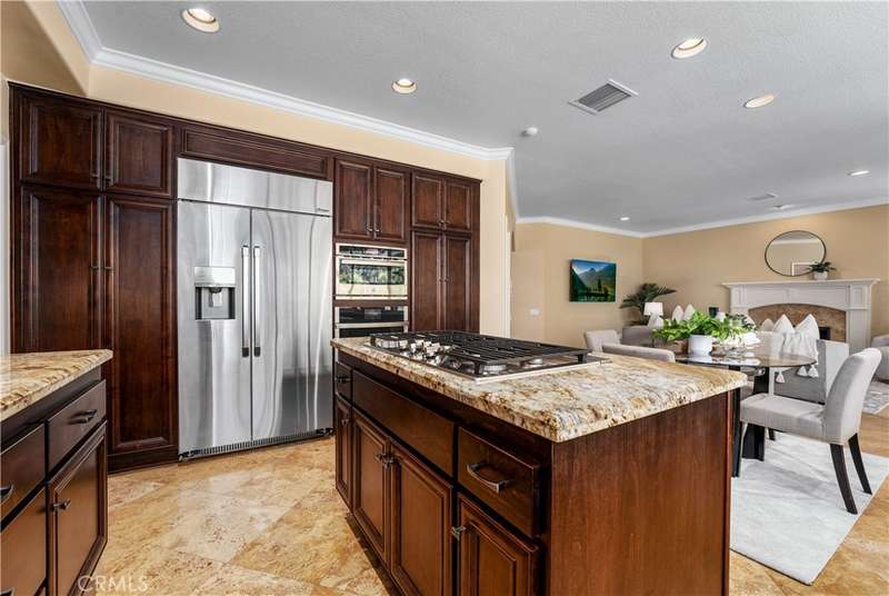At the heart of the home, the expansive kitchen is designed for both daily living and entertaining. Granite countertops, stainless steel appliances, built-in refrigerator, 5-burner cooktop, and walk-in pantry provide everything a chef could want. The oversized bay window floods the space with natural light while overlooking the sparkling pool. Just beyond, the inviting family room with fireplace offers the perfect place to gather, with sliding glass doors leading to the backyard oasis.