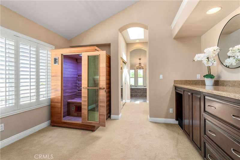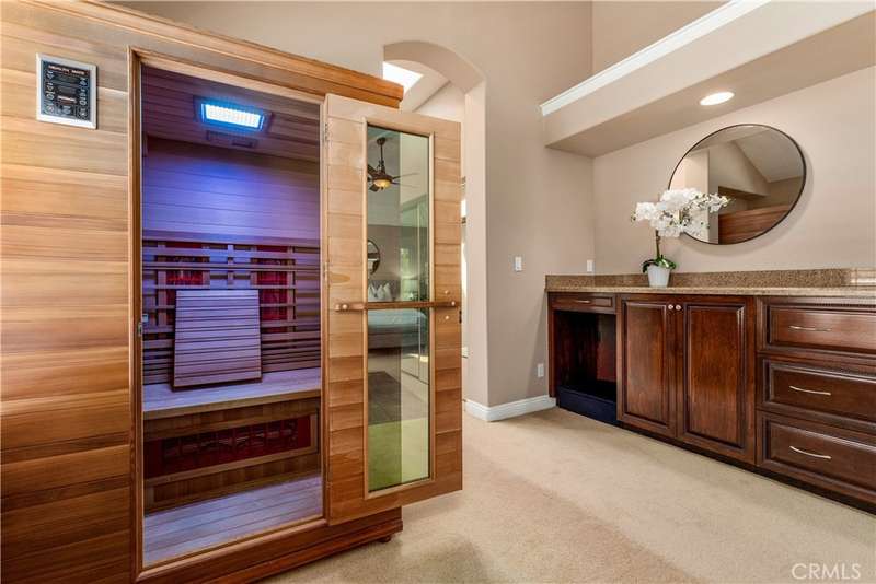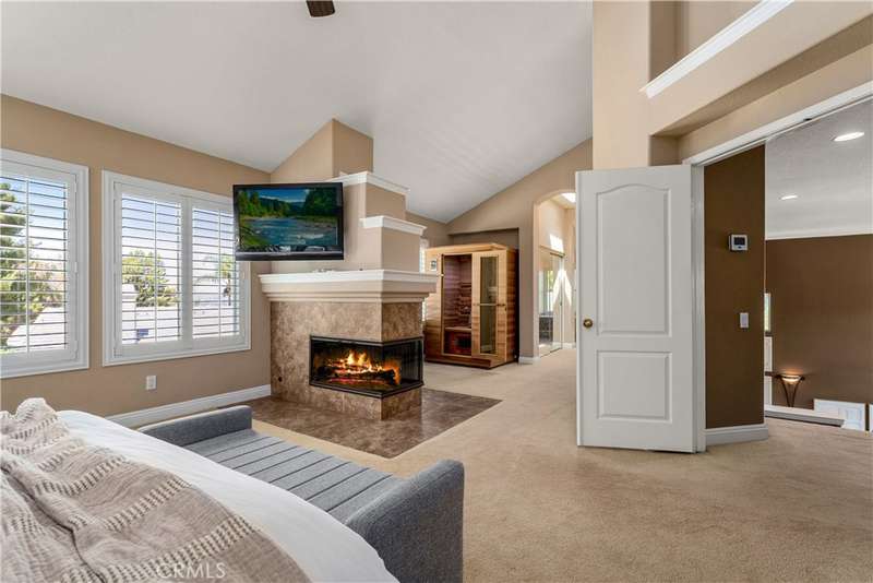 Upstairs, the primary suite is a private retreat all its own. Double doors open to a spacious sanctuary with fireplace, sitting area, infrared sauna, dual walk-in closets, and spa-inspired bath with dual sinks, walk-in shower, and jetted tub. Three additional bedrooms complete the upper level--two connected by a Jack & Jill bath, one with a balcony to enjoy evening breezes, and another with a large walk-in closet and mirrored wardrobe doors.