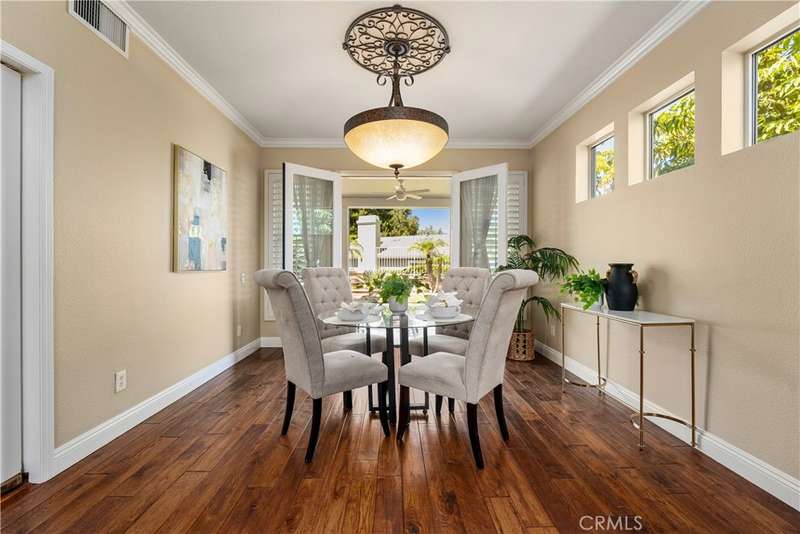 To your right, the formal living room sets the tone with rich wood floors that flow seamlessly into the dining room, where French doors invite you to step outside and enjoy the beauty of the backyard. Wood shutters, crown moldings, and timeless design details add warmth and sophistication throughout.