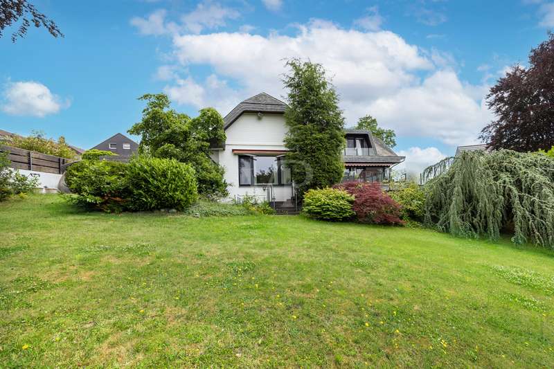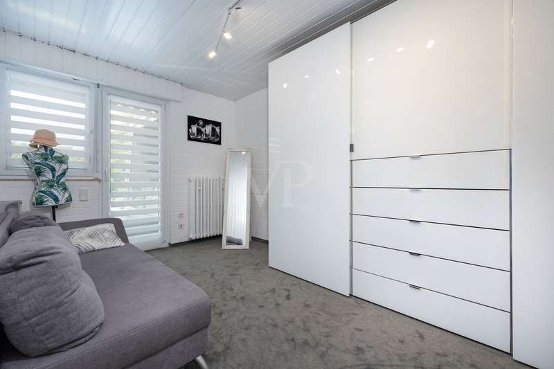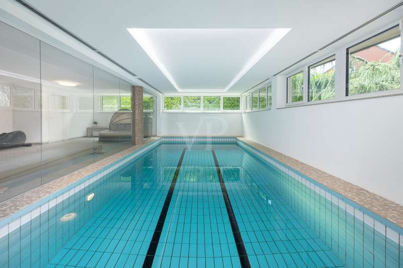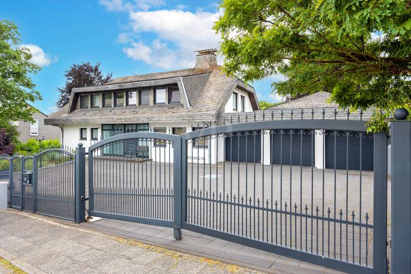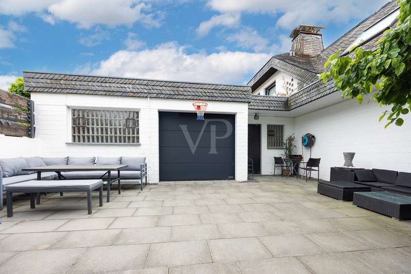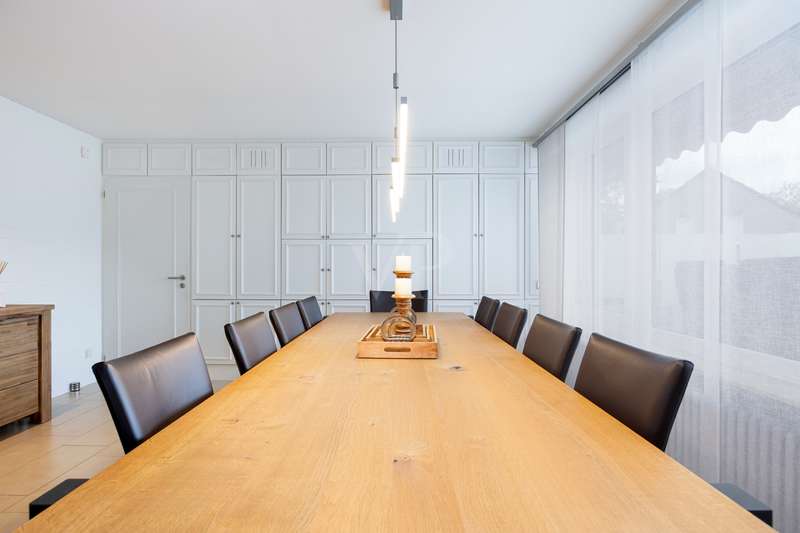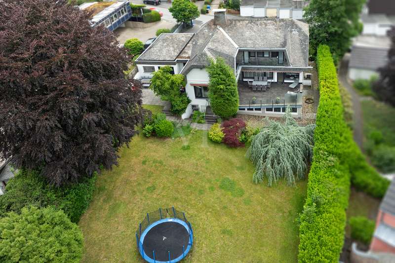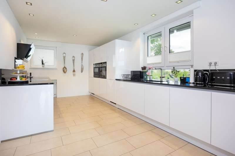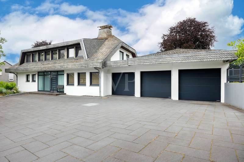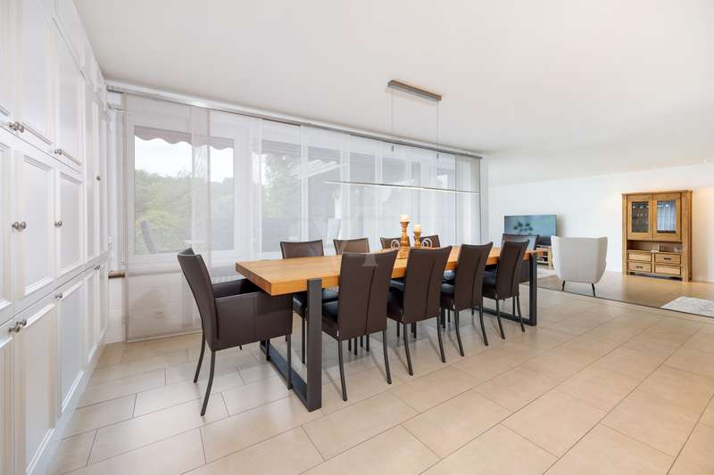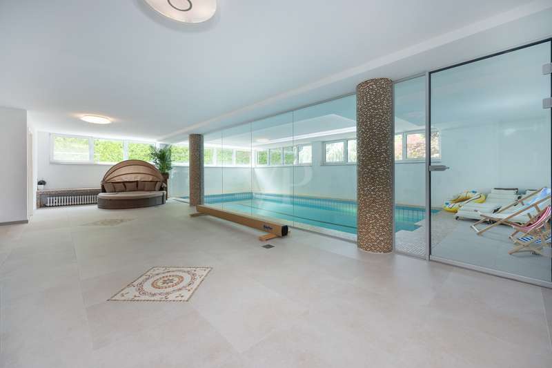 For sale is a spacious villa with a living area of approx. 285 m² on a large plot. The property, which was last extensively modernized in 2017, combines traditional design with modern amenities and meets the highest standards of living quality. Upon entering the house, you are greeted by a spacious entrance hall, from where you can access the upper floor, the cloakroom or the spacious dining and living area. The spacious living area, with fireplace, combined with a dining area offers plenty of space for sociable evenings and relaxing hours. The large window front provides a pleasant incidence of light, which bathes this area in a friendly atmosphere. Directly adjacent is the modern kitchen, which impresses with high-quality appliances and stylish furnishings and offers the ideal space for culinary delights. With five bedrooms, the house offers more than enough space for a large family or guests. Each bedroom is individually designed and furnished with high quality materials, three bedrooms have air conditioning to ensure comfort and privacy. Three fully equipped bathrooms, which were also modernized in 2017, offer modern comfort and meet high standards. High-quality tiles and fittings underline the exclusive furnishings. The condition of the detached house can be described as very well maintained. The most recent modernizations ensure that the house fully meets today's living requirements. The furnishings are of an impressively high standard and convey an excellent feeling of living. The house is heated centrally by a modern, state-of-the-art oil heating system. This ensures comfortable warmth even in colder seasons. The outside area of the house offers numerous possibilities for individual design. The spacious garden area invites you to relax, play or enjoy outdoor activities. Special highlights of the detached house are the private swimming pool and the integrated sauna in the basement. These amenities transform your home into a place of relaxation and recreation. The adjoining relaxation area invites you to leave everyday life behind and unwind. Overall, this property offers exclusive living quality combined with generous space and first-class furnishings. The location in a quiet yet well-connected area offers the ideal mix of relaxation and urban proximity. Schools, shopping facilities and public transport are just a few minutes away. It is perfect for buyers looking for a spacious and modern home. Arrange a viewing today and see the benefits of this home for yourself.
