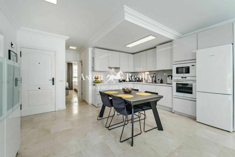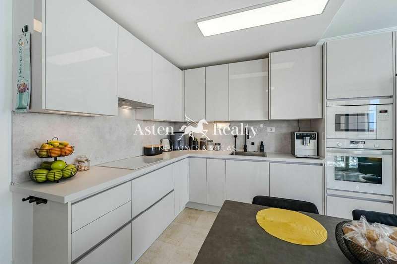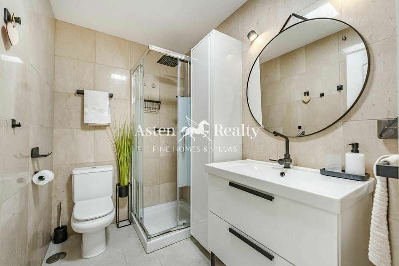 It is distributed in a bright living-dining room with its ample terrace, new open plan kitchen with high end appliances, 2 double bedrooms and 2 bathrooms (one of them en suite). A large terrace is accessed from the living room and the master bedroom. A comfortable spiral staircase leads to the upper terrace with spectacular ocean views.