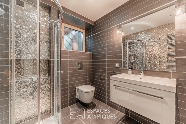 A spacious entrance hall with custom-made storage units and level access to the double garage leads to two levels. The ground floor offers 119 m2 that could easily be converted into an independent flat, offices or even premises for a healthcare professional. It comprises two 22 m2 rooms, a shower room, a fitted kitchen with access to the garden, a single garage and a 25 m2 storage area with built-in cupboards.