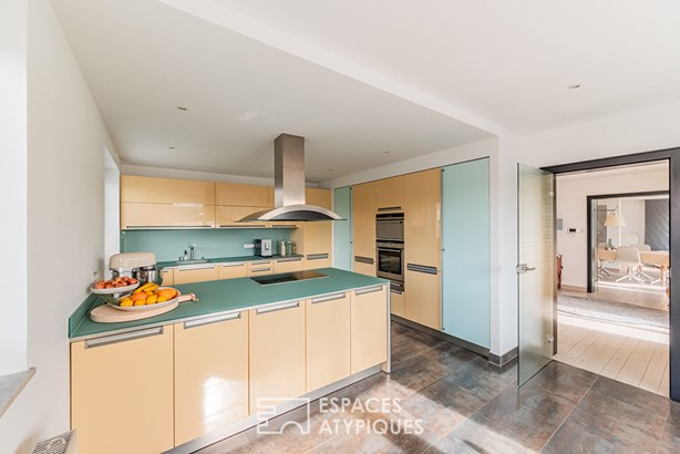 The upper level is accessed via a beautiful Carrara marble staircase that sets the tone for the living area. This floor, finished to a high standard, offers a generous 156 m2, including a 44 m2 living area. Thanks to its large picture windows, the latter enjoys an abundance of light and direct access to a pleasant south-east/south-west-facing IPE terrace. In its extension, several other terraces in a row and a beautiful garden planted with trees, designed by a landscape architect, offer a glimpse of beautiful moments of relaxation out of sight. The separate kitchen is fully equipped and also connects to the main terrace.