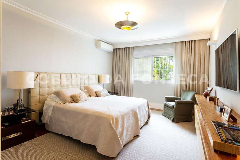 Excelente casa em localização privilegiada, rua arborizada e tranquila, 734m² de terreno, 515m² de área construída, living com portas de correr que se integram ao jardim e a piscina, espaço gourmet, sala de estar, home theater com lareira, sala de jantar, escritório, lavabo, espaço gourmet com churrasqueira, piscina, sauna, copa cozinha, piso superior, suíte master com dois closet senhor e senhora, banheiro c/duas cubas e desembaçador no espelho, 1 suíte americana, 1 suíte com closet, ar condicionado, sistema de som em toda área social. Pronta parar morar, visitas exclusivas!