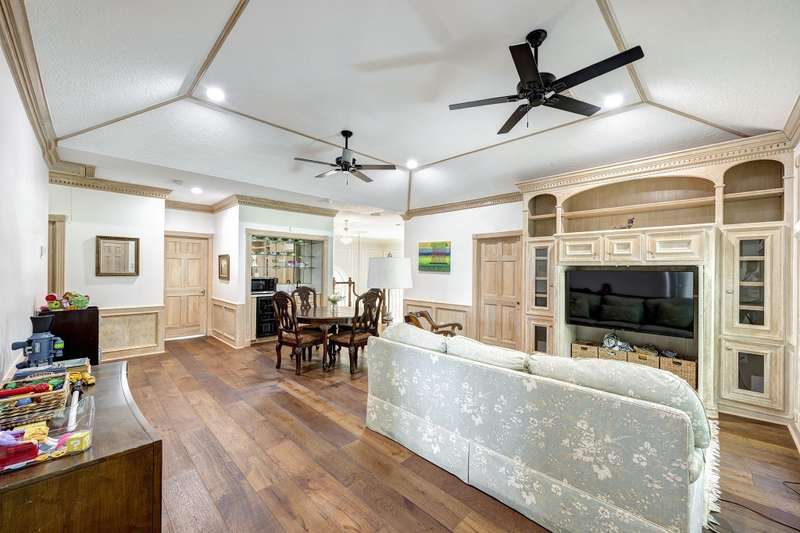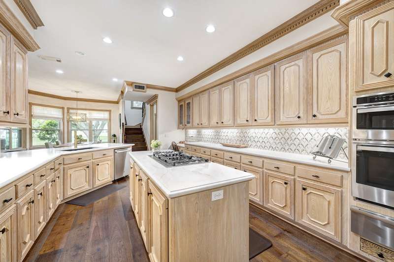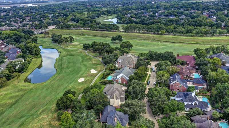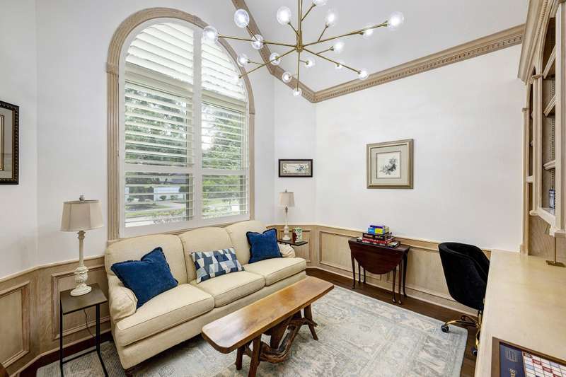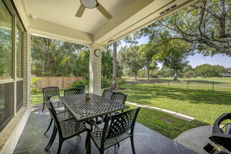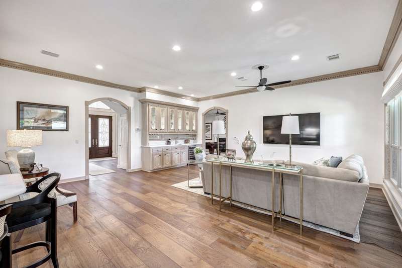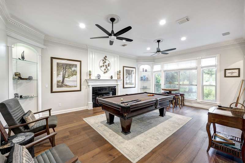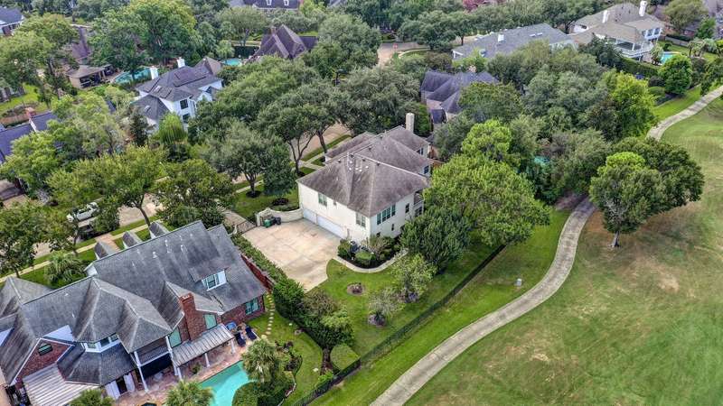 Enjoy gorgeous views of Bay Oaks Golf Course’s 5th hole from this beautifully renovated estate, completed in 2024–2025 with new floors, windows, and updated kitchen and baths. A two-story foyer with winding staircase opens to an office with cathedral ceilings and built-ins, while elegant dentil moldings and fine woodwork add timeless detail. Features include a formal living with fireplace, formal dining with china/crystal storage, oversized den with wet bar overlooking the golf course, and an island kitchen with an ideal layout for entertaining. Upstairs offers a luxurious primary suite with jetted tub and walk-in shower, a gameroom with wet bar and balcony, a second primary suite, and three oversized guest rooms with en-suite or Jack & Jill baths. Outside, a gated motor court leads to a three-car air-conditioned garage with workshop and a pool-sized yard, all within close proximity to the country club, pool, and tennis courts. All info per Seller.