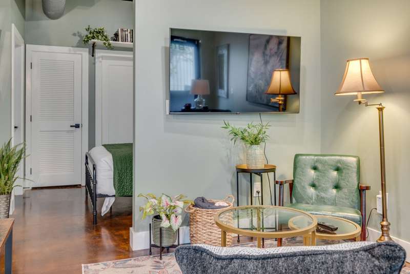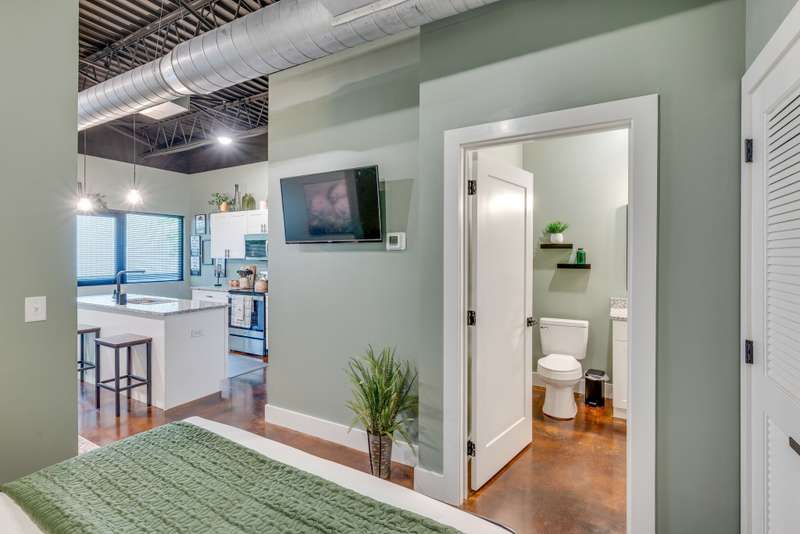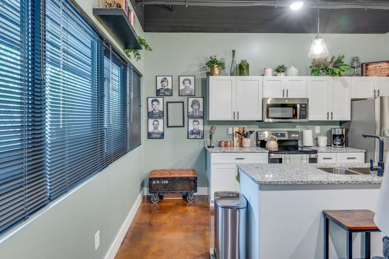 Awesome, superior, stylish end-unit condo! Convenient to BNA (3-4 minutes) and only 9 minutes to downtown Nashville. Contemporary with an industrial flair, gorgeous stained and polished floors, soft sage walls; two Smart TV's included. Extra large closet and very roomy bath. The full laundry room includes washer/dryer. Kitchen is open and fun for entertaining, with lots of natural light. Fully gutted and built out in 2023. There is a sweet fenced dog park yards away across the parking lot. A central courtyard has grill - room to toss a frisbee to you dog! Non-0ccupied owner short term rental permits allowed.