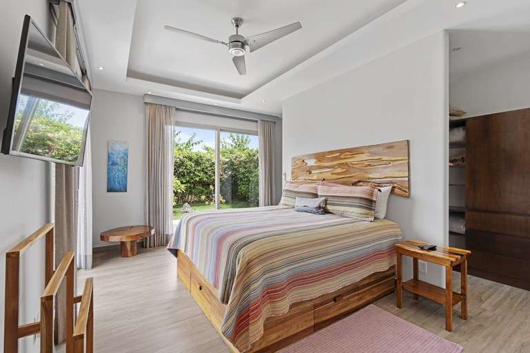 The principal bedroom offers its own private patio and garden, generous closet space, and an en-suite bathroom with double vanities and high-end tile finishes. The second and third bedrooms are equally spacious, each with a king-sized bed and sliding glass doors that open directly to the courtyard and pool. Other features include dual office stations, a laundry room with side-by-side washer/dryer, an attached garage, and oversized 8-foot doors throughout the home.