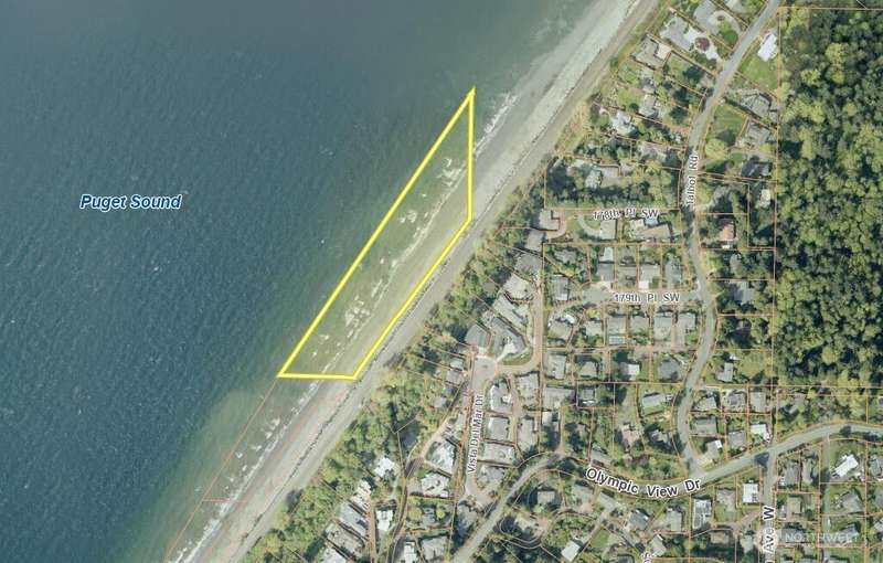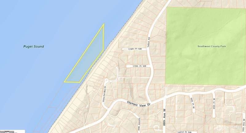 A unique opportunity to own nearly 5 acres (209,524 sq ft) of vacant tidal land in the Perrinville area of Edmonds, Snohomish County. Located near the railroad tracks and 181st St SW, this expansive parcel offers water access only and is surrounded by the natural beauty of Puget Sound. Zoned RSW-12 (Single-Family Residential), this property presents potential long-term value for conservation, recreation, or creative future use—buyer to verify. Enjoy peaceful views and a serene coastal environment, all within walking distance to local amenities. A rare slice of Edmonds is waiting for your vision! Buyer to verify to their satisfaction due diligence and verify all Subject Property & Tideland info.