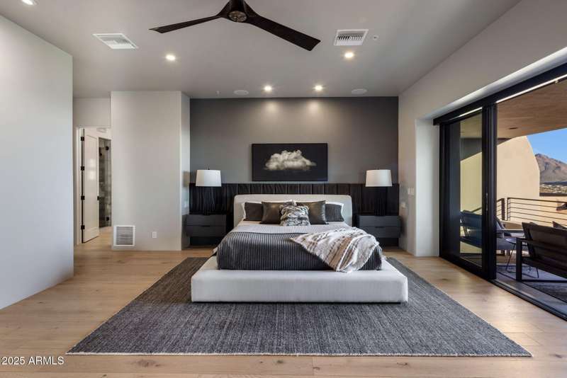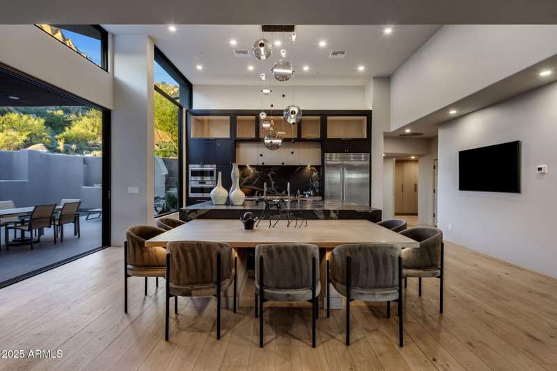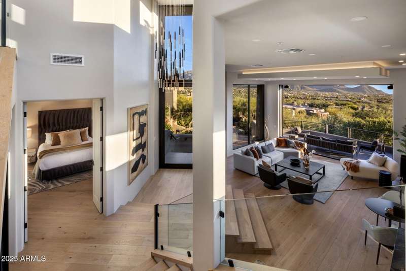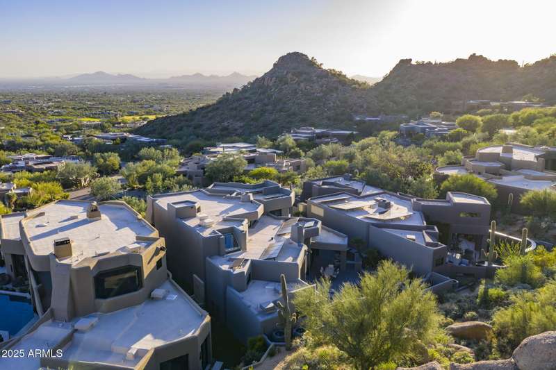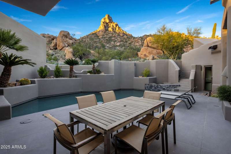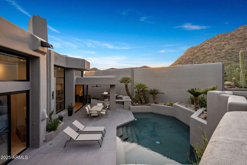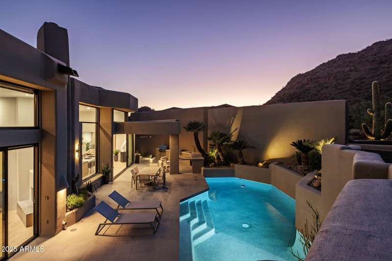 Situated in Desert Highlands coveted Hillside Villas, this spectacular custom home sits high on the side of Pinnacle Peak, showcasing some of the most captivating panoramic city-light and mountain views in North Scottsdale. Rebuilt in 2023, this modern retreat blends contemporary design with desert serenity, creating an unforgettable living experience. Every detail of craftsmanship exudes quality, dramatic design, and timeless sophistication. Within this guard-gated community, residents enjoy immediate golf membership and the soon-to-reopen Jack Nicklaus Signature Golf Course, debuting mid-November after a complete redesign and restoration, along with new women's locker room and a new pro shop, further elevating the world-class country club experience. Floor-to-ceiling retractable glass walls dissolve the boundary between indoors and out, while curated finishes include a gourmet kitchen, glass-enclosed wine display, elevator, Sonos sound system, and owned solar. The thoughtful layout features dual primary suites, a third ensuite, and a versatile flex space ideal for an office, gym, or media lounge. From every corner of this residence, you'll find the perfect ambiance for both intimate gatherings and grand entertaining. Ideal as a full-time haven or a low-maintenance retreat, this home embodies modern desert living at its most inspired where architecture, lifestyle, and landscape exist in perfect harmony.