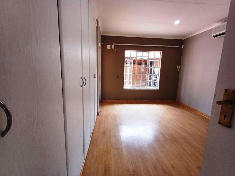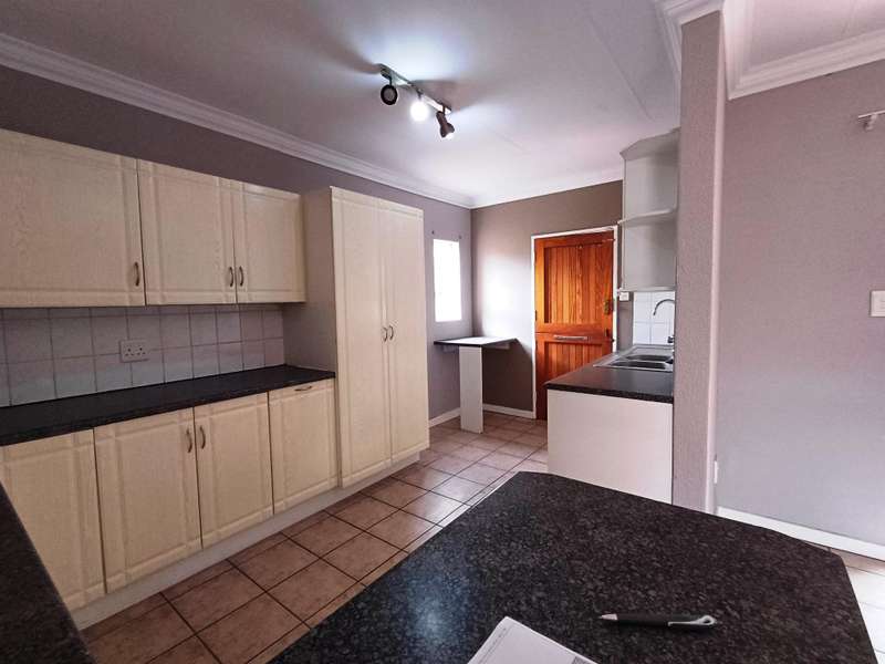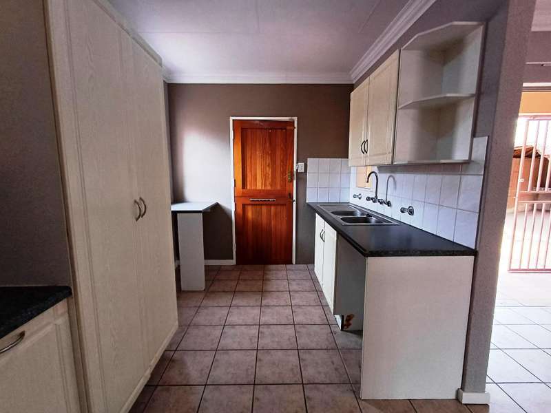Open plan kitchen with melamine counter tops, hob, under counter oven, pantry cupboard as well as a small breakfast nook.