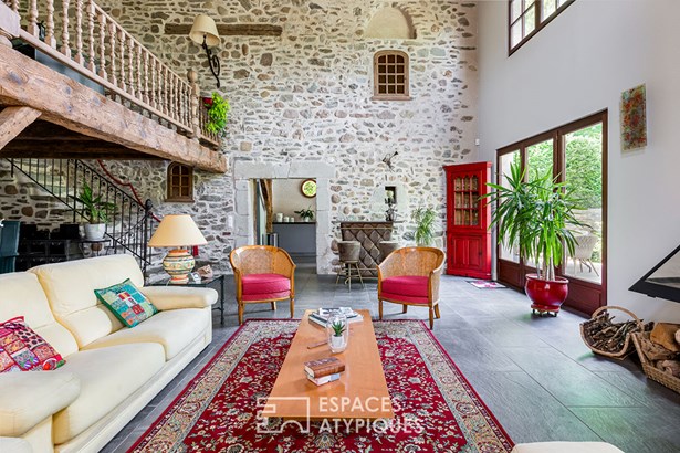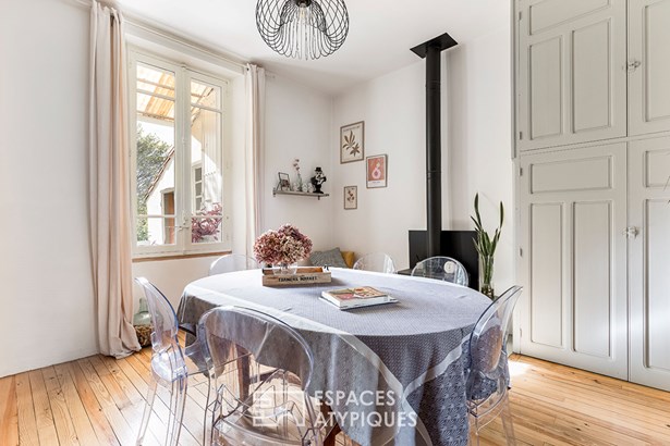 Upon entering, a first living room with a wood-burning stove welcomes guests into a serene and warm atmosphere. Beyond this, the perfectly defined kitchen and dining room enjoy beautiful views of the garden from their large windows.