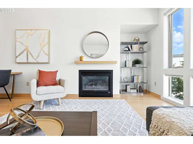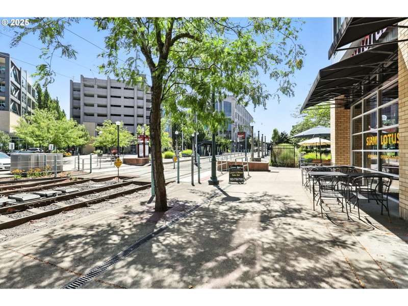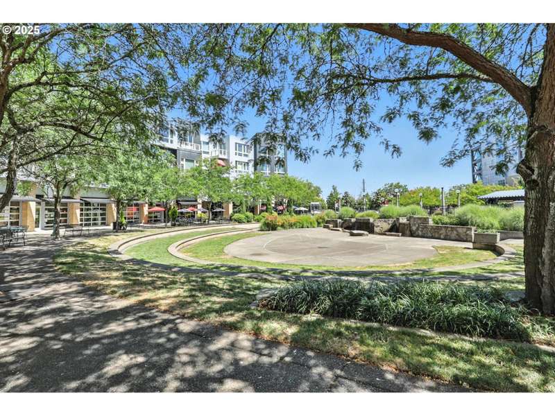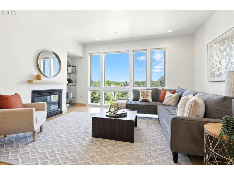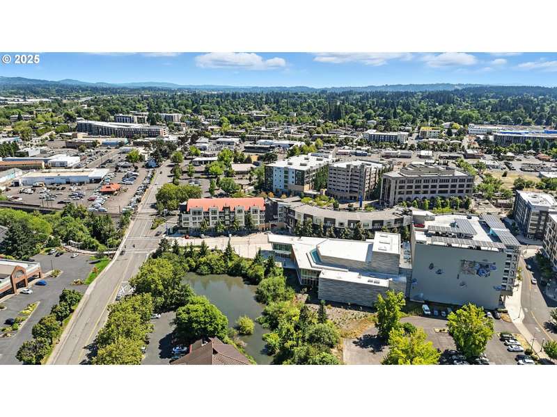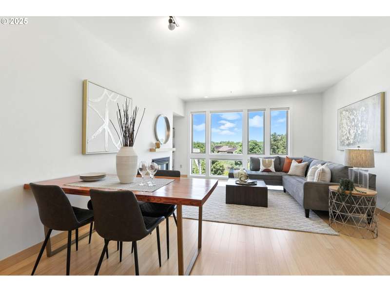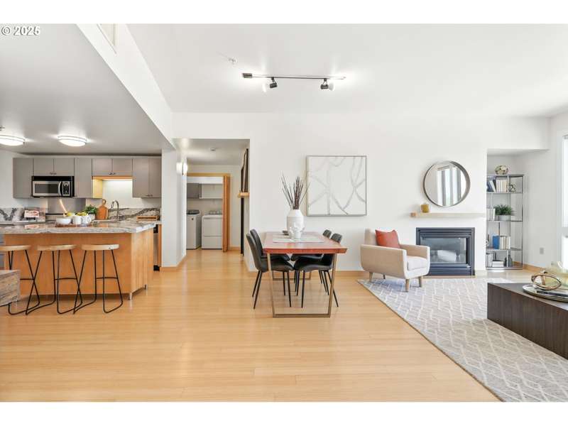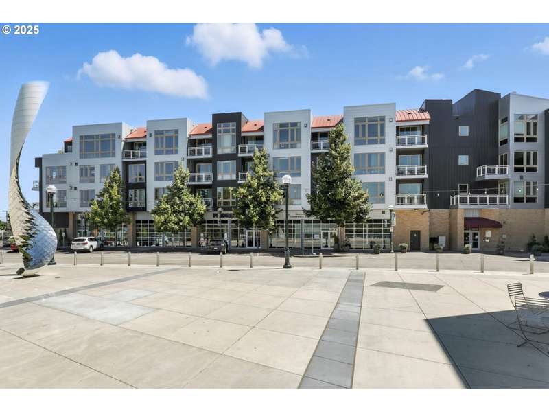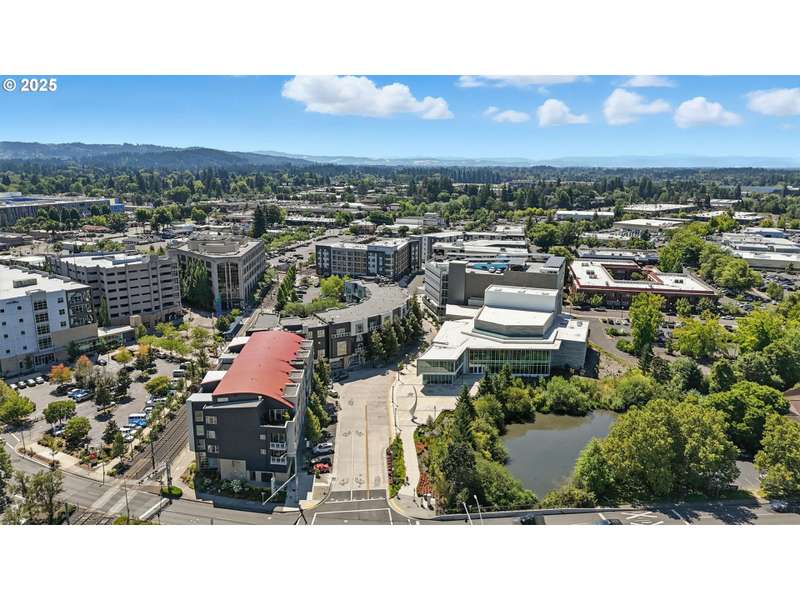 Located in the heart of downtown Beaverton,in a secure building, this hard to come by, true two-bedroom two bathroom condo, all on one level offers an exceptional lifestyle just steps from everything The Round has to offer—including Brickhaus Coffee,Asian Kitchen,Mingo,boutique shops,food carts nearby,& more.With a Walk Score of 97 & a Bike Score of 84,convenience&community are right at your doorstep.Enjoy one of a kind serene territorial views out all windows overlooking Beaverton Creek with its duck visitors,the iconic public art sculpture,& the Reser Center for the Arts.The home features bamboo flooring throughout & tall ceilings that enhance the sense of space.The spacious living area is bathed in natural light from a wall of windows equipped with motorized blinds,& includes a gas fireplace with a mantle for cozy evenings.The gourmet kitchen is designed for both beauty&function,featuring slab granite countertops, a stainless steel farmhouse sink, Viking stove,stainless appliances,a pantry, custom pull-out shelving in all cabinets,& a generous island for entertaining. The expansive primary suite offers floor-to-ceiling windows with custom motorized shades,a large walk-in closet,linen shelving, & an en suite bathroom with dual sinks, tile flooring, & a tile-surround tub/shower. The second bedroom on the opposite side of the condo for privacy features sliding doors to a private patio & easy access to a second full bathroom with similar high-end finishes.A separate laundry room includes built-in cabinets & shelving for added convenience.Additional features include new interior paint,a heat pump for efficient heating and cooling,in-unit washer and dryer, & secured assigned parking in the parking garage.Ideally situated near the MAX light rail,major highways, shopping,restaurants,breweries,& seasonal events. HOA dues cover everything except electricity, offering worry-free living in a vibrant, walkable neighborhood.