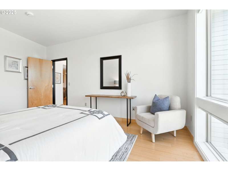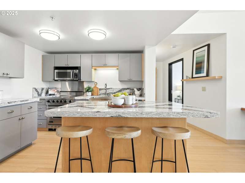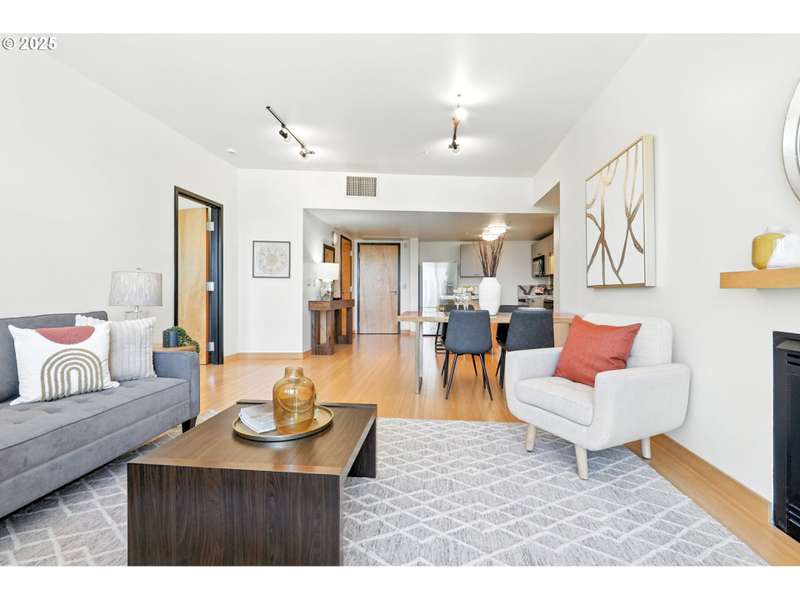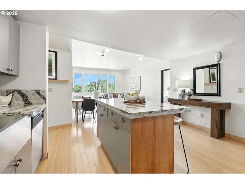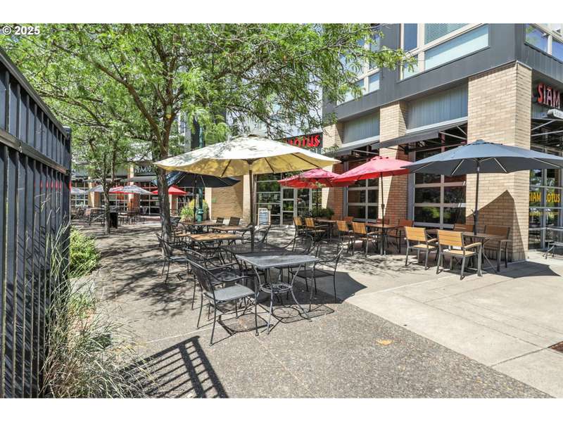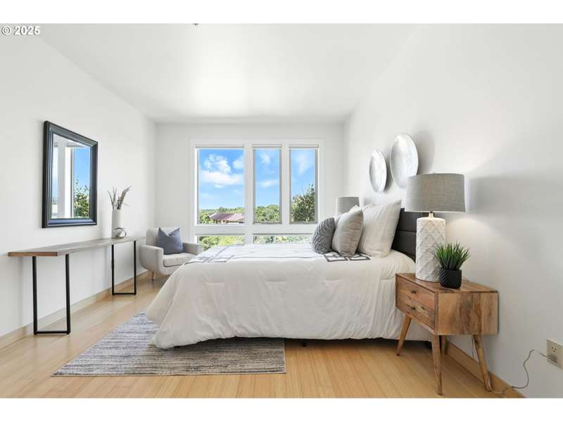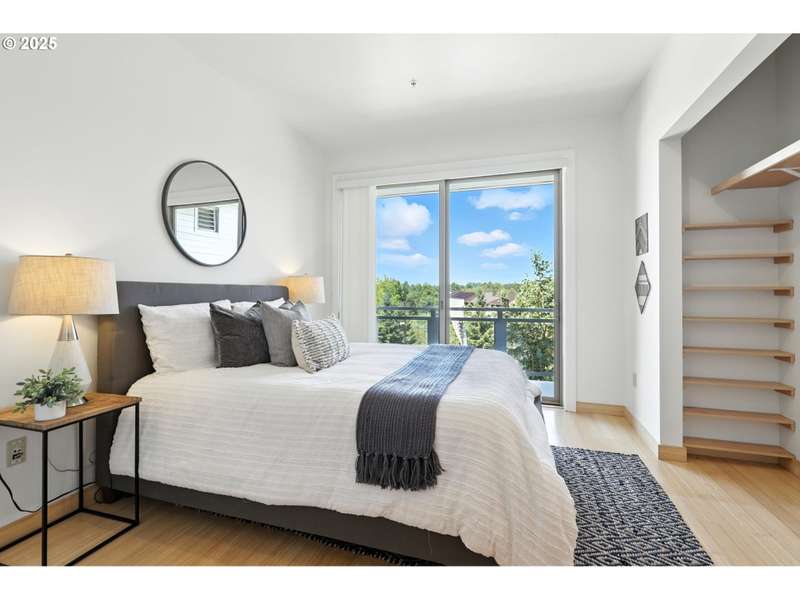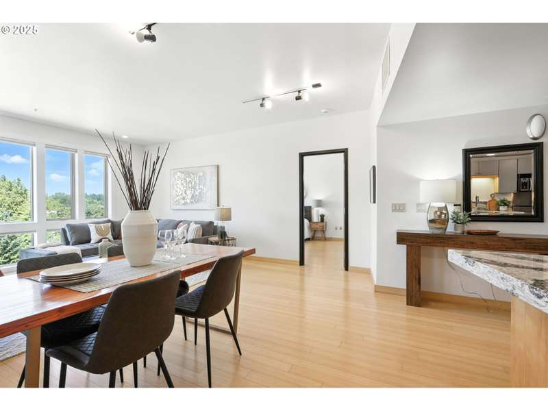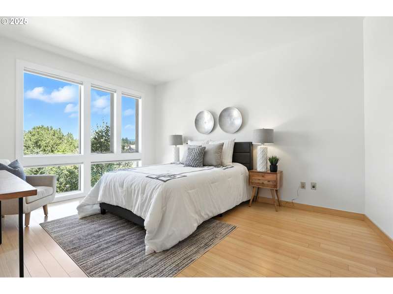 Located in the heart of downtown Beaverton,in a secure building, this hard to come by, true two-bedroom two bathroom condo, all on one level offers an exceptional lifestyle just steps from everything The Round has to offer—including Brickhaus Coffee,Asian Kitchen,Mingo,boutique shops,food carts nearby,& more.With a Walk Score of 97 & a Bike Score of 84,convenience&community are right at your doorstep.Enjoy one of a kind serene territorial views out all windows overlooking Beaverton Creek with its duck visitors,the iconic public art sculpture,& the Reser Center for the Arts.The home features bamboo flooring throughout & tall ceilings that enhance the sense of space.The spacious living area is bathed in natural light from a wall of windows equipped with motorized blinds,& includes a gas fireplace with a mantle for cozy evenings.The gourmet kitchen is designed for both beauty&function,featuring slab granite countertops, a stainless steel farmhouse sink, Viking stove,stainless appliances,a pantry, custom pull-out shelving in all cabinets,& a generous island for entertaining. The expansive primary suite offers floor-to-ceiling windows with custom motorized shades,a large walk-in closet,linen shelving, & an en suite bathroom with dual sinks, tile flooring, & a tile-surround tub/shower. The second bedroom on the opposite side of the condo for privacy features sliding doors to a private patio & easy access to a second full bathroom with similar high-end finishes.A separate laundry room includes built-in cabinets & shelving for added convenience.Additional features include new interior paint,a heat pump for efficient heating and cooling,in-unit washer and dryer, & secured assigned parking in the parking garage.Ideally situated near the MAX light rail,major highways, shopping,restaurants,breweries,& seasonal events. HOA dues cover everything except electricity, offering worry-free living in a vibrant, walkable neighborhood.