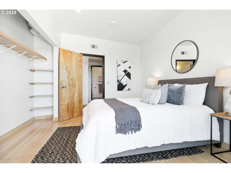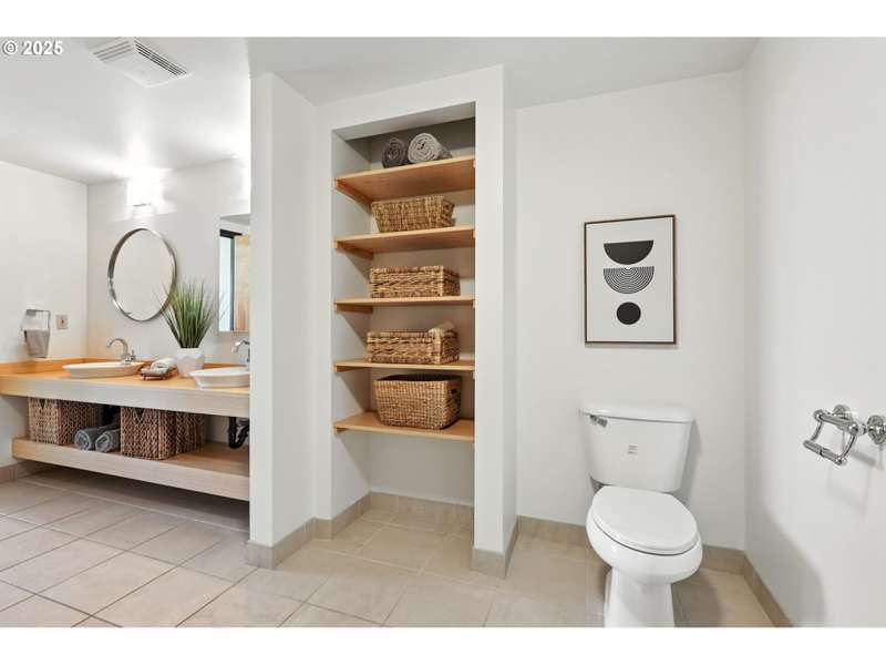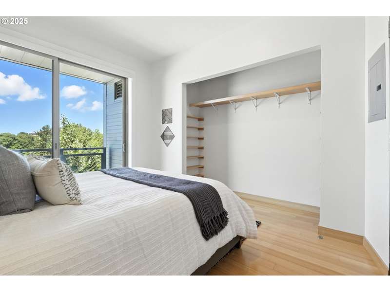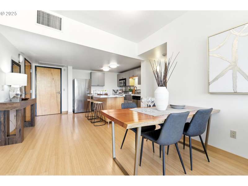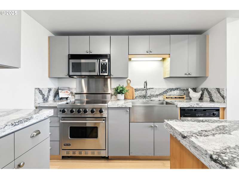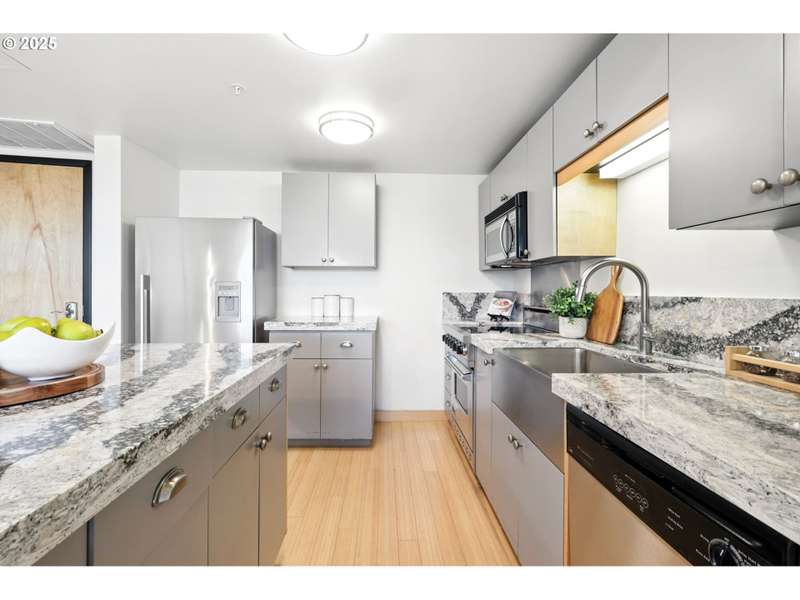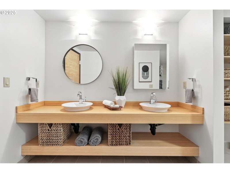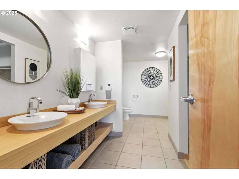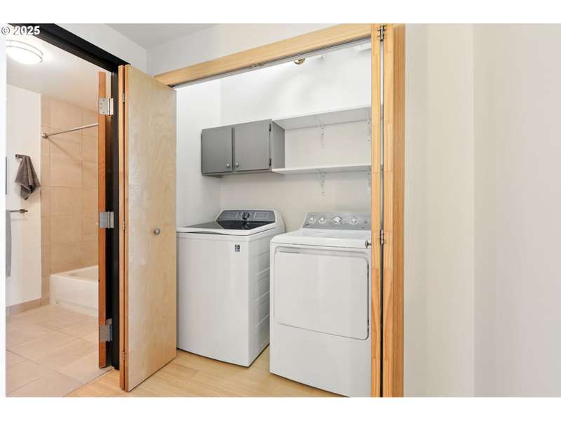 Located in the heart of downtown Beaverton,in a secure building, this hard to come by, true two-bedroom two bathroom condo, all on one level offers an exceptional lifestyle just steps from everything The Round has to offer—including Brickhaus Coffee,Asian Kitchen,Mingo,boutique shops,food carts nearby,& more.With a Walk Score of 97 & a Bike Score of 84,convenience&community are right at your doorstep.Enjoy one of a kind serene territorial views out all windows overlooking Beaverton Creek with its duck visitors,the iconic public art sculpture,& the Reser Center for the Arts.The home features bamboo flooring throughout & tall ceilings that enhance the sense of space.The spacious living area is bathed in natural light from a wall of windows equipped with motorized blinds,& includes a gas fireplace with a mantle for cozy evenings.The gourmet kitchen is designed for both beauty&function,featuring slab granite countertops, a stainless steel farmhouse sink, Viking stove,stainless appliances,a pantry, custom pull-out shelving in all cabinets,& a generous island for entertaining. The expansive primary suite offers floor-to-ceiling windows with custom motorized shades,a large walk-in closet,linen shelving, & an en suite bathroom with dual sinks, tile flooring, & a tile-surround tub/shower. The second bedroom on the opposite side of the condo for privacy features sliding doors to a private patio & easy access to a second full bathroom with similar high-end finishes.A separate laundry room includes built-in cabinets & shelving for added convenience.Additional features include new interior paint,a heat pump for efficient heating and cooling,in-unit washer and dryer, & secured assigned parking in the parking garage.Ideally situated near the MAX light rail,major highways, shopping,restaurants,breweries,& seasonal events. HOA dues cover everything except electricity, offering worry-free living in a vibrant, walkable neighborhood.