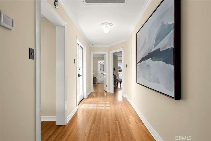 The unique U-shaped design allows nearly every room to open through French doors to a tranquil courtyard, perfect for indoor-outdoor living. The resort-style backyard features low-maintenance turf, a sparkling pool, and multiple entertaining spaces, while the deck offers breathtaking sunset views over the Whittier Hills. The front yard provides a generous grassy area, ideal for play, gardening, or simply enjoying the outdoors.