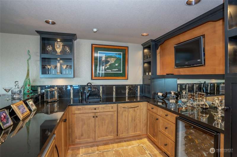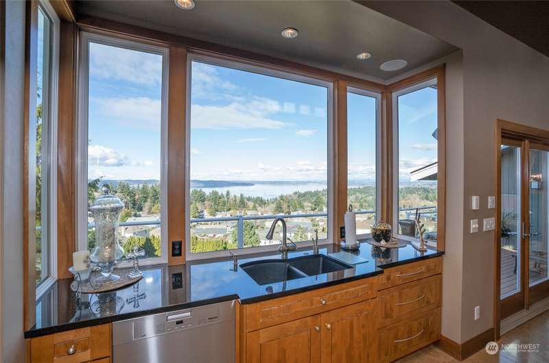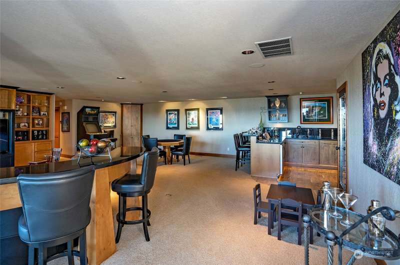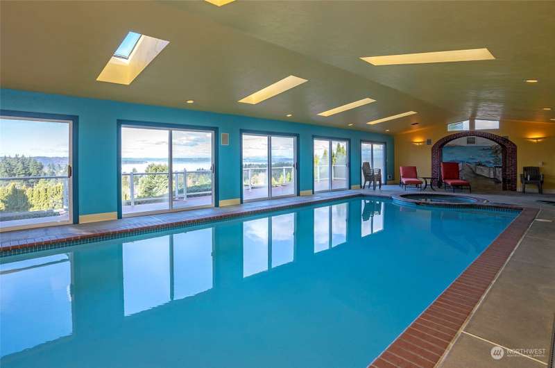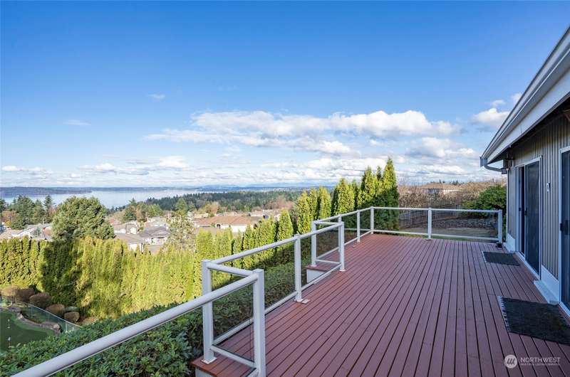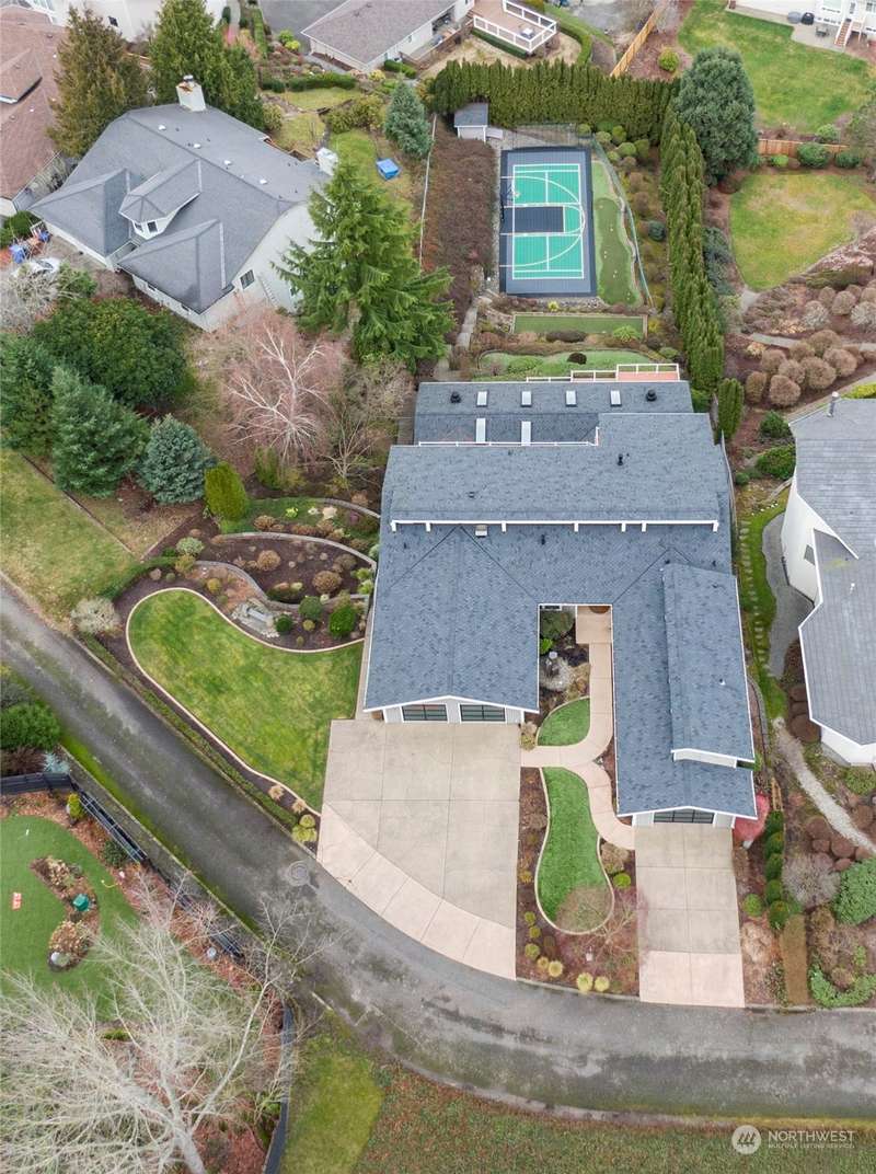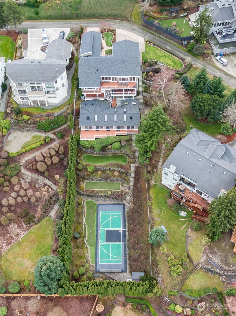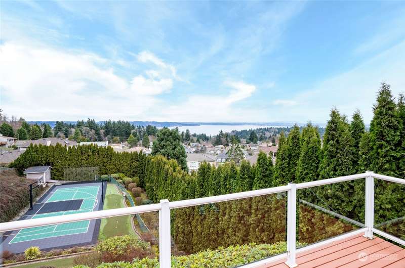 Astounding views up Puget Sound toward Seattle, perched over a pool-house, multiple decks, all-weather sport court and turf putting greens. A rare opportunity for the entertainer's dream home! Complete custom home has it all. Huge ceilings, custom millwork and cabinetry, gourmet open kitchen. An amazing primary suite with sitting room, additional laundry in the primary closet & quick access to a private garage. Upstairs offers great entertainment/dining spaces plus den w/ murphy bed and cabinetry, possible 4th bedroom. Downstairs has game room, bar, wine room, 2 beds, bath & laundry. Pool house has resort pool, hot tub, bath and sauna. Half court sports court for competition basketball/pickleball. Even a shed for the toys! Buyer to verify