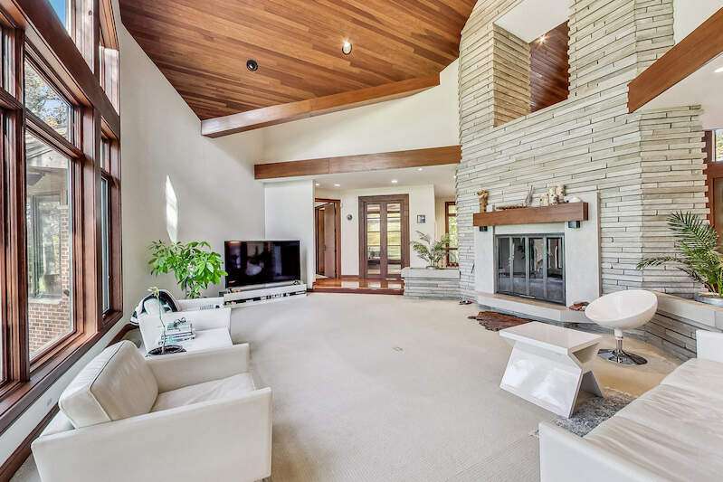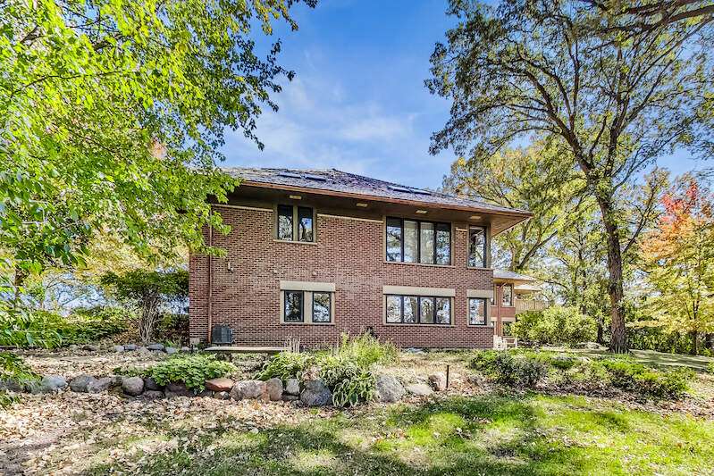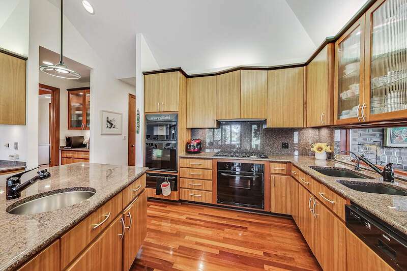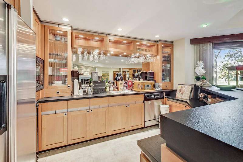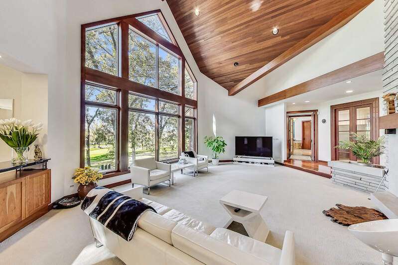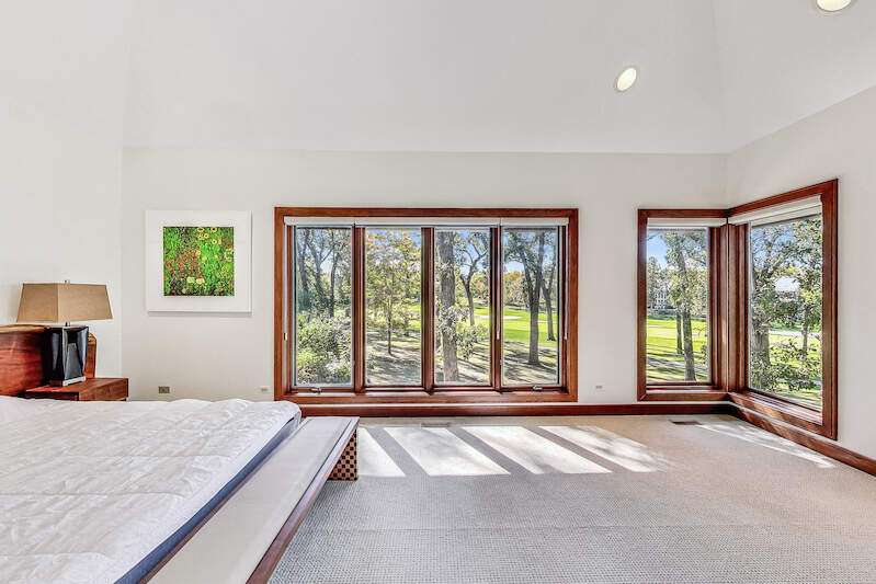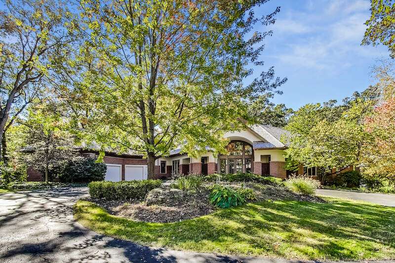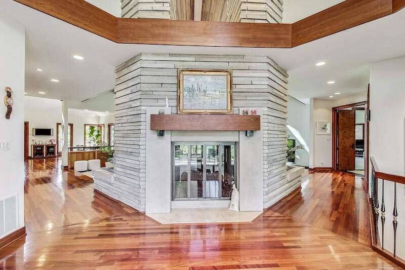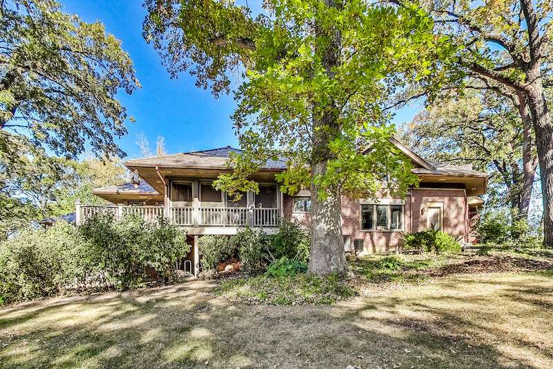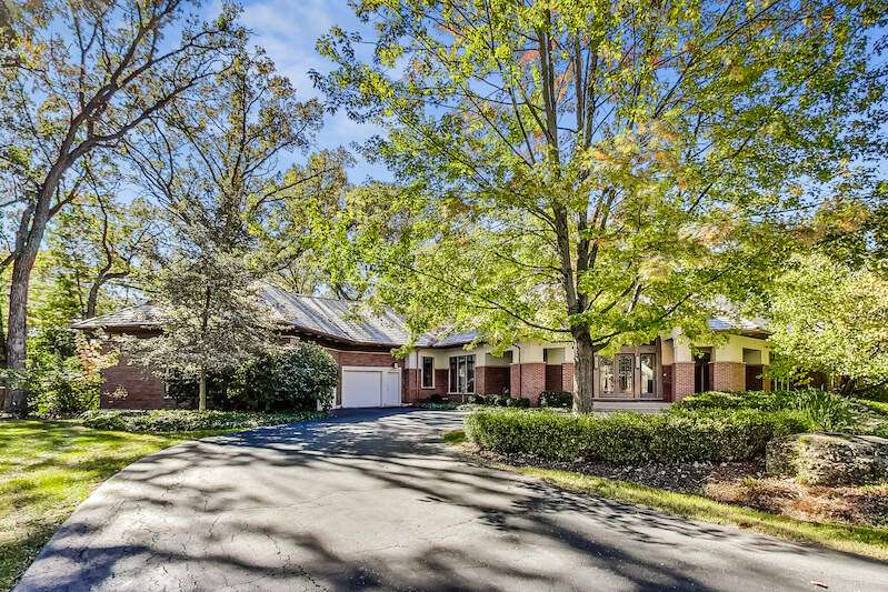 Designed by the talented and highly acclaimed architect, Ron McCormick. Iconic home situated on approximately 1.3 acres and overlooking the sweeping views of 16th fairway of Wynstone Golf Course. For those discriminating buyers desiring the finest of a unique custom built home with features including stone and woods incorporating the gorgeous oaks of outside and the contemporary oasis of the inside. One is welcomed by a dramatic entrance to almost 4000 square feet on the first floor! The layout and style of the home captures every aspect of the property.Ideal home for those seeking multi generational situation or more elegant and private guest space. Expansive primary suite on main level, blend of mid century and Frank Lloyd Wright tones in the kitchen, dining area, and great room with expensive flooring and wood touches. Upstairs provides the perfect guest quarters with living space, bedroom, and separate kitchenette area. The finished walkout emphasizes the openness of the home and highlights the floating staircase. Incredible spaciousness to entertain, enjoy the fine elements of the home, and the impressive property with towering trees. Recent HVAC replaced and one year new roof.