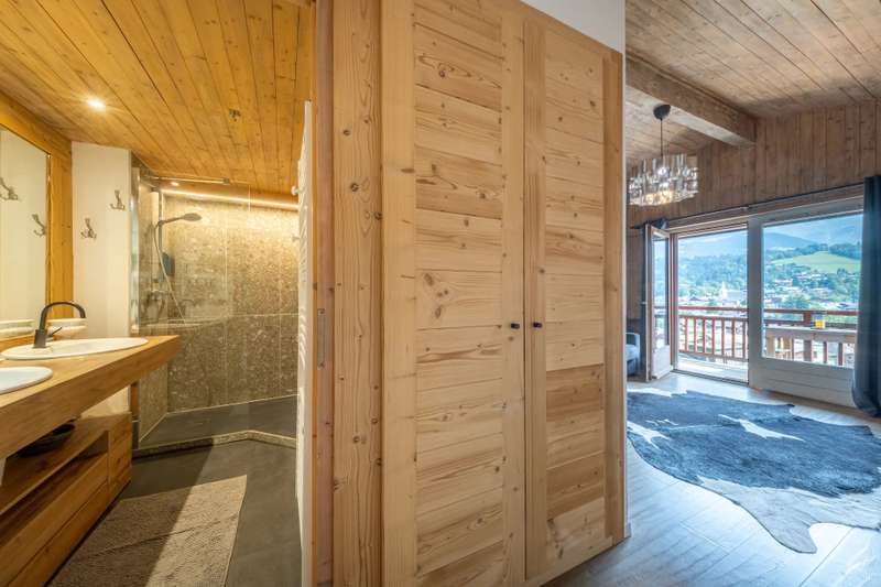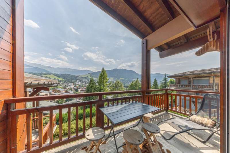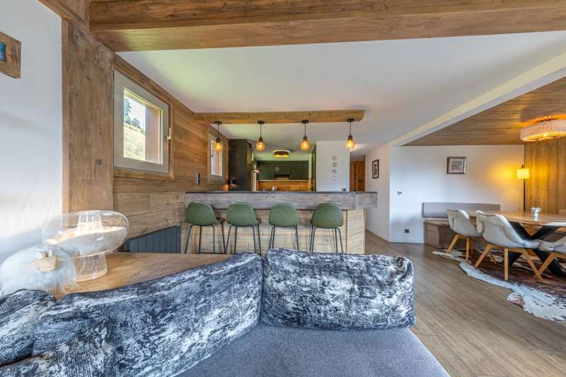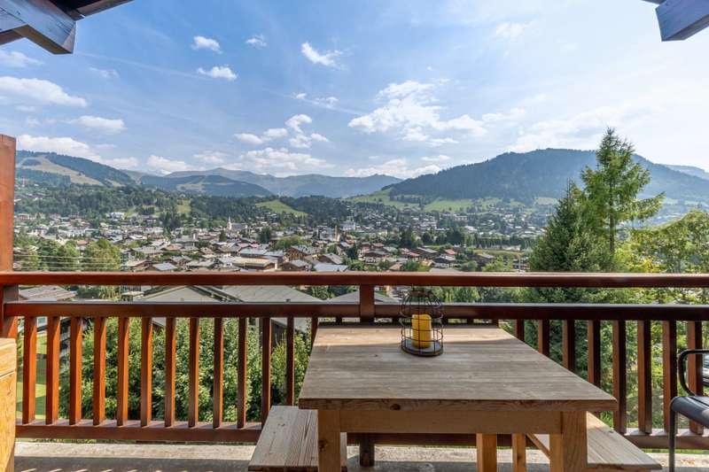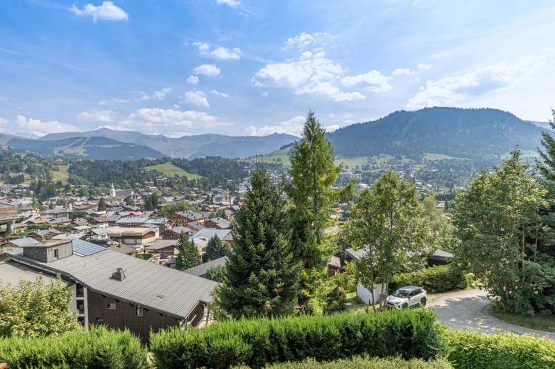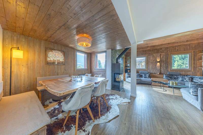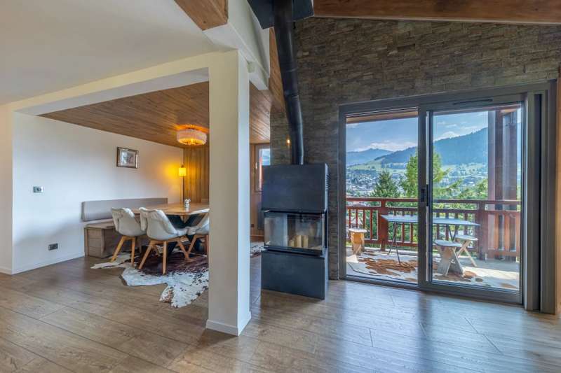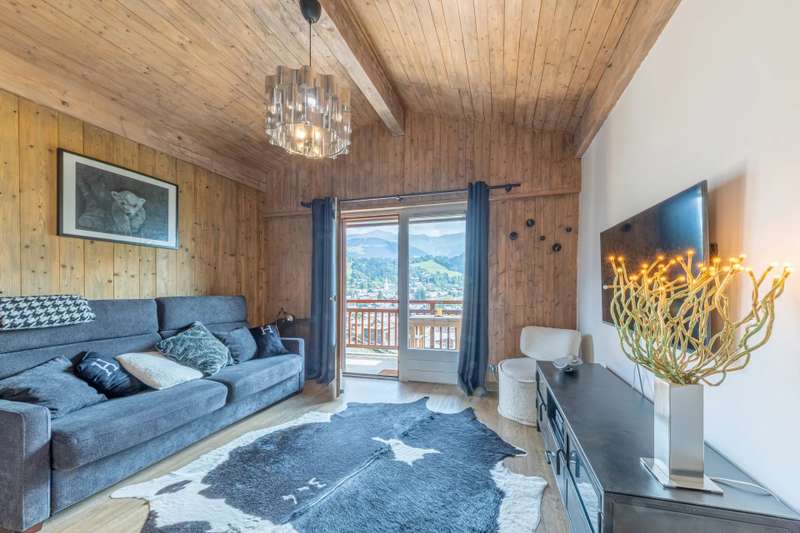 On the top floor of a perfectly maintained condominium, just a few steps from the centre of the village of Megève, this superb apartment combines comfort, elegance and exceptional views. With a surface area of 109 m² (91,6 m² Loi Carrez), it opens onto an entrance hall with storage space and guest WC. The living area, bathed in light thanks to its south-facing aspect, comprises an open-plan kitchen, a cosy dining room, and a living room with a fireplace and high ceilings. The space is extended by a corner balcony offering breathtaking views of the village and the surrounding peaks. The sleeping area comprises a large bedroom with en-suite bathroom and a second south-facing balcony. Upstairs, there is a double bedroom with an open-plan bathroom and a children's bedroom, also with its own bathroom. A very large enclosed garage, an underground parking space, two cellars and two ski lockers complete this property.