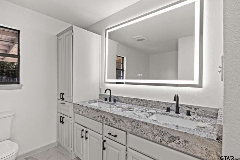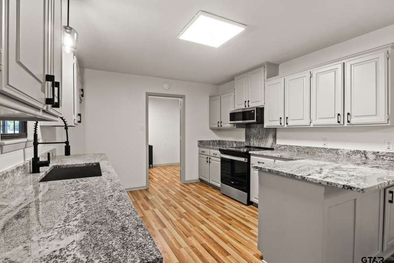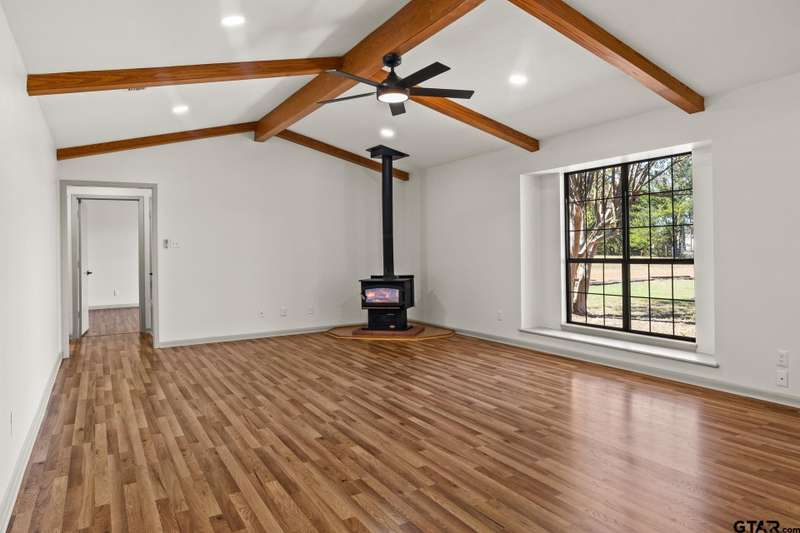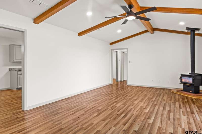 Welcome to your own slice of Texas countryside! This beautifully updated 3-bedroom, 2-bath home sits on a spacious one-acre lot surrounded by peaceful scenery, just minutes from town. With 1,680 square feet of comfortable living space, it perfectly blends classic ranch-style charm with modern updates. Step inside to find an open floor plan with vaulted ceilings, decorative lighting, and charming laminate and tile flooring throughout. The living room features a cozy freestanding wood stove, creating a warm and inviting atmosphere. The kitchen is a true showpiece with granite countertops, a breakfast bar, and plenty of built-in cabinetry—perfect for family meals or entertaining guests.