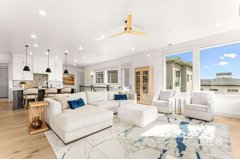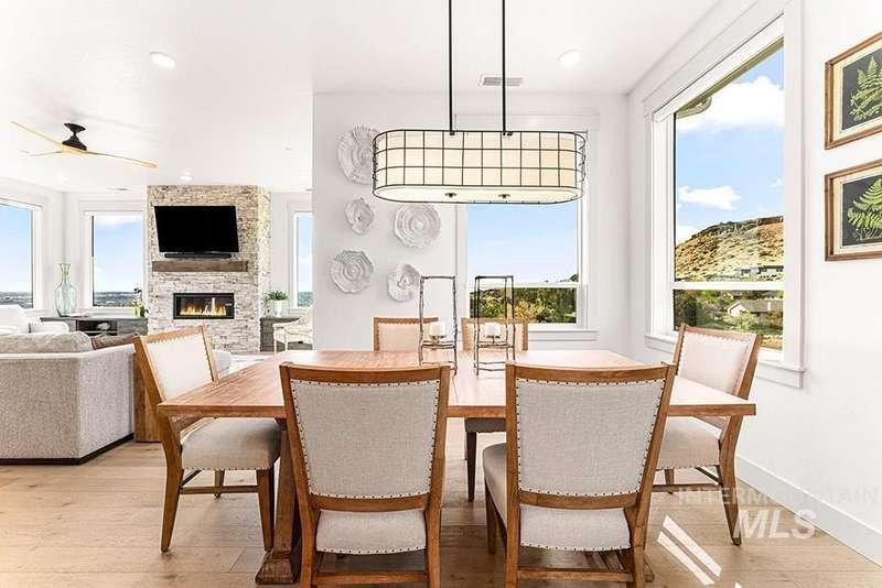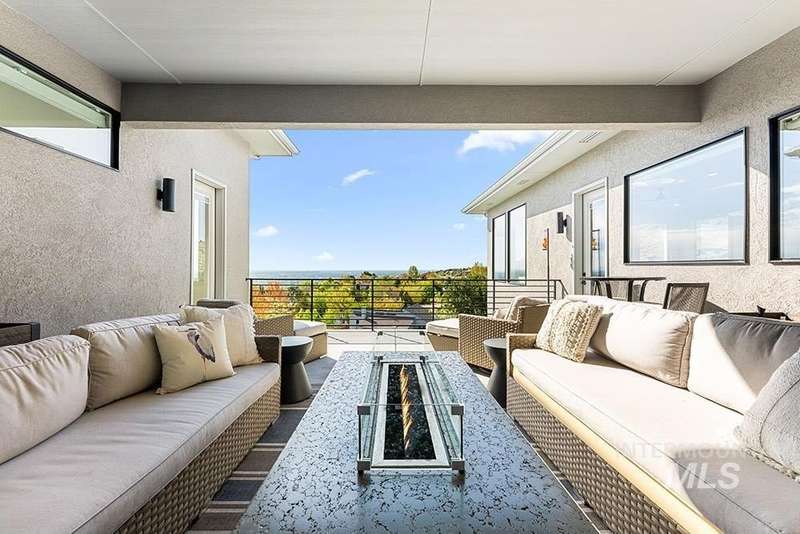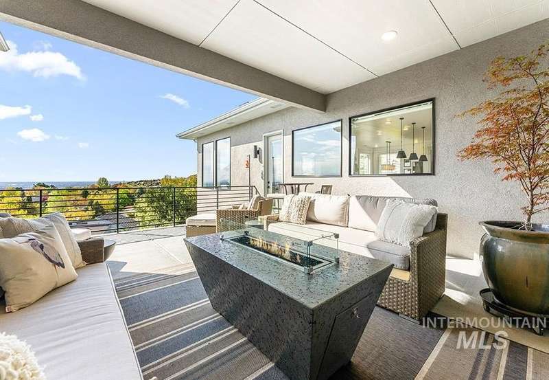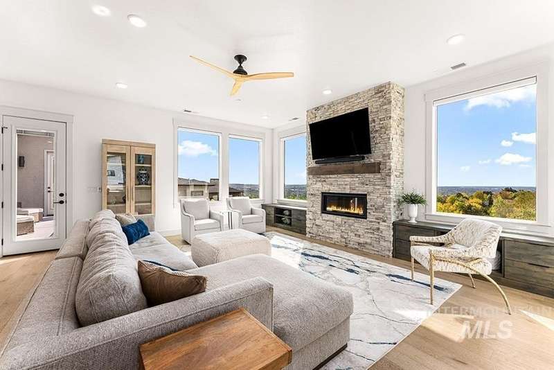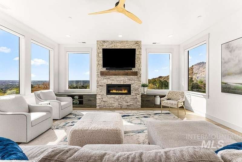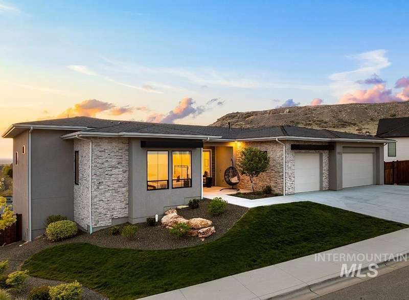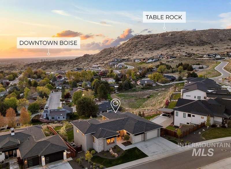 Perched on an exclusive rim-view lot in Boulder Point, this one-owner residence captures sweeping views from Table Rock to Downtown! Designed to live like a single level, the home features a walk-out lower level and a layout that seamlessly blends indoor and outdoor living. The grand foyer opens to an expansive great room with 11’ ceilings, hardwood floors, & walls of windows. The kitchen showcases floor-to-ceiling cabinetry, marbled quartz countertops, and a suite of built-in Wolf & Sub-Zero appliances. The main-level master offers private balcony access & a spa-inspired en suite bath. A fabulous guest suite completes the main level. The walk-out lower level expands the living space with a generous bonus room, additional bedrooms, & direct access to a flat lawn—perfectly suited for a future pool. Additional upgrades include Hunter Douglas automatic blinds, and an invisible pet fence. Residents enjoy access to a clubhouse, swimming pool, neighborhood trails and the best of Boise living!