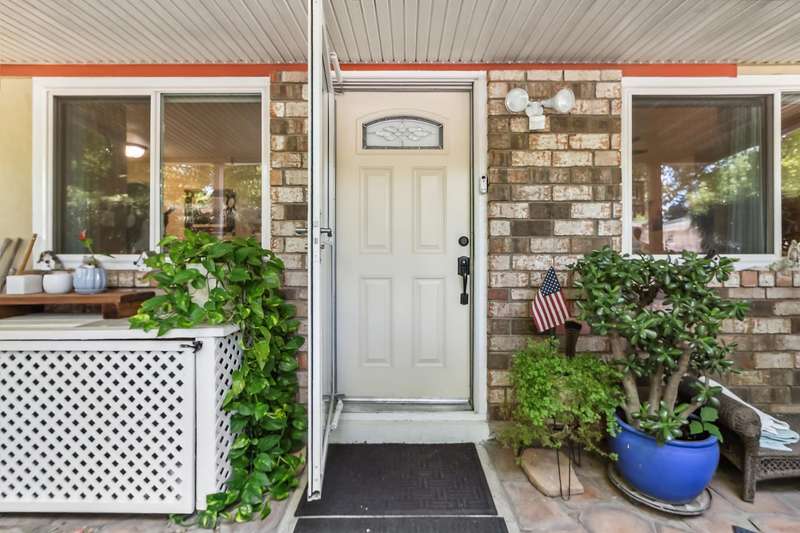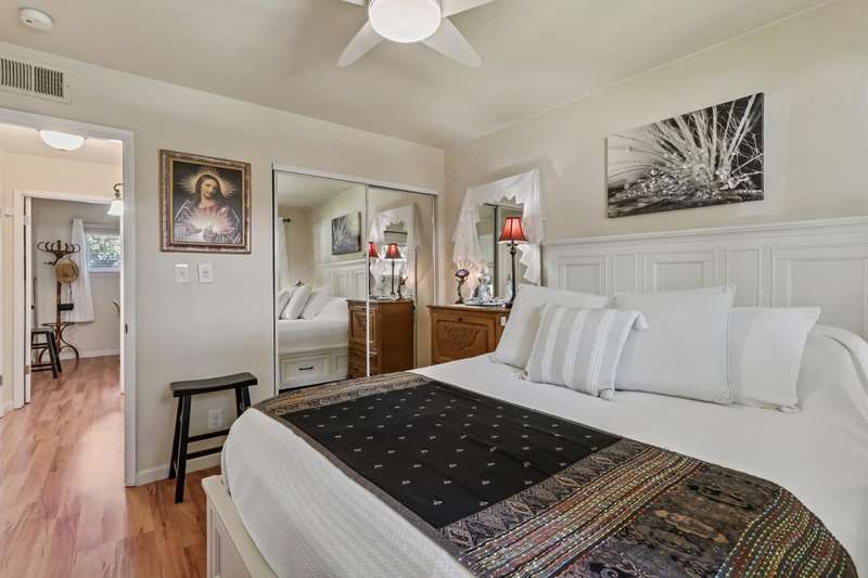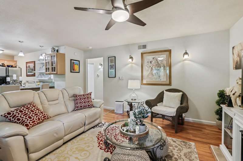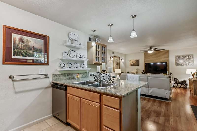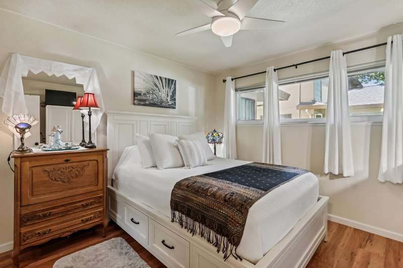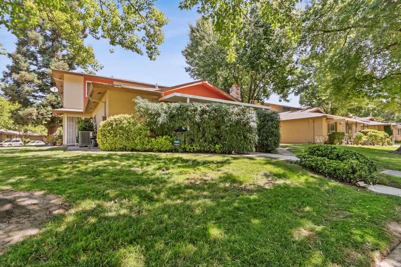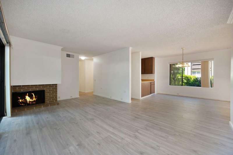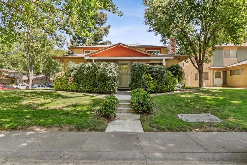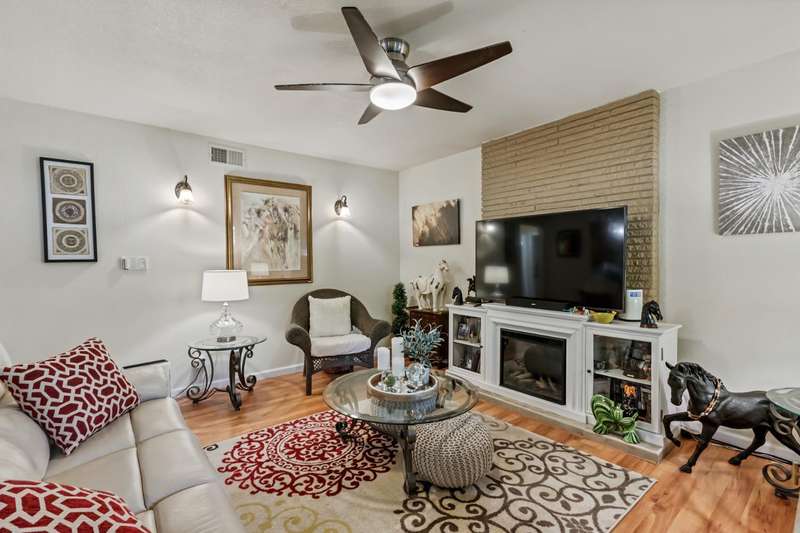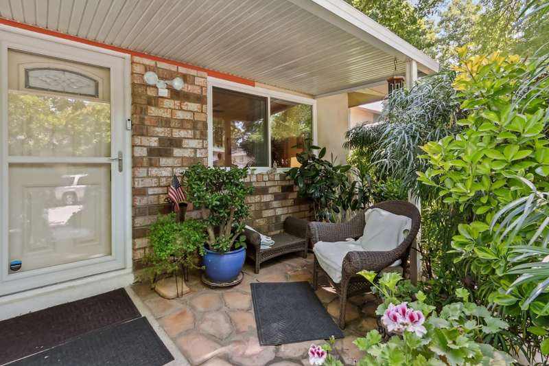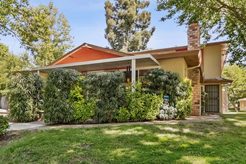 Welcome to this beautifully upgraded, street-facing, single-story bungalow-style condo in the desirable Madison Villa Estates. A charming front patio, framed by lush hedges, offers privacy and curb appeal perfect for morning coffee or evening iced tea. Inside, enjoy a light-filled layout with wood laminate floors, custom lighting, and a striking brick fireplace. The kitchen features granite counters, stainless steel appliances, rich cabinetry, and a spacious pantry. Both bedrooms include built-in dressers, matching flooring, and stylish storage, blending comfort and functionality. This rare single-level home offers seamless indoor-outdoor living near shopping, dining, parks, and major freeways. Act fast, charm, and affordability have merged, resulting in an unbelievable opportunity to own something truly special.