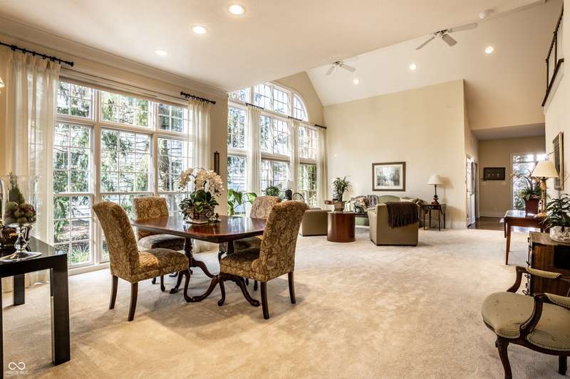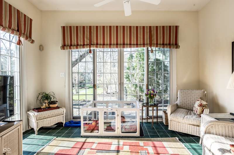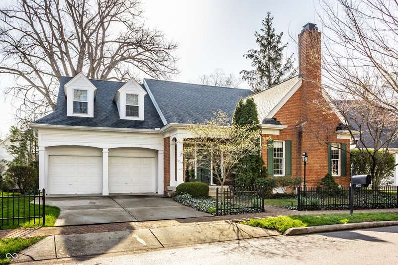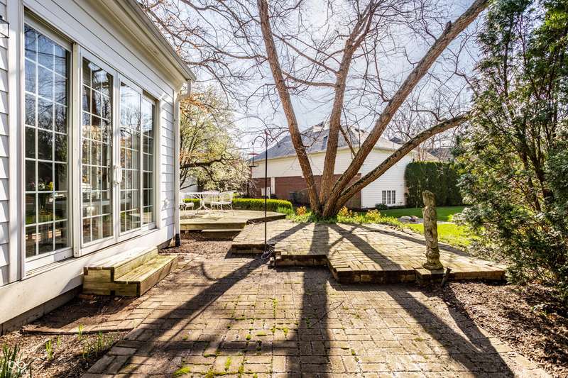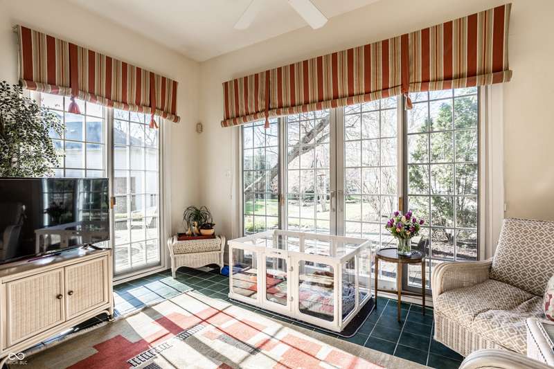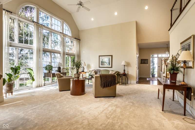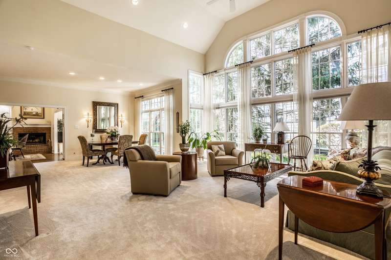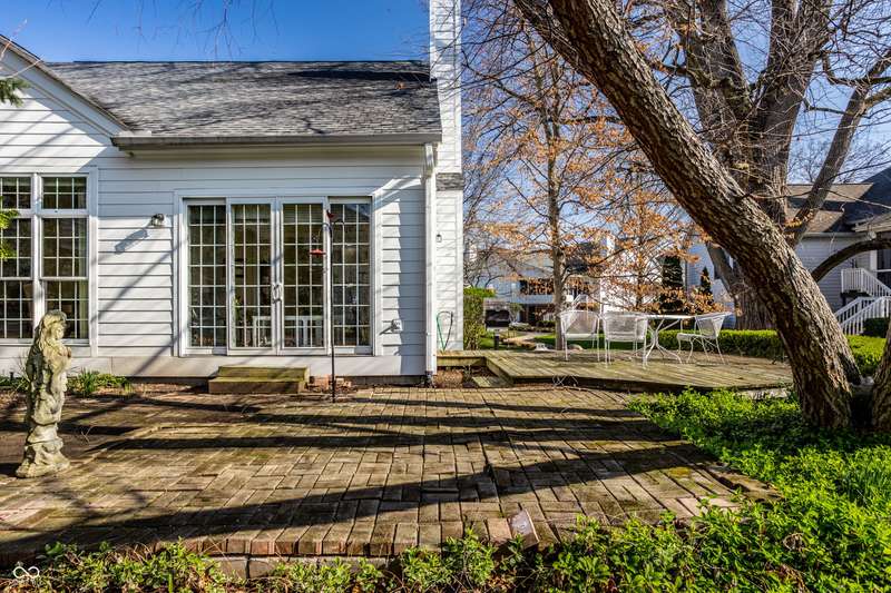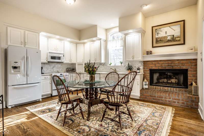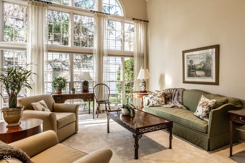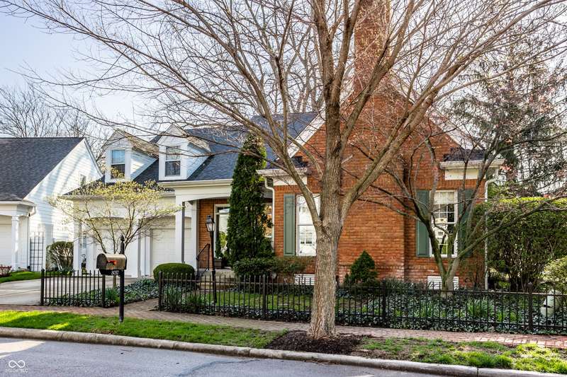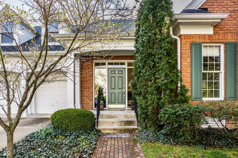 Tucked behind the gates of the sought-after Sycamore Springs community, 8037 Lynch Lane offers a blend of charm, comfort and low-maintenance living in one of Indianapolis' most desirable neighborhoods. Bathed in natural light, this freshly painted residence welcomes you with a grand two-story great room, where nearly floor-to-ceiling windows frame serene views and allow sunlight to pour in throughout the day. The inviting eat-in kitchen, complete with a cozy fireplace-is the ideal setting for casual meals or evening conversation. Just off the kitchen, an inviting sunroom provides the perfect space for your morning coffee or quiet afternoon reading. The main floor primary bedroom offers a spacious retreat with a large walk-in closet and en-suite bathroom, including dual sinks, walk-in shower and a garden tub. The home library/den with built-in bookshelves and a second fireplace adds a cozy, versatile space that could be used as an additional bedroom with a closet. Upstairs, you'll find a private guest suite with its own full bath, ideal for friends and family. Step outside to the quaint backyard with a large patio area- ideal for entertaining or enjoying peaceful evenings at home. Siding recently replaced with Hardie plank. Residents of Sycamore Springs enjoy access to exclusive amenities including a clubhouse, pool, and fitness center, all just minutes from the luxury shopping and dining of Keystone at the Crossing. Assumable mortgage option.