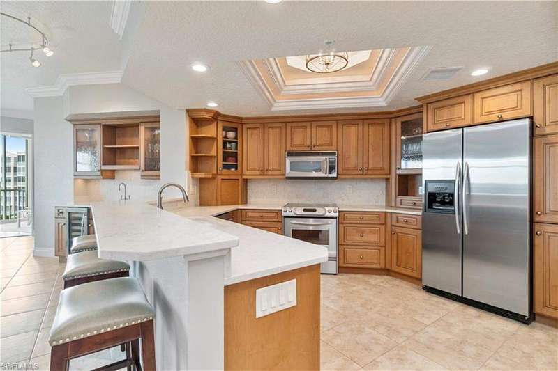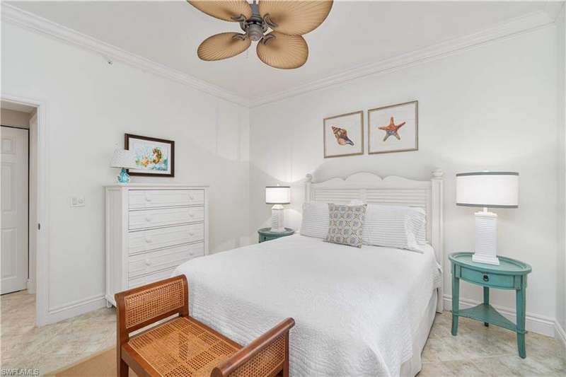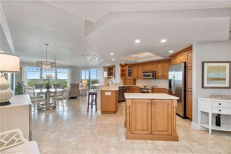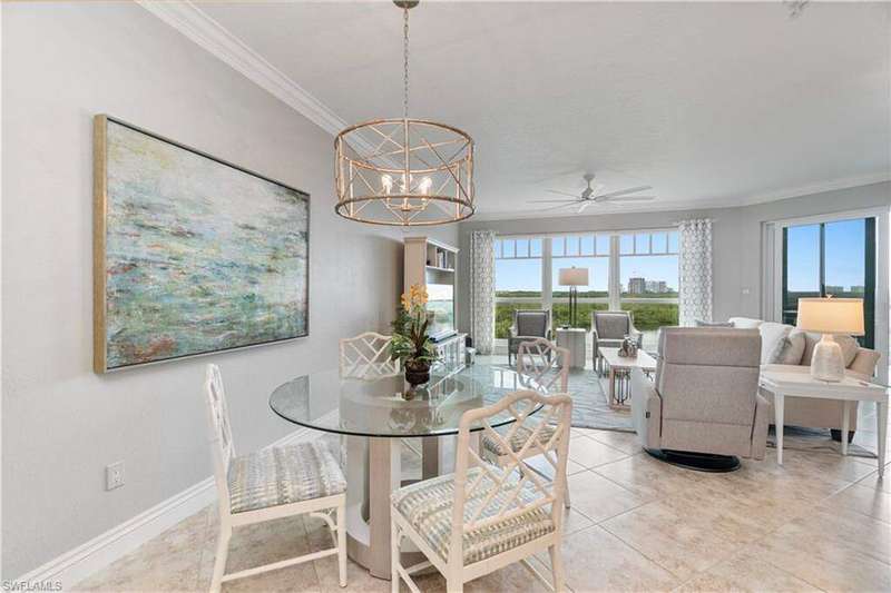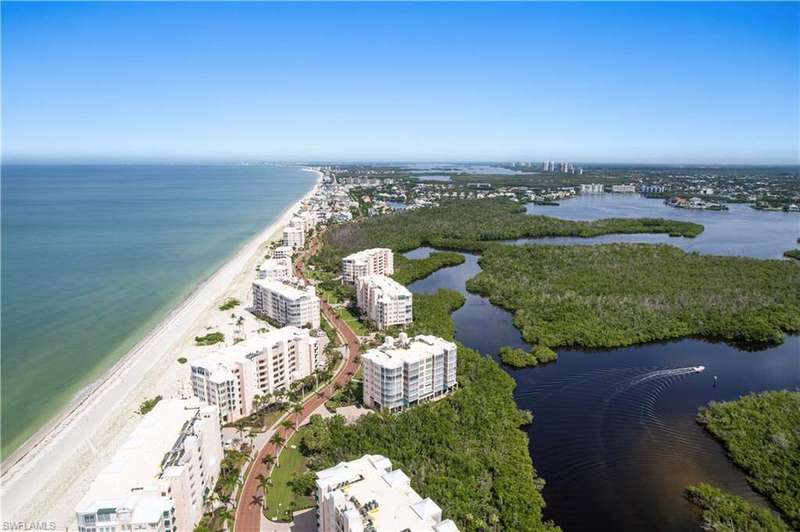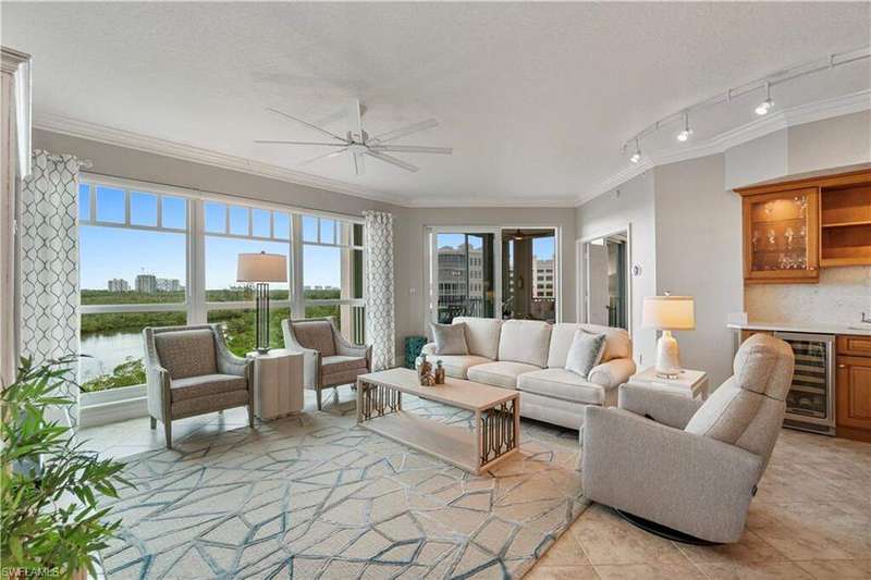 SKIP THE WAITLIST! THE CLUB AT BAREFOOT BEACH MEMBERSHIP AVAILABLE WITH THIS CONDO, SPECIFICALLY! A RARE & UNIQUE OPPORTUNITY! This beautifully updated 3 bedroom/2 bath unit has spectacular Bay views and is just steps from the white sands of Barefoot Beach. The spacious lanai is designed with both screens and glass sliders, allowing you to enjoy the fresh open air or transform the space into a sunroom-style retreat. Relax and unwind while watching boats sail by and dolphins, manatees, and ospreys enjoying the Bay waters. This stunning unit features a new roof on the building, new hurricane impact windows in the living room and sliding doors to the lanai (2022), an open floor plan with 2,102 sq ft under air, and tile flooring throughout. The chef's kitchen features custom wood cabinetry, quartz countertops, and a breakfast bar, while the adjacent wet bar with built-in wine fridge makes entertaining effortless. The primary suite offers sweeping Bay views and a spa-like bath with dual vanities, a walk-in shower, and generous storage. Additional upgrades include electric remote-controlled sun shades in the great room and lanai, along with an EV hookup at the assigned parking space. Nearby to the BRAND-NEW CLUBHOUSE with state-of-the-art fitness center & resort-style pool. Barefoot Beach residents enjoy 3 miles of beach, 2 pools/spas, manned/gated entry & on-site mgmt. OPTIONAL "Club at Barefoot" offers tennis, 2 restaurants & beachside food/bev/chair service. Excellent Collier County location minutes to Mercato, Waterside & easy access to RSW Airport.