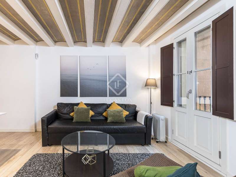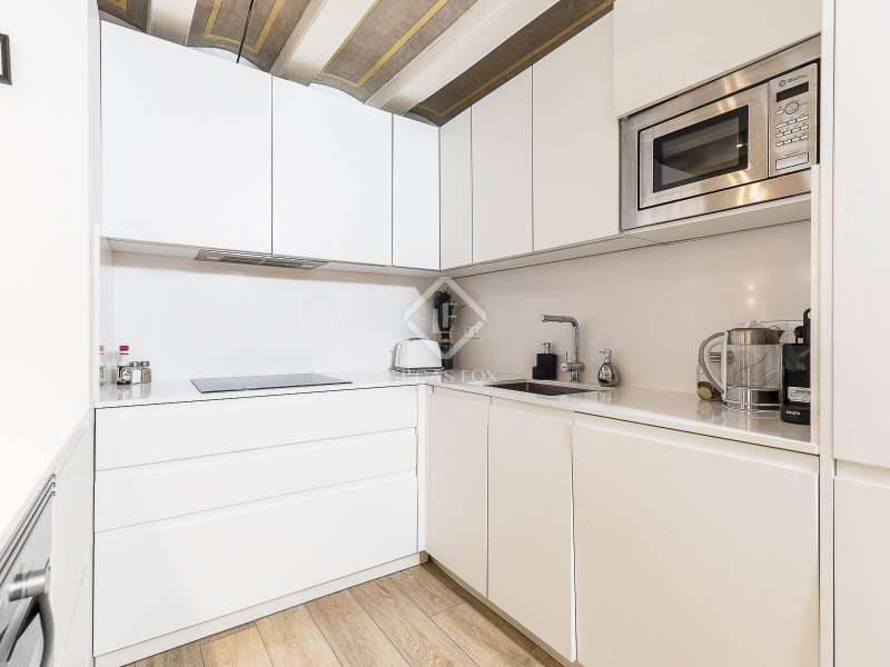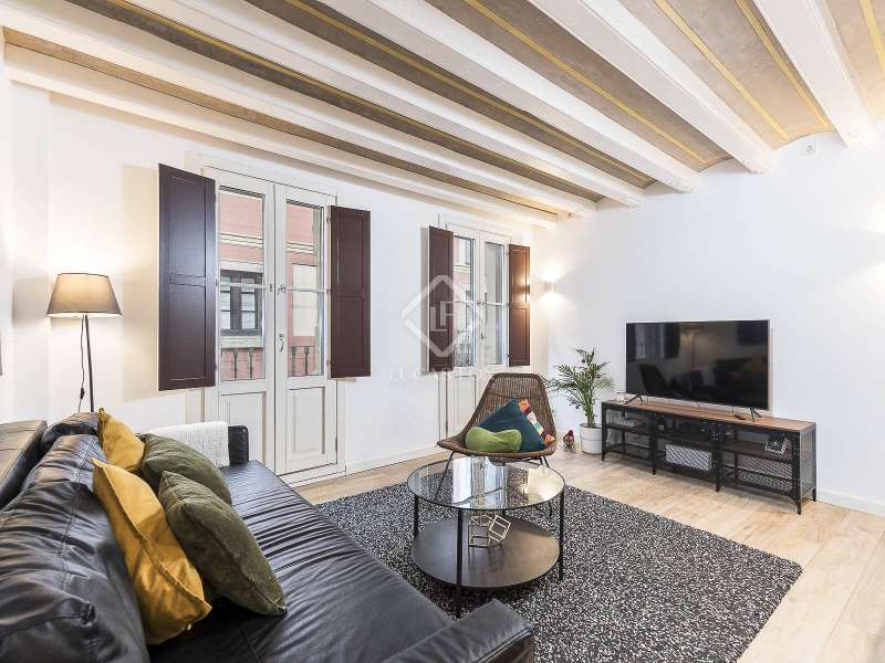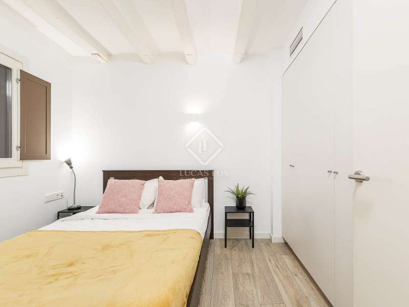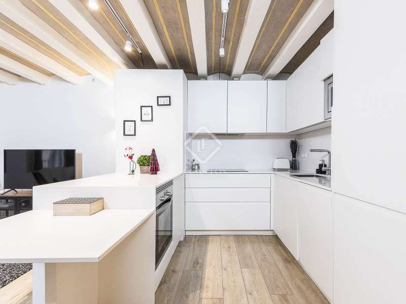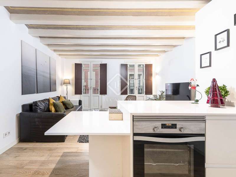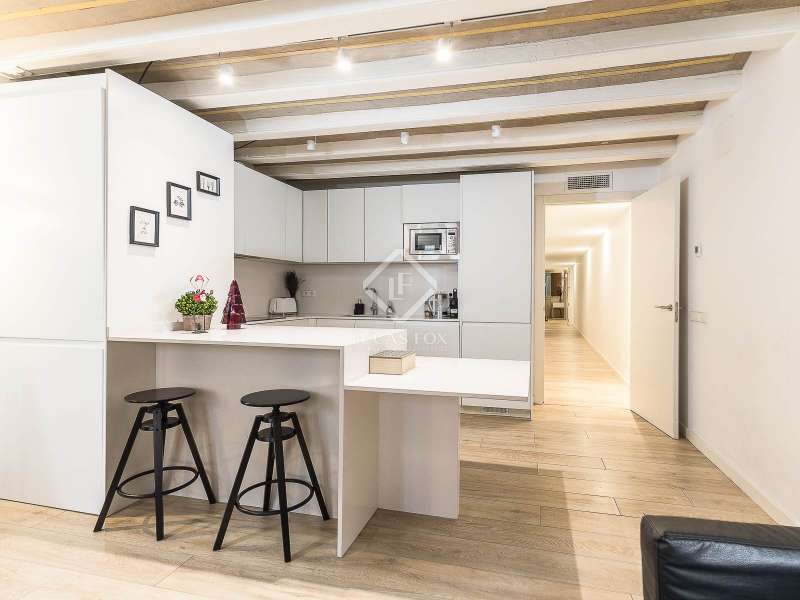 This charming apartment offers two double bedrooms and two complete bathrooms, as well as a breathtaking open-plan kitchen and living area with direct access to the balcony. The apartment was meticulously renovated just a couple of years ago with excellent taste and in neutral colours, while preserving the historical features, such as Catalan vaulted ceilings and wooden beams. These features provide a touch of history along with the contemporary minimalistic design. Being situated on one of the highest floors of the building offers light in the living and dining area as well as a complete tranquility. The building dates back to 1900 and offers only a few apartments, therefore, providing great privacy as there is only 1 apartment per floor. The large, modern lift leads us almost directly to the apartment with a key. Alternatively, the apartment may also be accessed via the stairs. This simple yet modern apartment offers all necessities, such as air conditioning and heating via ducts, equipped kitchen with dishwasher, as well as washer and dryer, all meticulously incorporated in the built-in cupboards. Being chic and modern, this beautiful apartment may be an excellent fit for individuals, couples and even for investors.