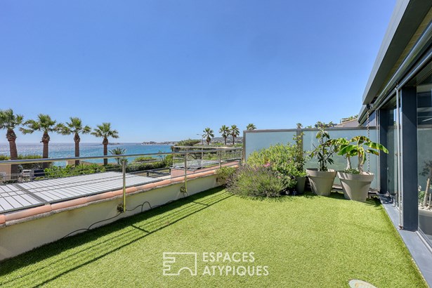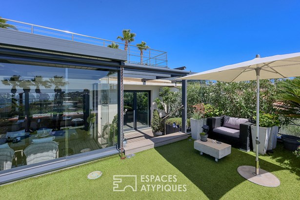 The apartment offers two comfortable bedrooms, a shower room, a bathroom, and a south-facing master suite with direct access to the terrace, providing a privileged relaxing setting facing the sea. The landscaped terrace becomes a real additional living space when the weather is nice. The bioclimatic loggia ensures optimal comfort in all seasons.