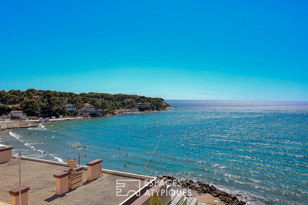 In Sanary-sur-Mer, facing the beaches, this contemporary 112 sqm apartment (98 sqm Carrez law) is nestled within a luxury residence built in 2011. Designed for outdoor living, it features a vast 60 sqm terrace with a bioclimatic loggia and offers panoramic sea views over the region's most beautiful bay.