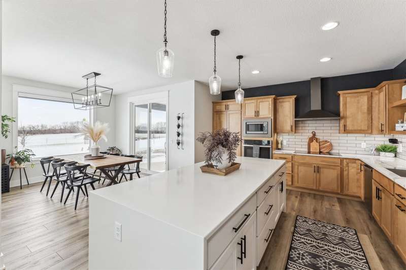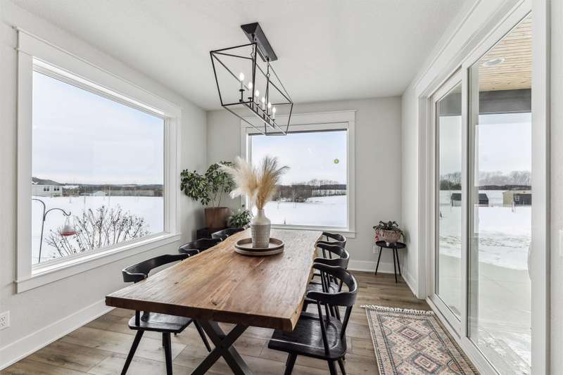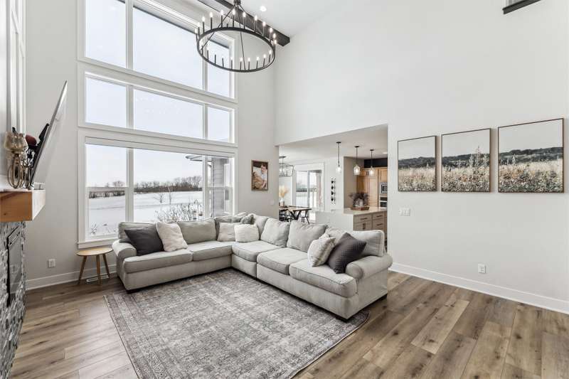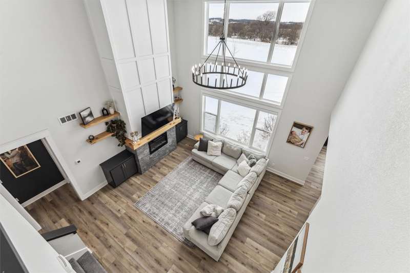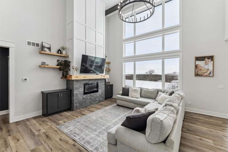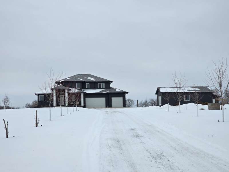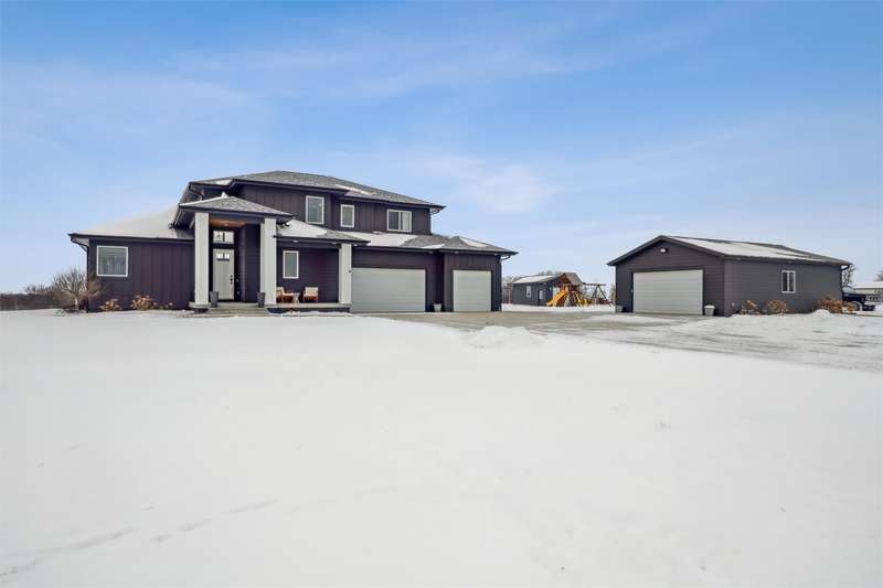 Nestled on 5 acres, this stunning 1.5-story home spans nearly 3,800 sq. ft. of meticulously crafted living space. The grand 2-story great room features floor-to-ceiling windows, flooding the space with natural light and showcasing breathtaking countryside views. A cozy fireplace adds warmth, while the gourmet kitchen flows into a charming dining area. The main level includes a luxurious master suite, mudroom, and first-floor laundry. Upstairs offers a cozy sitting area, two spacious bedrooms, and a beautifully designed bathroom. The finished lower level is an entertainer's dream with a wet bar, recreation area, bedroom, full bath, and office. The 3-car heated detached garage, 1-car detached garage, and 3-car attached garage provide ample space for vehicles and storage. This home boasts flawless finishes and exceptional attention to detail, reflecting pride of ownership. Located in a tranquil setting with easy access to nearby amenities, this property offers a perfect blend of seclusion and convenience.